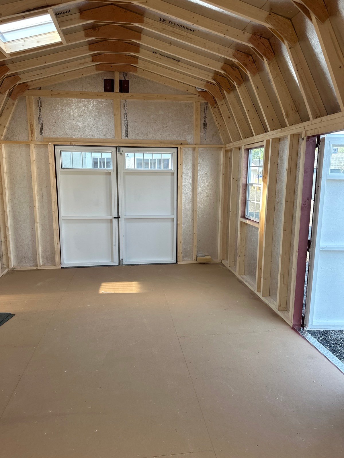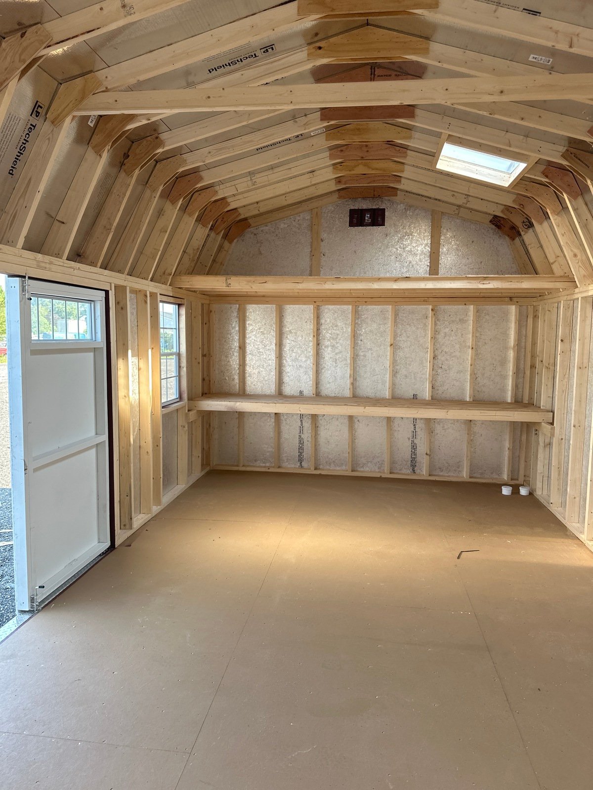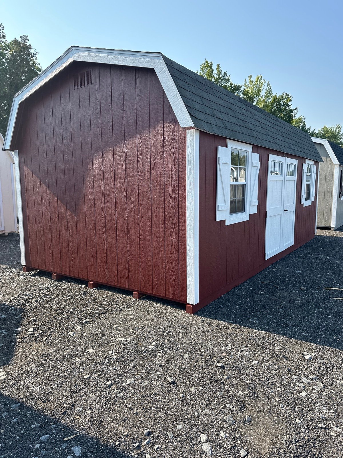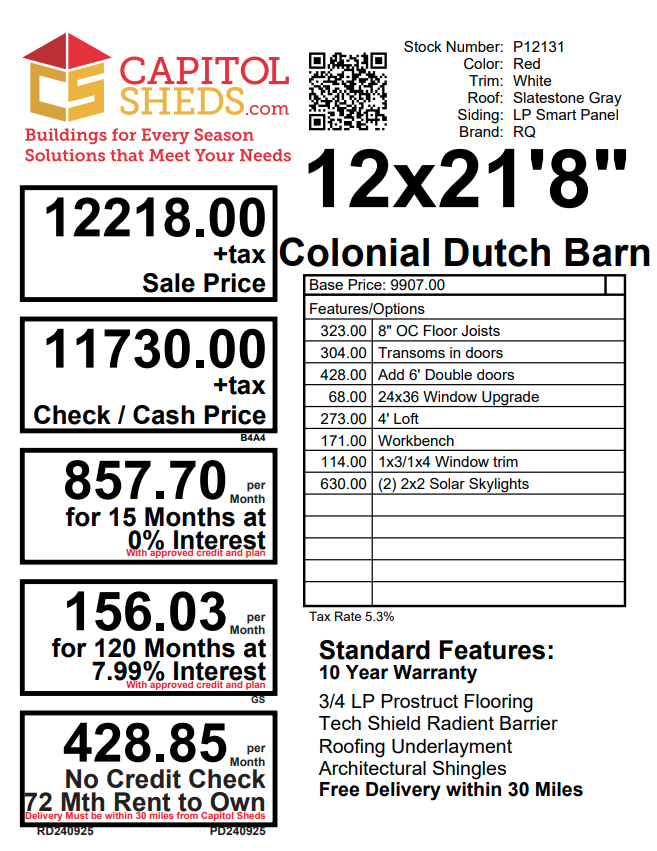 This Amish-built Colonial Dutch Barn-style shed is a stunning combination of craftsmanship and practicality. Measuring 12×21’8″, it features Red LP Smart Panel siding with crisp white trim and a durable Slatestone Gray roof of dimensional shingles with roof felt underlayment. The structure is framed with 2×4 studs and rafters spaced 16 inches on center, ensuring strength and durability. Inside, you’ll find LP Prostruct flooring supported by pressure-treated 2×4 joists upgraded to 8 inches on center. With two 24″x36″ windows, four doors with transom windows, a 4-foot loft, solar skylights, and 16-inch shelving, this shed is both stylish and functional.