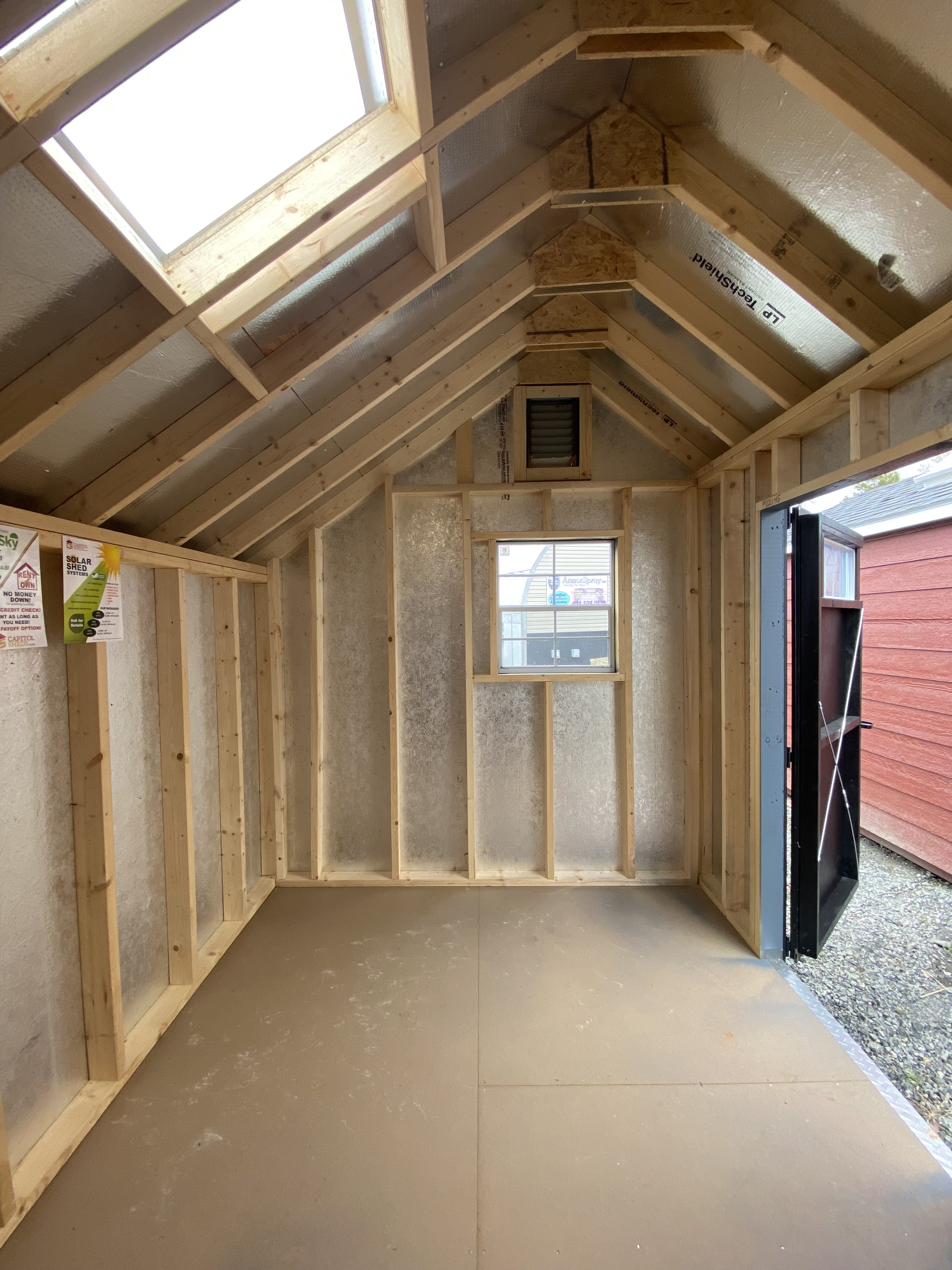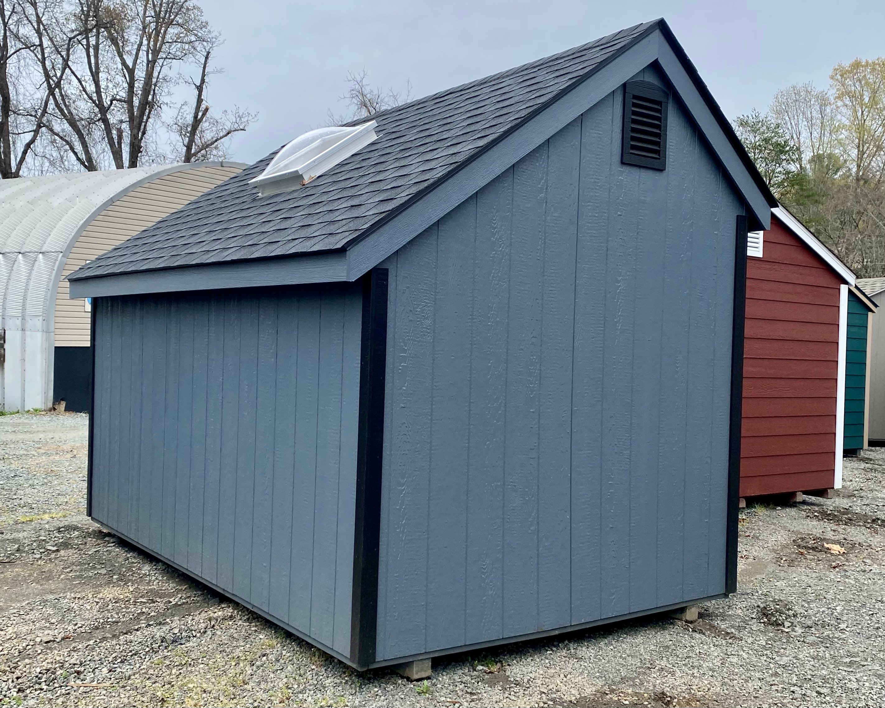 This 8×12 Salt Box shed offers distinctive charm with its extended rear roofline and bold color combination. Finished in Dark Gray LP Smart Panel siding with black trim and a charcoal architectural shingle roof, it delivers a modern yet classic appearance. Built with 2×4 wall studs and rafters spaced 16 inches on center, LP Tech Shield roof sheeting, and LP T&G Prostruct flooring supported by pressure-treated 2×4 floor joists 12 inches on center, it’s made for durability. Upgrades include two garden vents, a skylight, an 8ft workbench, decorative flower boxes, and a transom window in the door for added natural light and style.