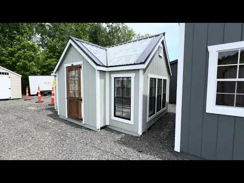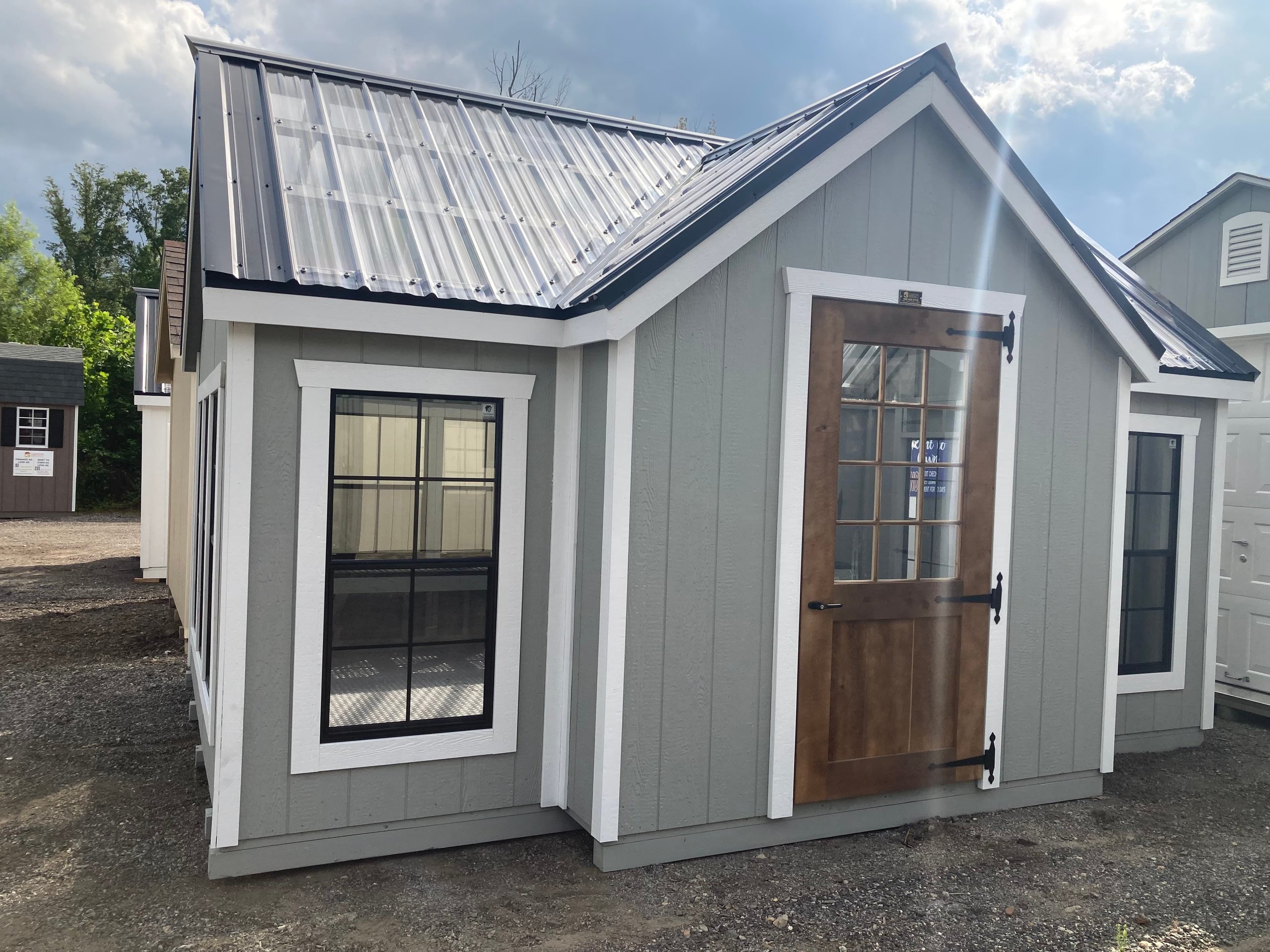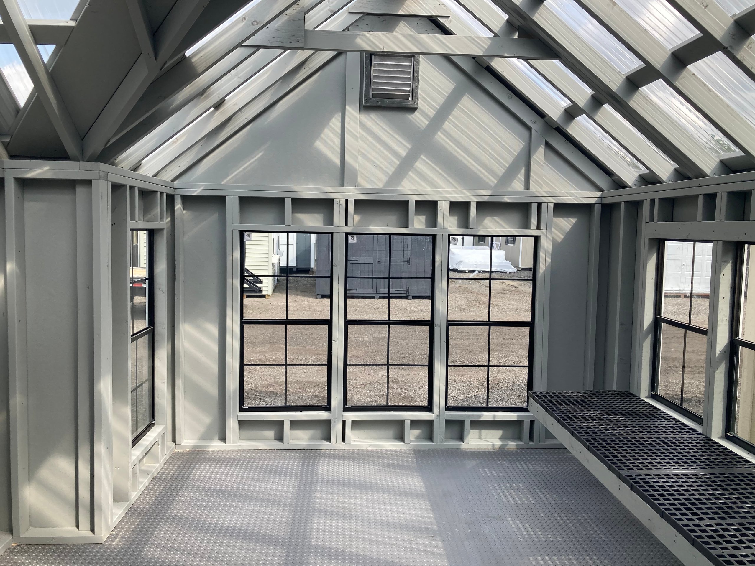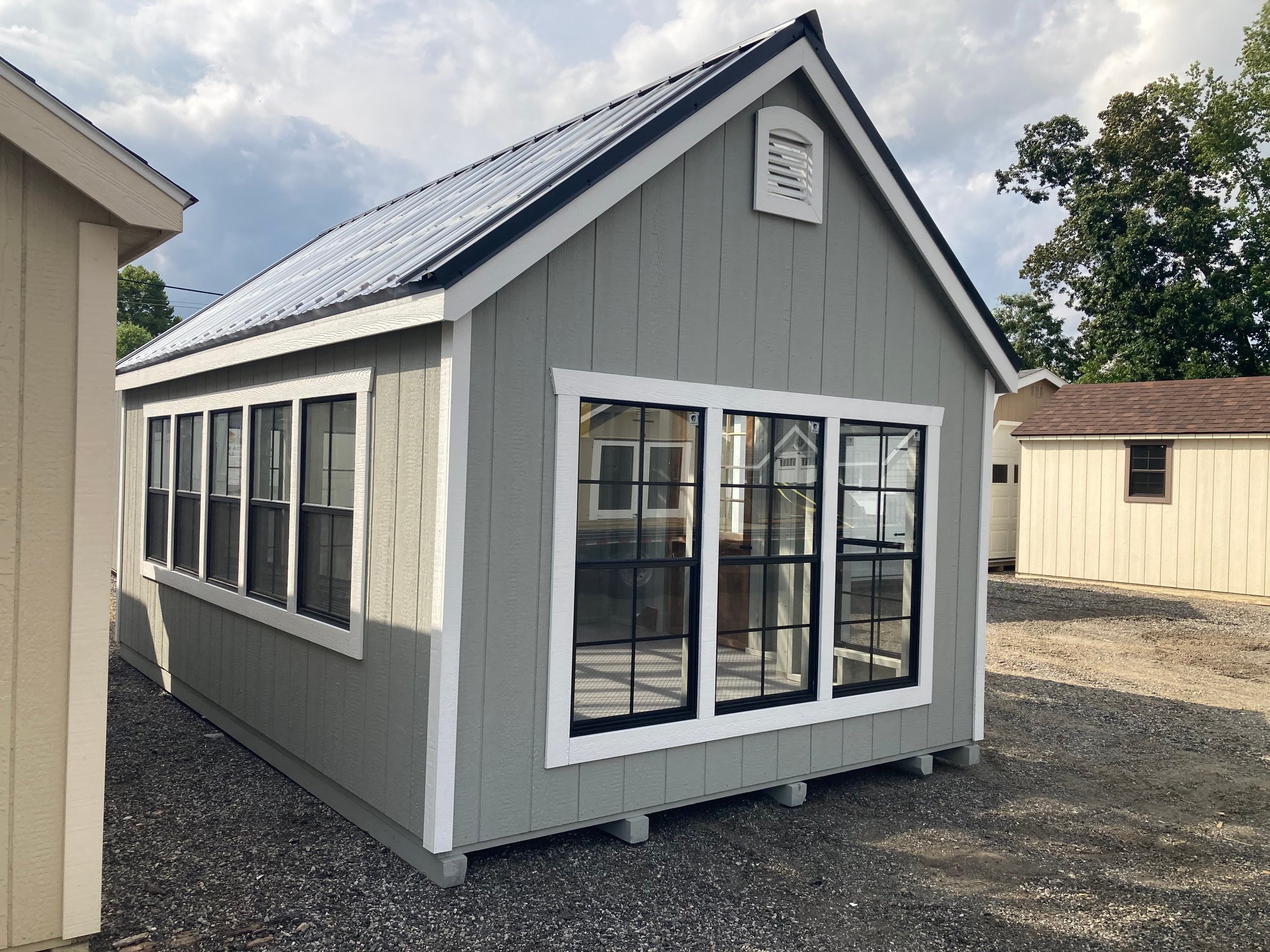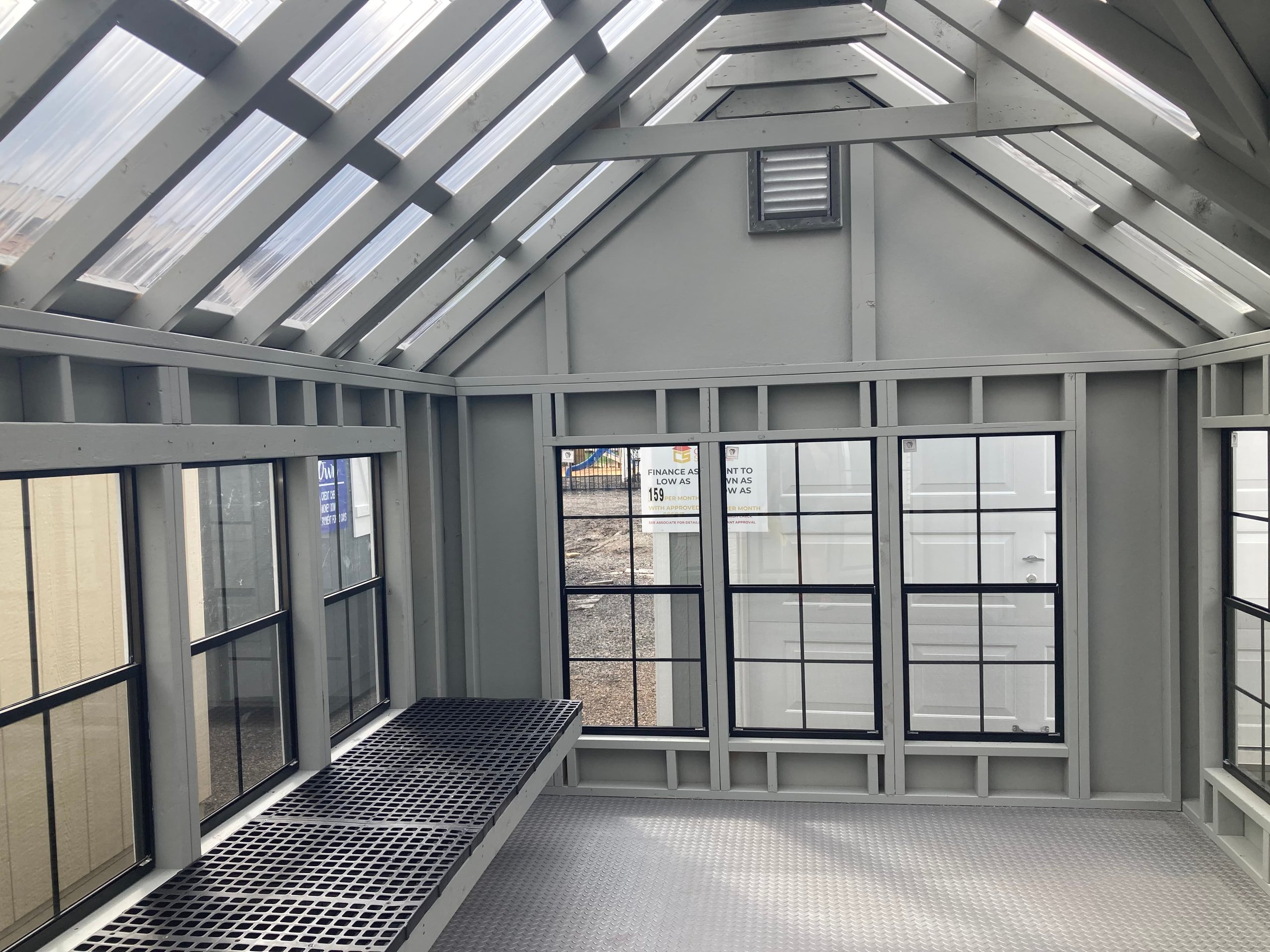 Transform your backyard with our Amish-built Victorian A-frame storage shed. Measuring 10×16, this elegant shed features LP Smart Panel siding in light gray with white trim and a clear metal roof. With 13 windows and a single upgraded pine door, the interior is flooded with natural light. It boasts sturdy 2×4 wall and roof framing, pressure-treated floor joists, and a durable LuxGuard rubber floor. Upgrades include wood sash door windows, a bumpout peak dormer, window trim, a painted interior, and a 12’ workbench with greenhouse plastic. This shed combines craftsmanship with functionality, making it a perfect addition to your property.