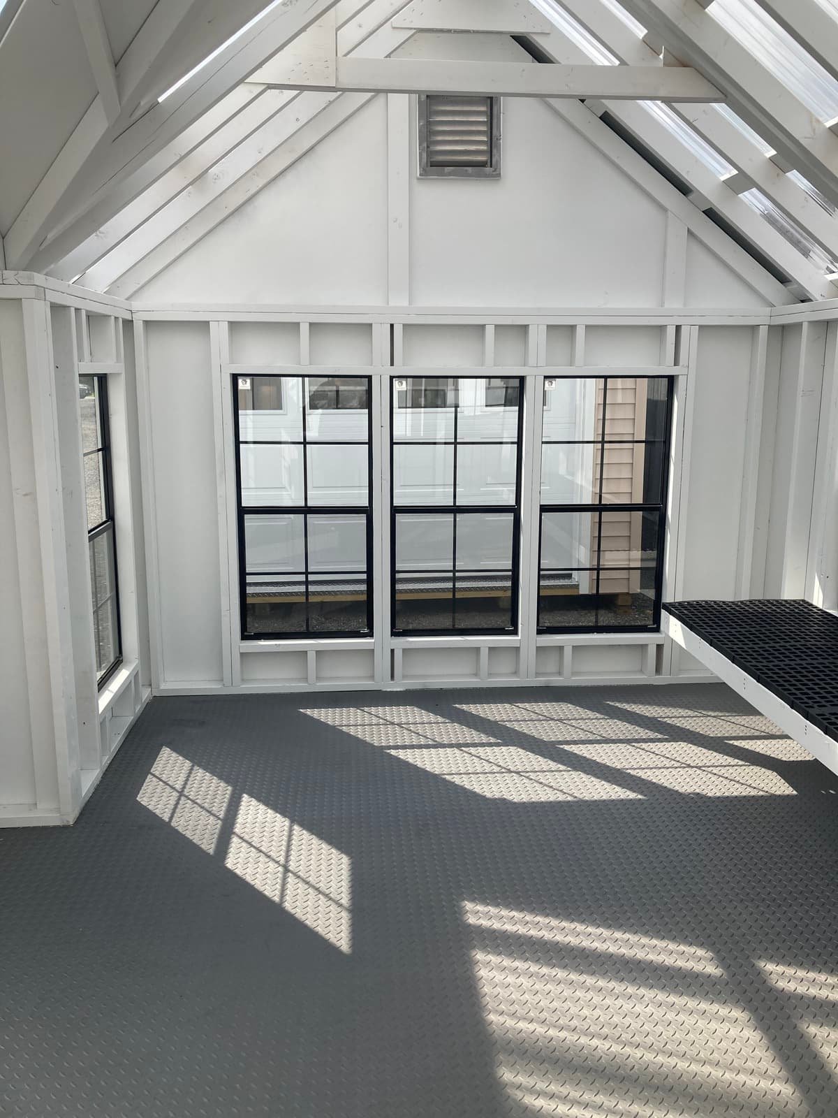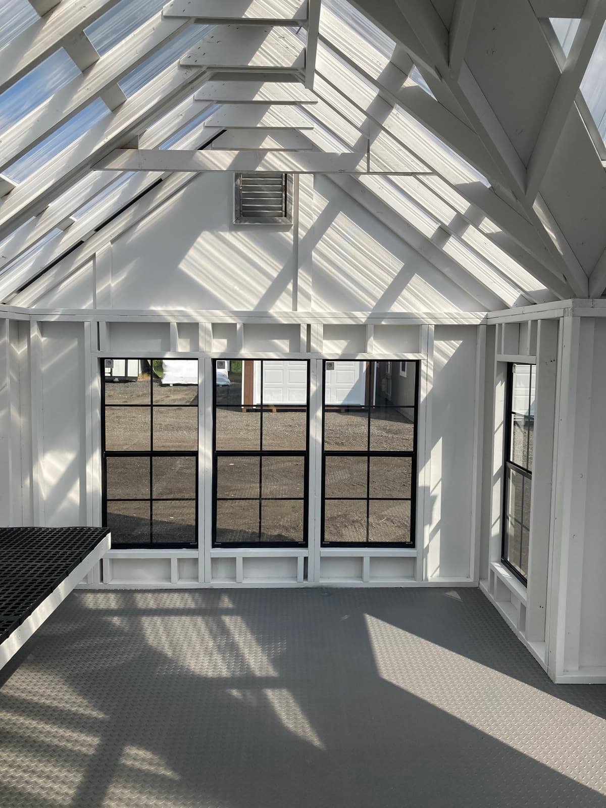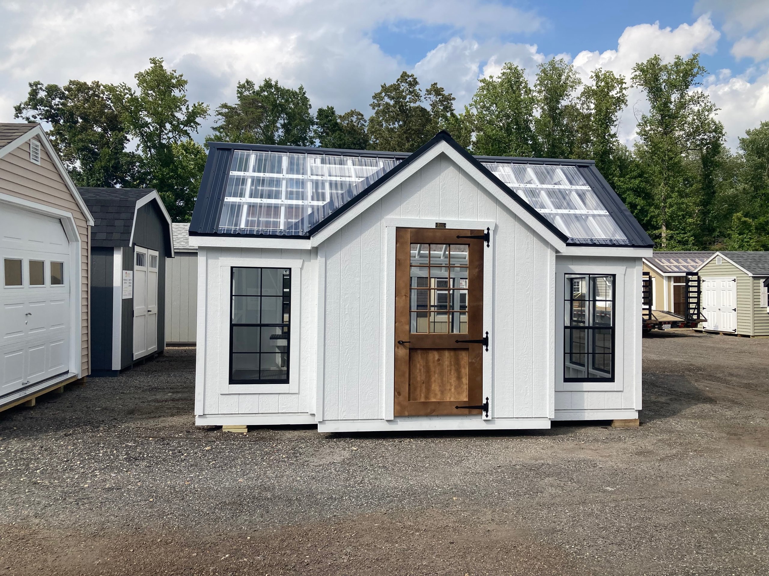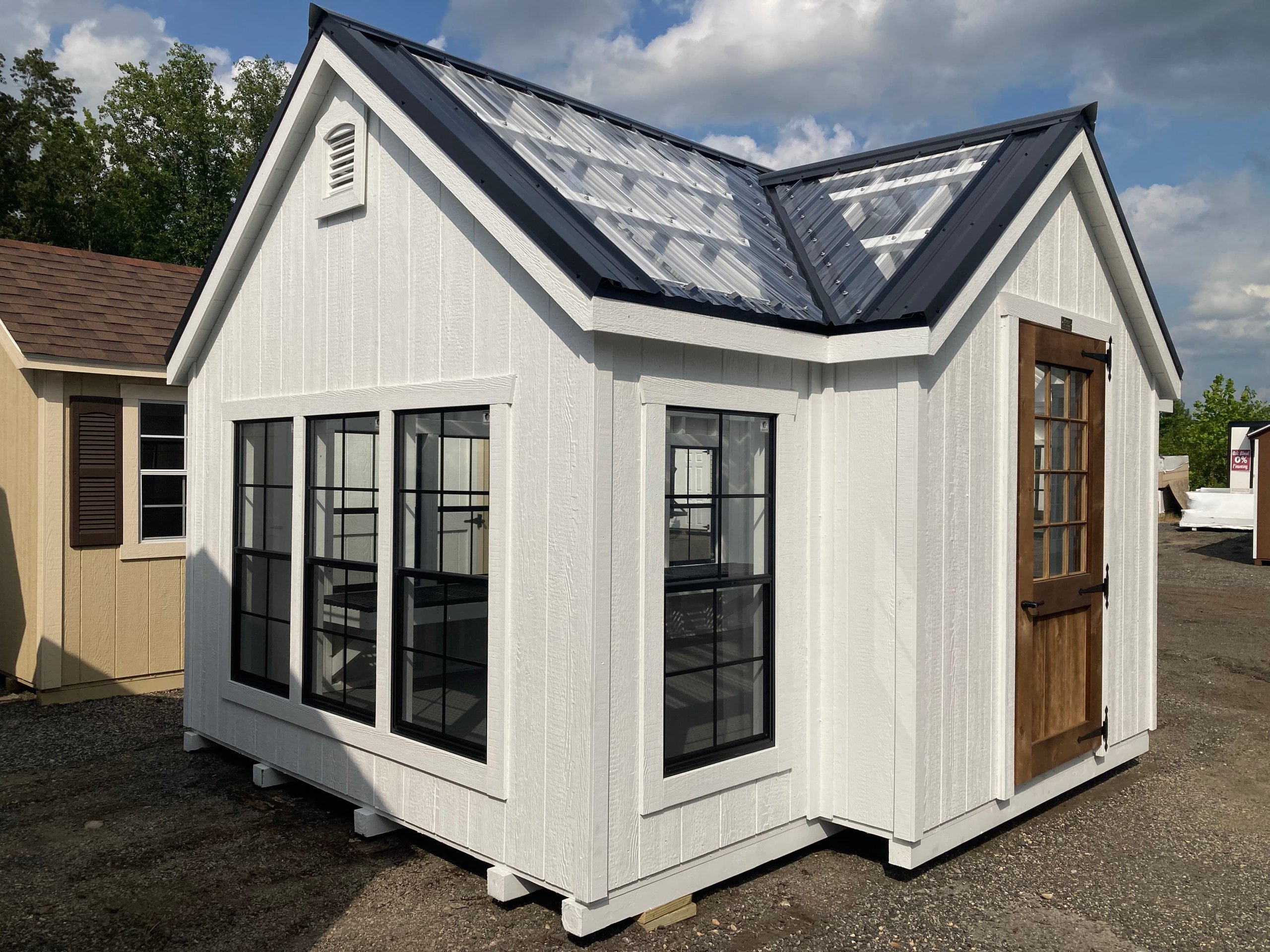 Transform your backyard with our Amish-built Victorian A-frame storage shed. Measuring 10×16, this elegant shed features LP Smart Panel siding in white, with white trim and a clear metal roof. With 13 windows and a single upgraded pine door, the interior is flooded with natural light. It boasts sturdy 2×4 wall and roof framing, pressure-treated floor joists, and a durable LuxGuard rubber floor. Upgrades include wood sash door windows, a bumpout peak dormer, window trim, a painted interior, and a 12’ workbench with greenhouse plastic. This shed combines craftsmanship with functionality, making it a perfect addition to your property.