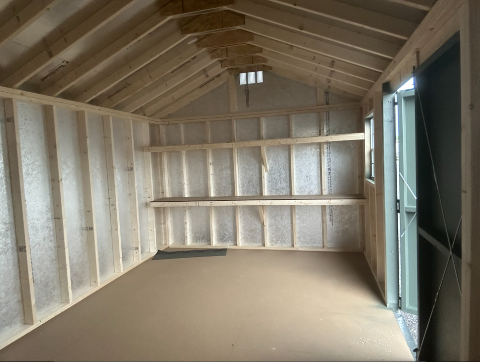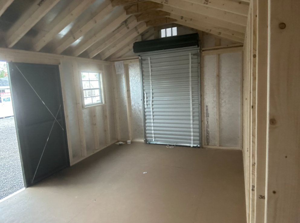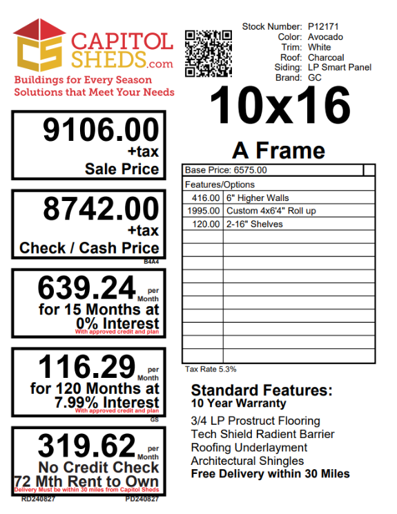 This 10×16 A-Frame shed is designed for style, durability, and functionality. Constructed with LP Smart Panel siding in Avocado and accented with crisp white trim, it features a Charcoal roof with architectural shingles and LP Tech Shield underlayment for superior weather resistance. The single door and 4×6’4″ Roll up door allows easy access, while two windows provide natural light. Built with 2×4 framing, pressure-treated joists, and 3/4-inch LP Prostruct flooring, this shed delivers long-lasting strength and versatility—ideal for storing tools, equipment, or creating a functional workspace.