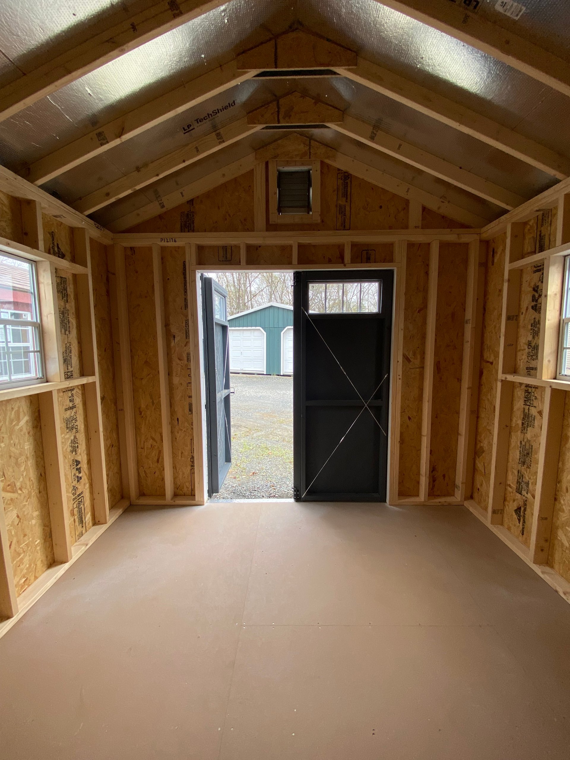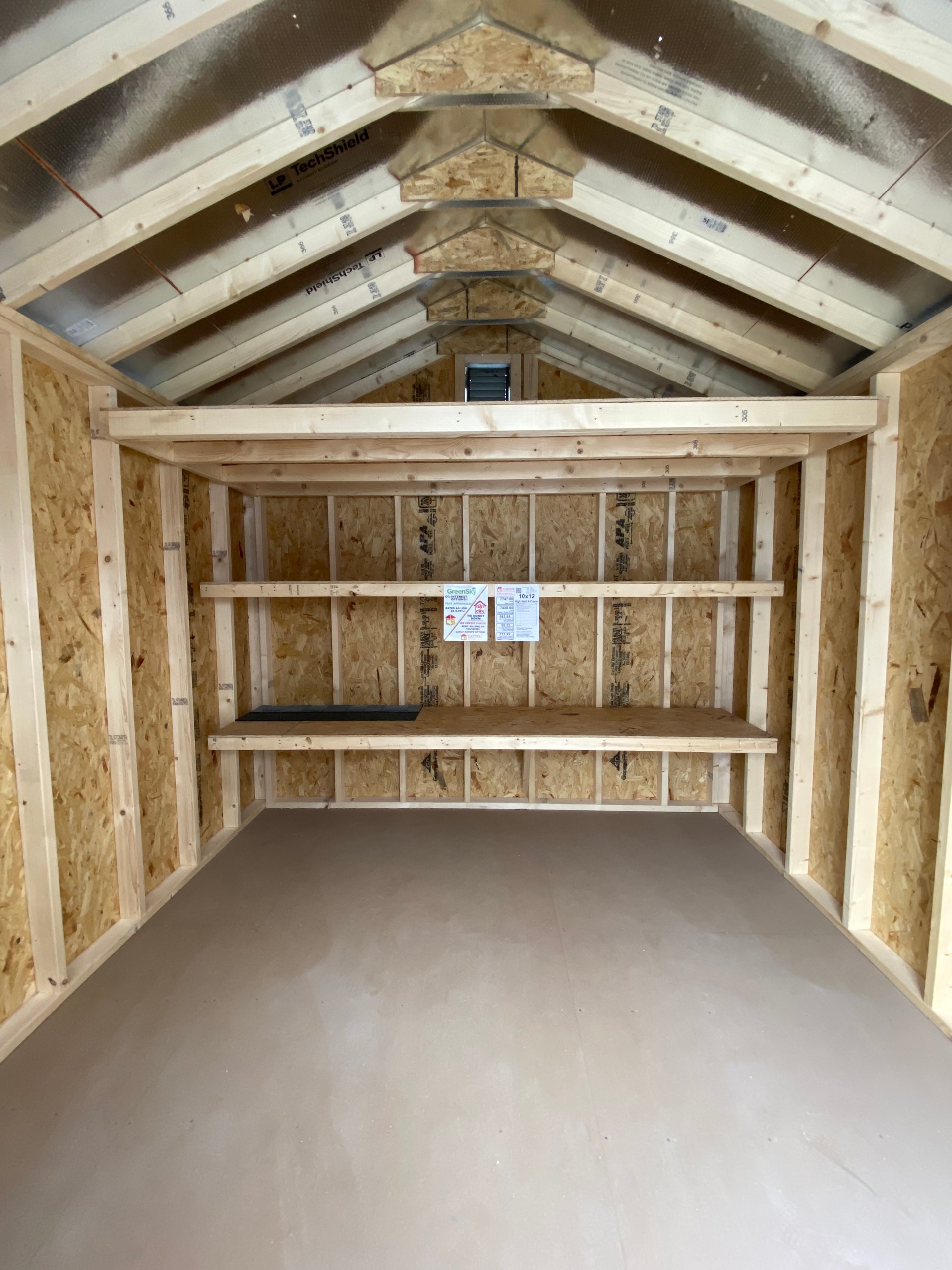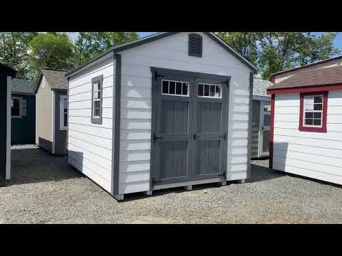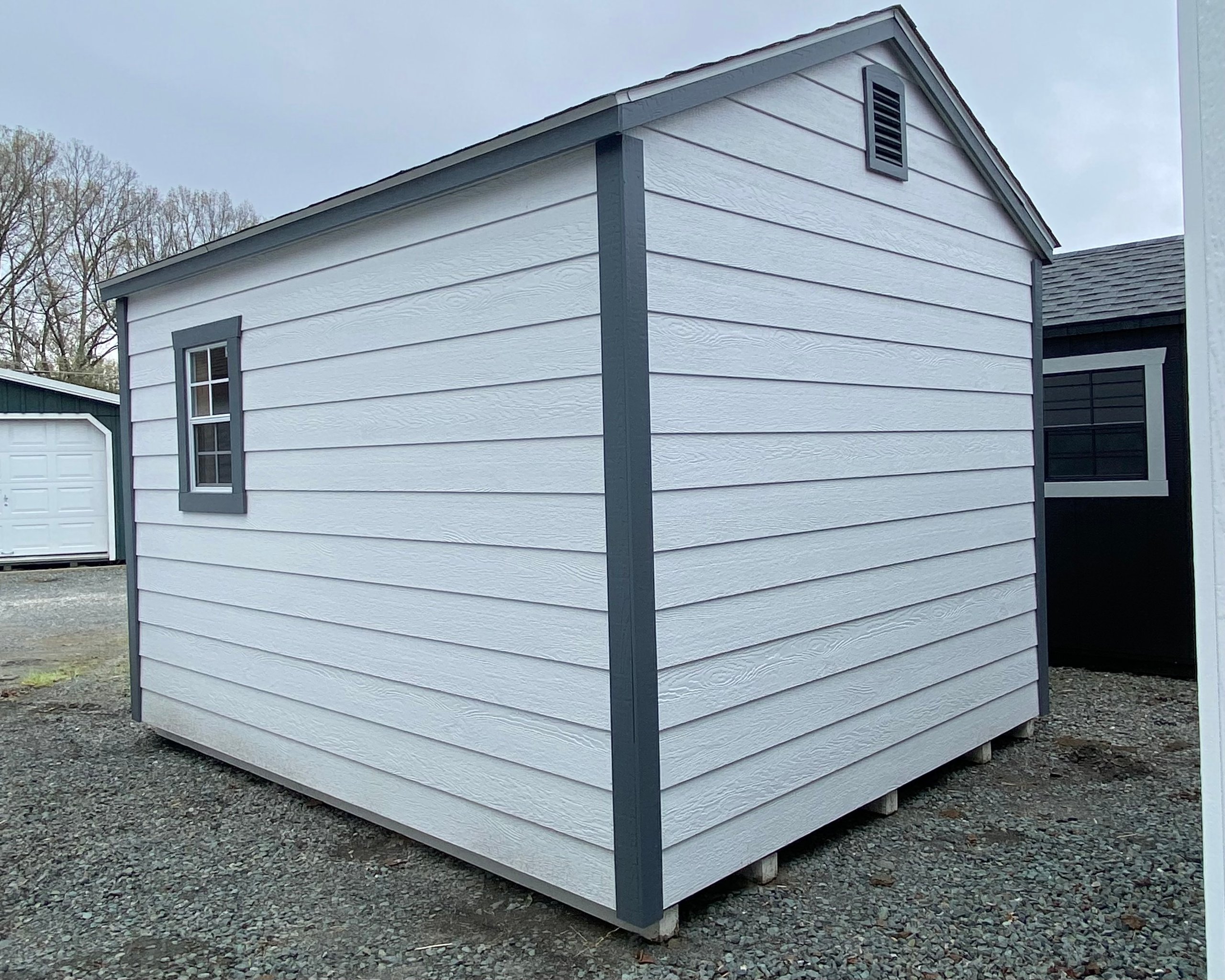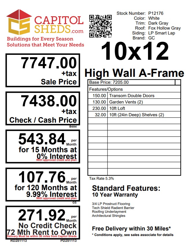 This 10×12 High Wall A-Frame shed offers exceptional style and functionality with crisp White LP Smart Lap siding accented by bold Dark Gray trim. Topped with Fox Hollow Gray shingles, it’s built with 2×4 framing and LP Tech Shield roof sheeting for lasting durability. The elevated wall height adds interior space, enhanced by a built-in loft and shelves for organized storage. Transom windows in the double doors and two additional windows bring in natural light, while garden vents improve airflow. Whether for tools, hobbies, or extra space, this Amish-crafted shed blends performance, charm, and modern design.