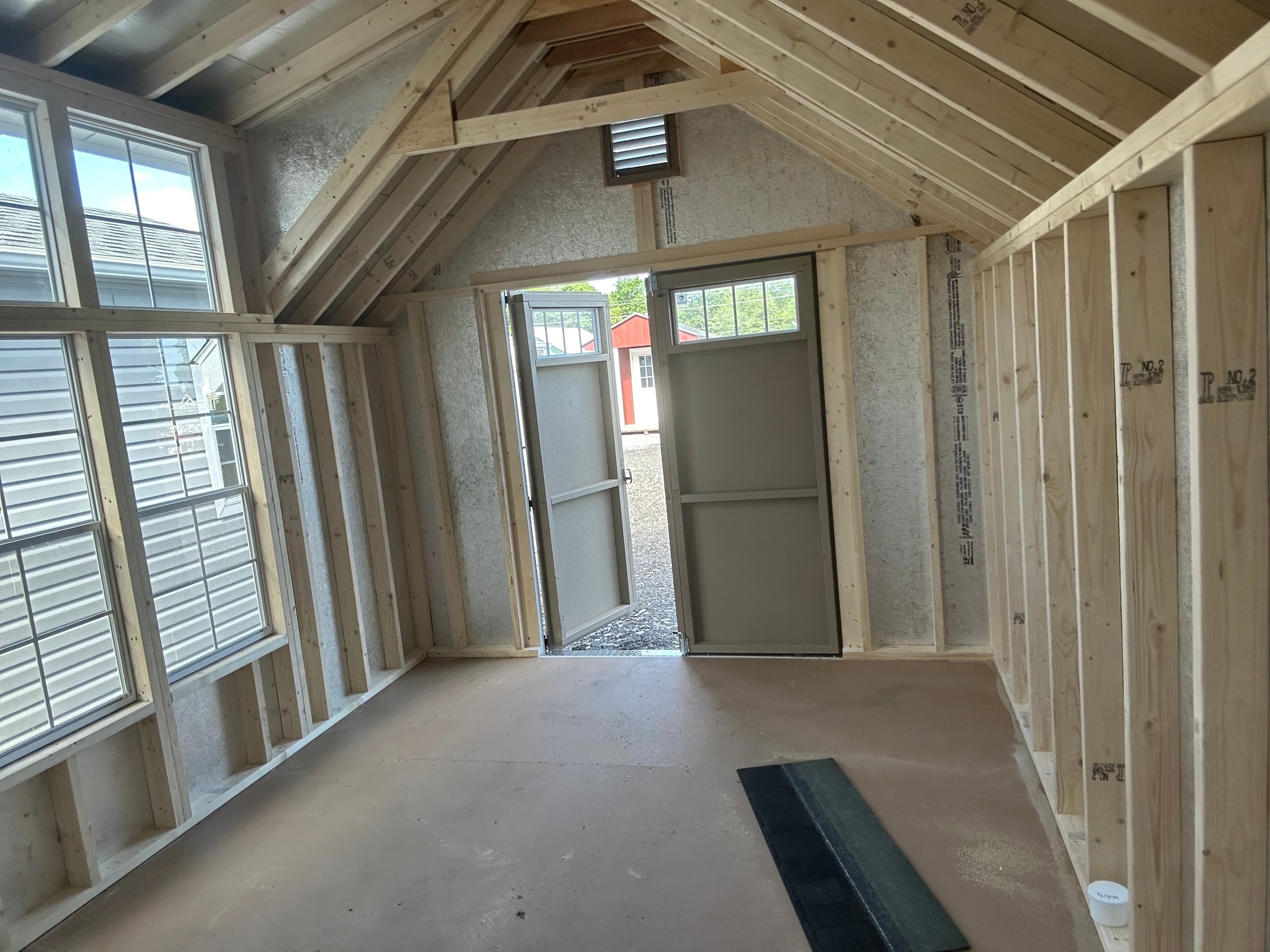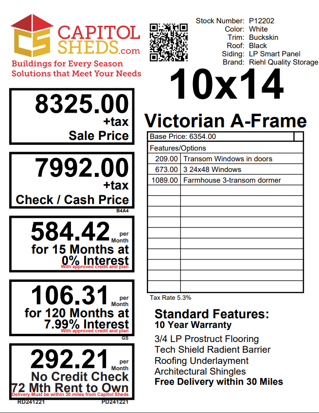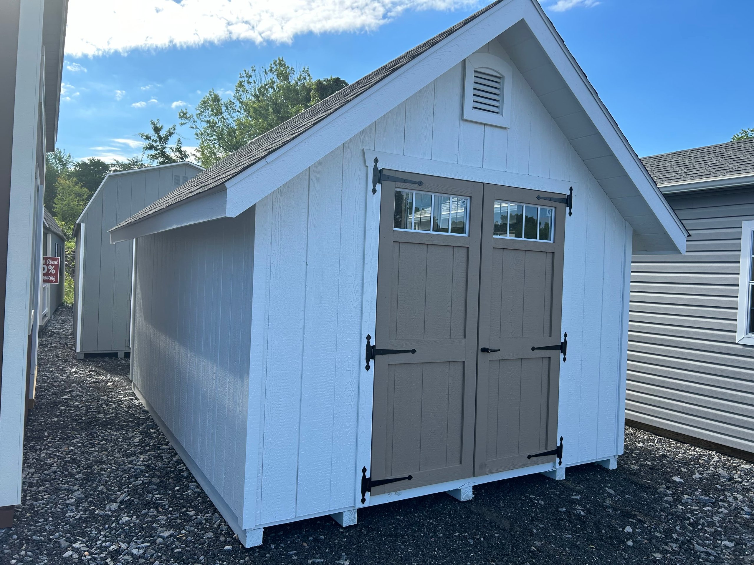 Enhance your outdoor space with this stunning 10×14 A-Frame Amish-built storage shed. Crafted with durable Smart Panel siding, this white shed, complete with a black dimensional shingles roof, combines classic charm with modern resilience. Featuring five windows and one door, it’s designed for natural light and easy access. With robust 2×4 studs and rafters 16 inches on center, LP Tech Shield roof sheeting, and LP Prostruct flooring supported by pressure-treated joists, this shed ensures lasting strength and stability. Perfect for all your storage needs, it’s an elegant, practical addition to any property.