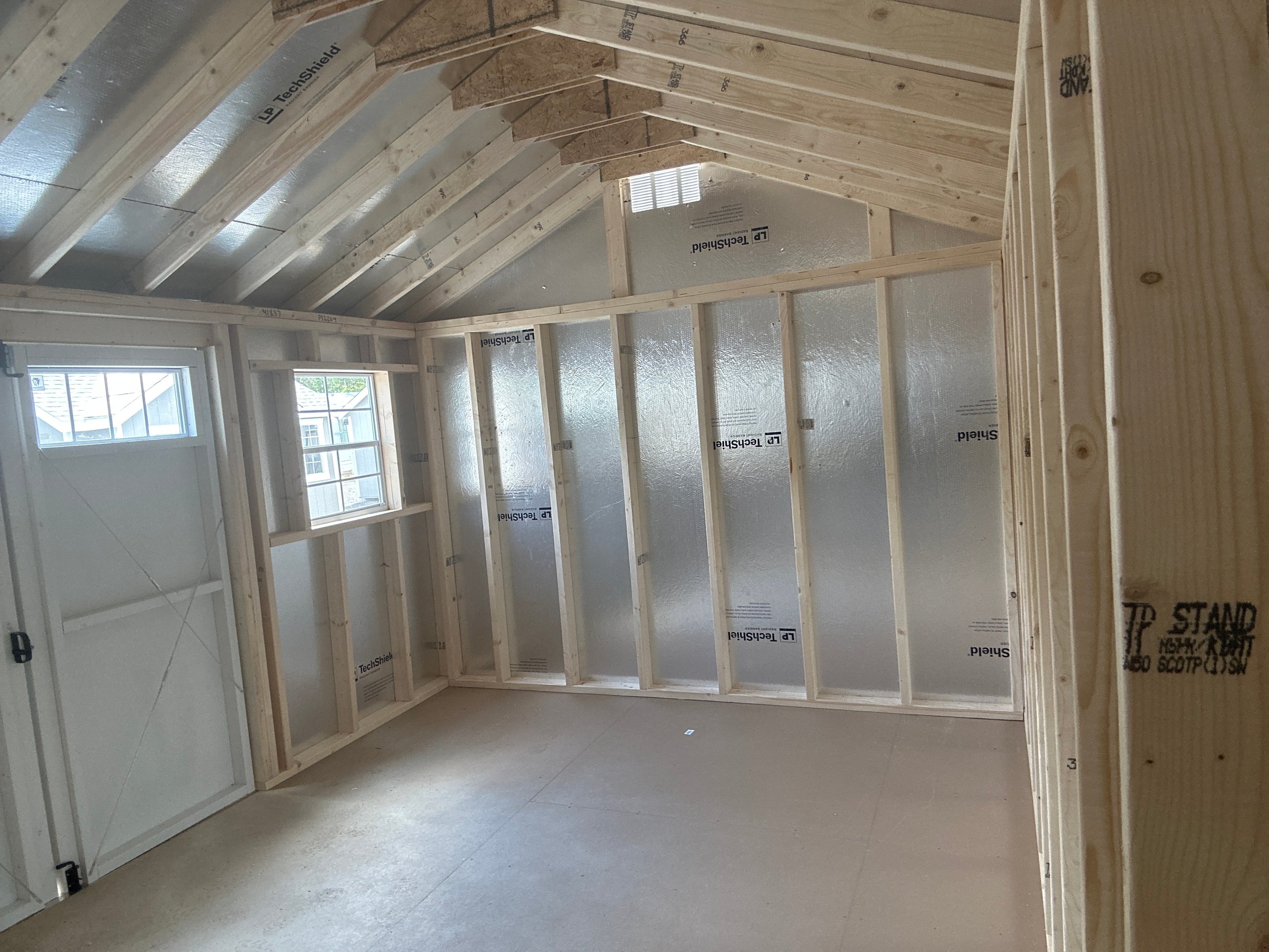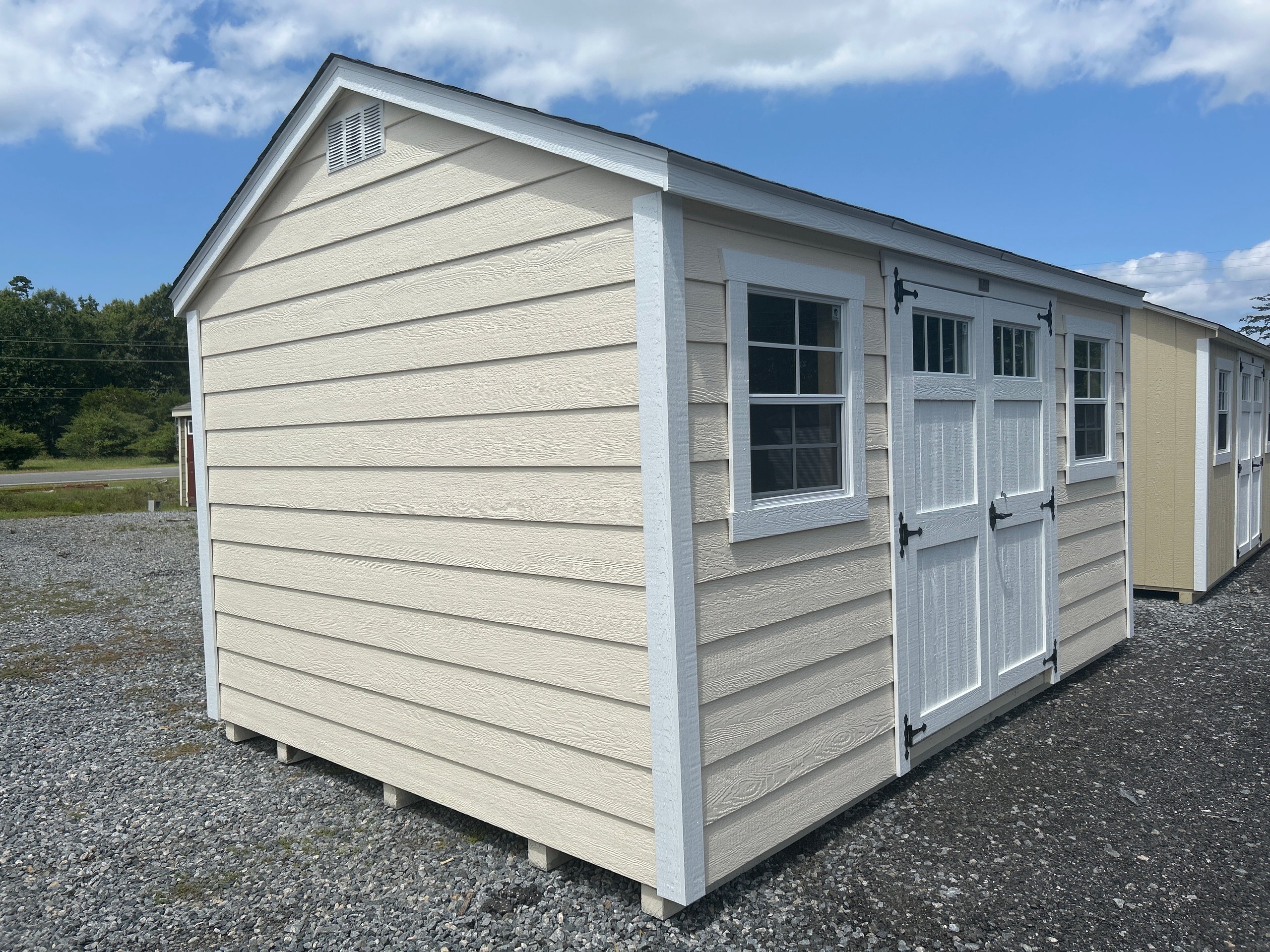 Introducing the Traditional A-Frame -A masterpiece of craftmanship by the Amish artisans. This 10×14 A-Frame is built to endure, offering exceptional quality and functionality for all your storage needs. The A-Frame siding provides superior durability while exuding timeless elegance in Navajo, complemented by pristine White. The Pewter Gray colored dimensional shingles protect your belongings from the elements ensuring long-lasting reliability. With 2-doors for easy access, the interior boasts 2×4 stud wall framing, 2×4 rafter roof framing, and LP Tech Shield roof sheeting for added strength. The LP Prostruct Flooring, coupled with pressure-treated 2×4 floor joists ensures stability and longevity. invest in the A-Frame for a storage solution that’s built to last.