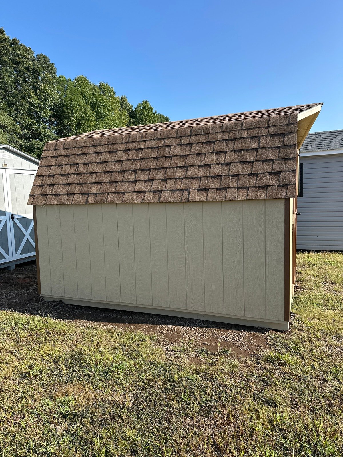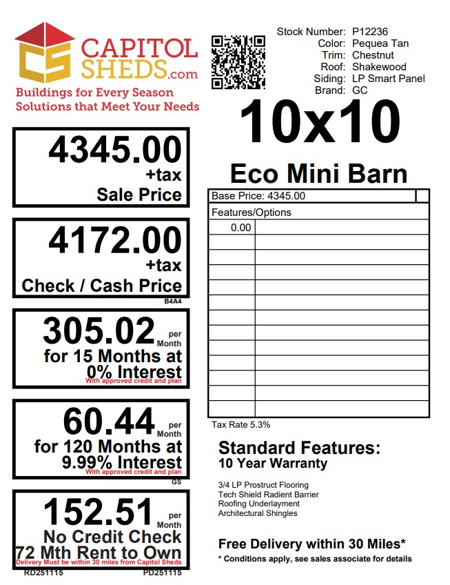 Maximize your outdoor space with our Amish-built Economy Barn Storage Shed. Measuring 10×10, this durable shed features LP Smart Panel siding in a classic tan color, complemented by chestnut trim and a stylish brown roof. Crafted with wall and roof framing, it ensures lasting strength and stability. The LP Prostruct flooring and pressure-treated joists provide a solid foundation for all your storage needs. With double doors for easy access and no windows for added security, this shed is the perfect blend of practicality and charm. Elevate your storage solutions today!