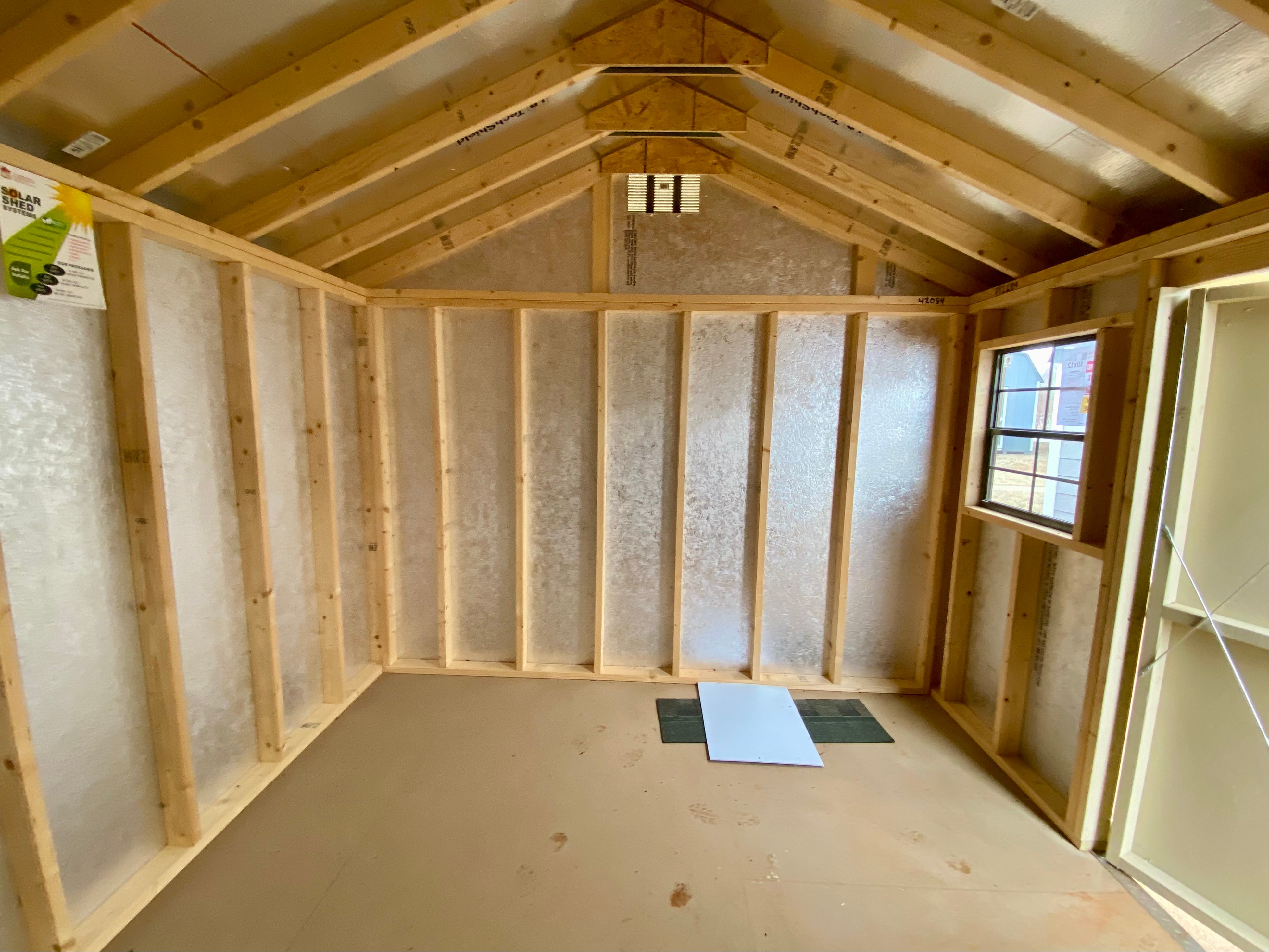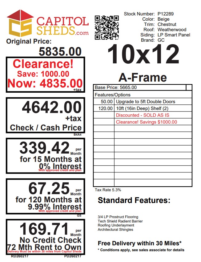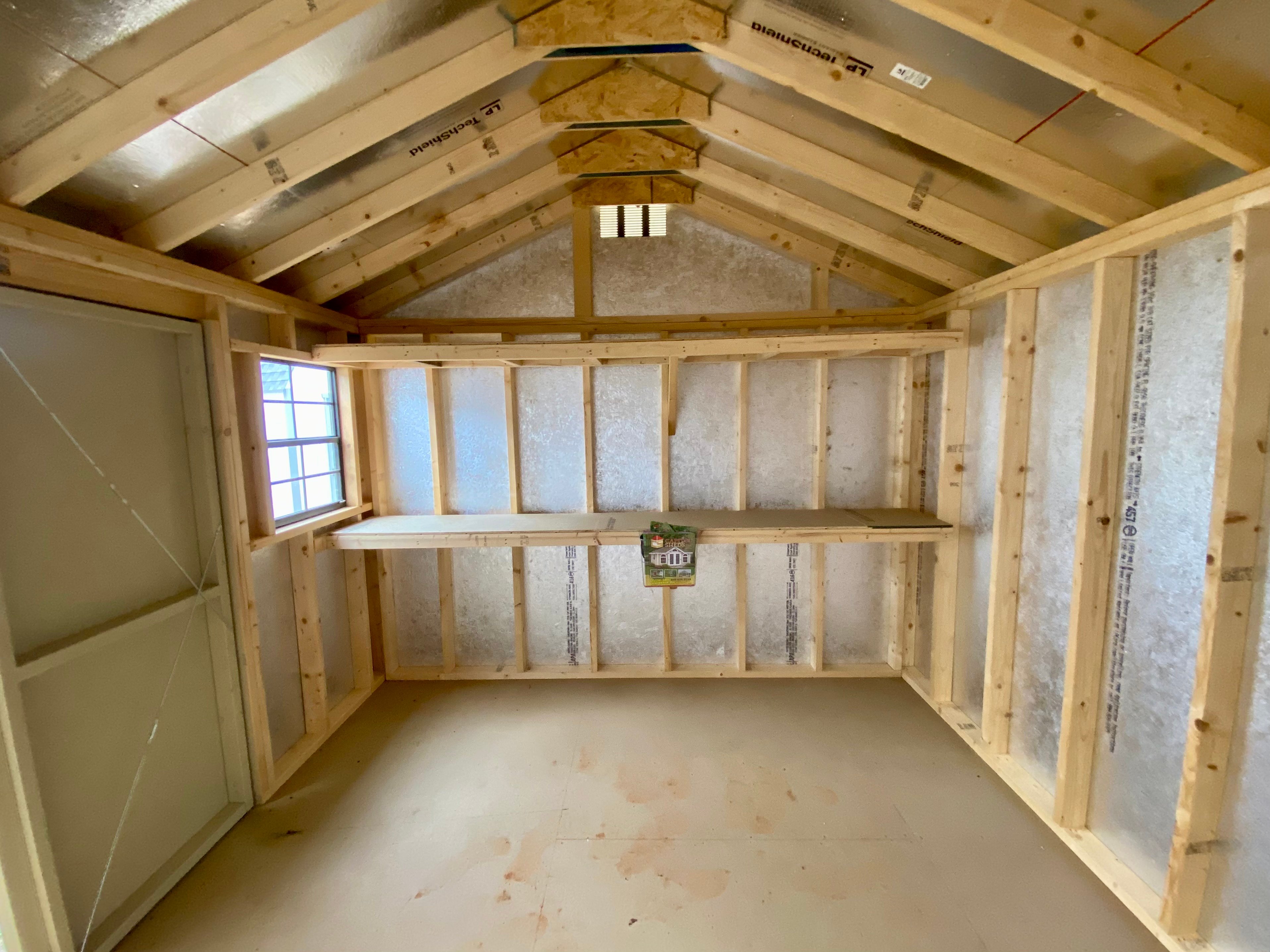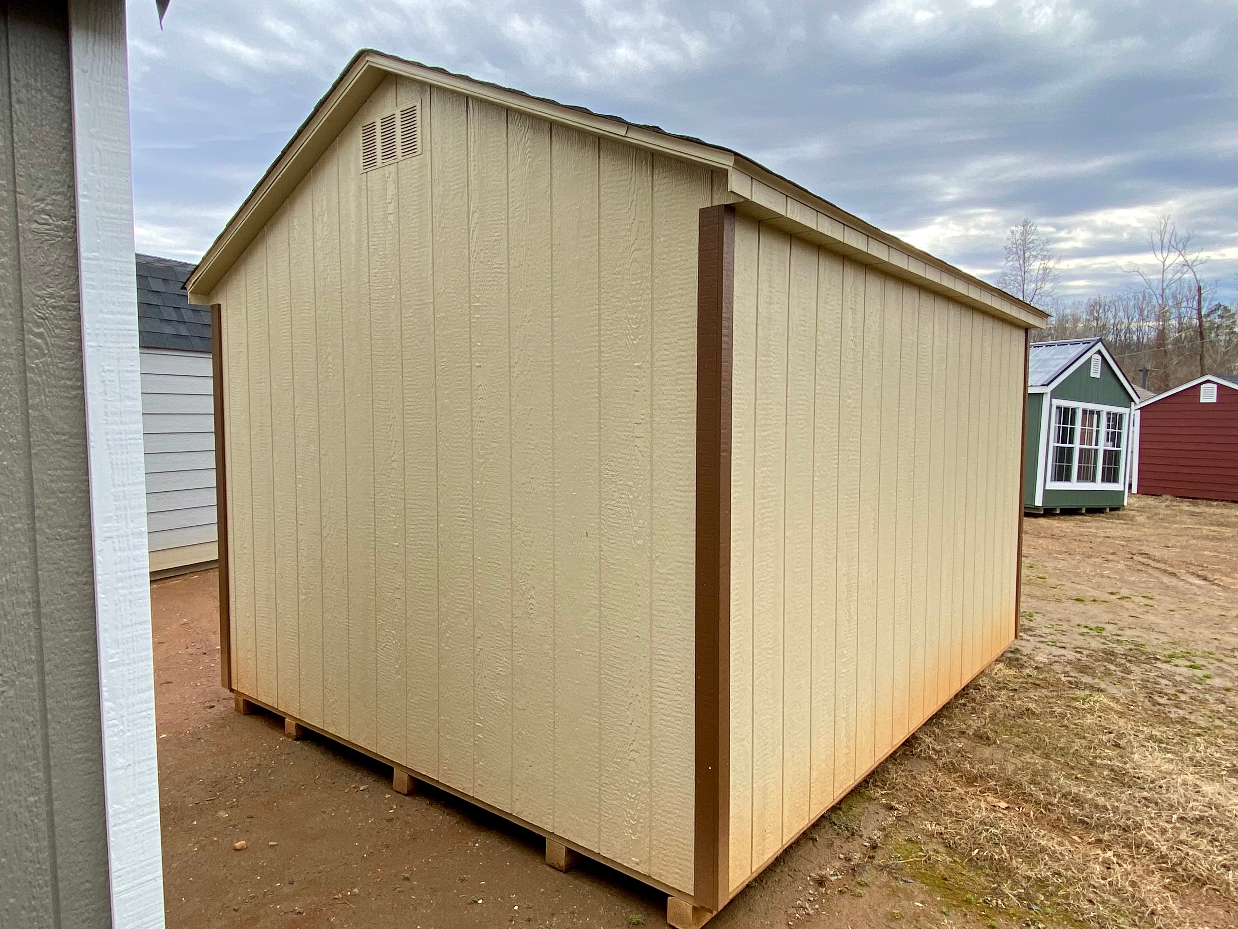 This 10×12 A-Frame shed blends practicality with charm, featuring beige LP Smart Panel siding, rich chestnut trim, and a Weatherwood shingle roof. Built for long-lasting strength, it includes 2×4 wall and roof framing 16″ on center, LP Tech Shield roof sheeting, and LP Prostruct flooring over pressure-treated 2×4 floor joists. The design features two windows and a wide 5ft set of double doors for easy access. Two 16″x10′ shelves provide convenient, built-in storage. Whether used as a workspace, garden shed, or storage solution, this structure delivers dependable function and a classic aesthetic.