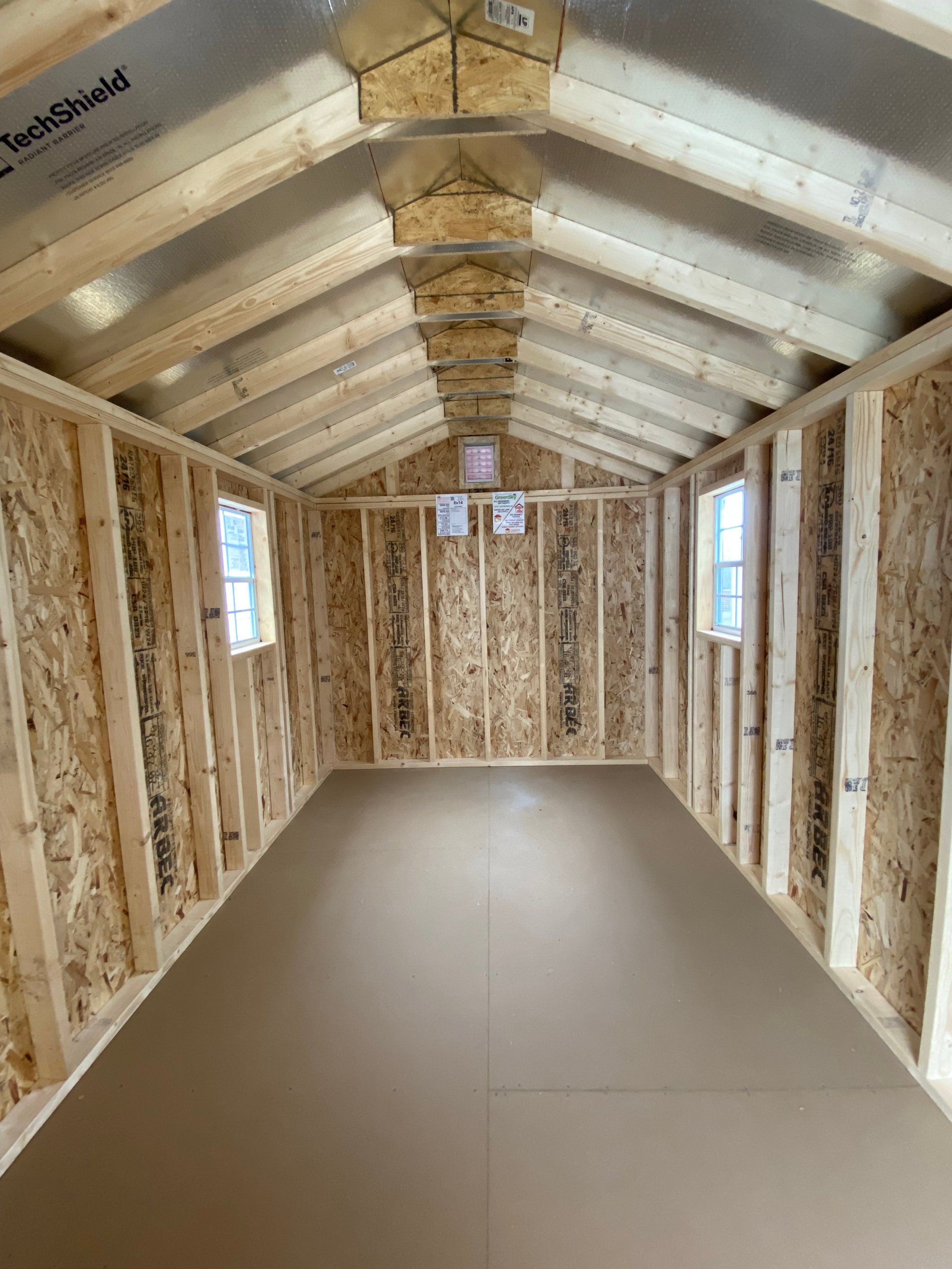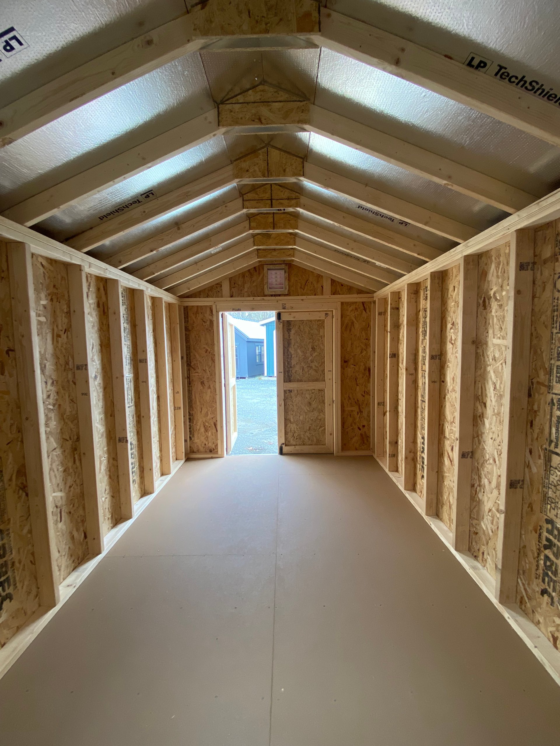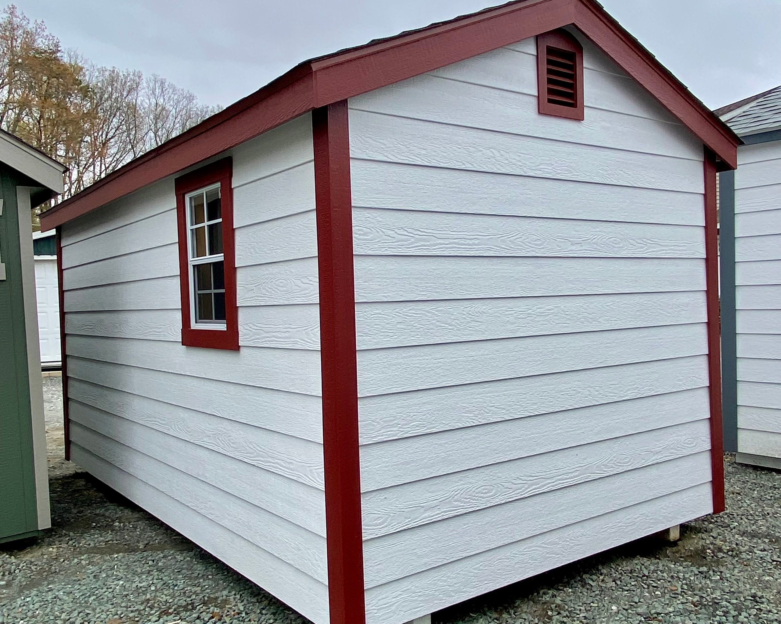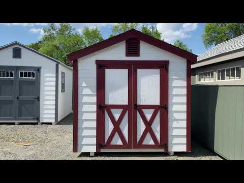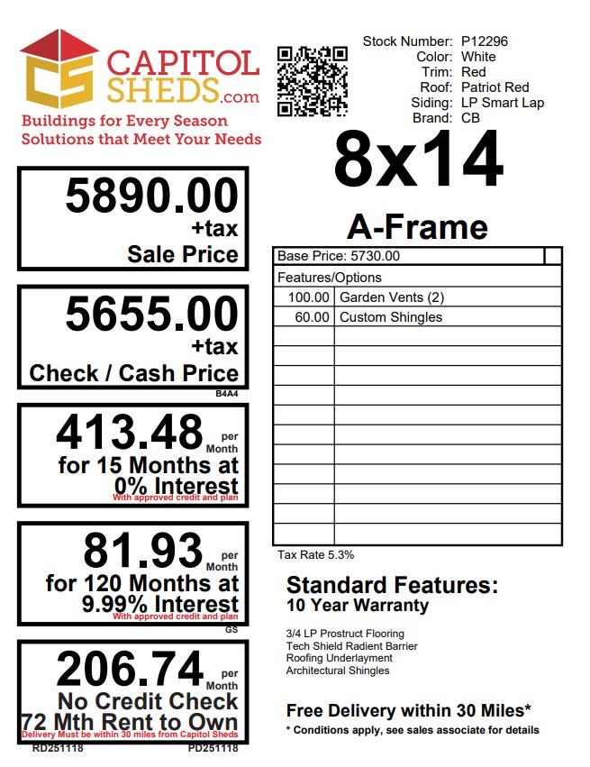 Elevate your outdoor space with this charming 8×14 A-Frame shed, crafted with durable LP Smart Lap siding in crisp White and accented by bold Red trim. The striking Patriot Red shingle roof adds character while providing protection against the elements. Built with robust 2×4 wall and roof framing, LP Tech Shield sheeting, and LP Prostruct flooring, this shed is designed for lasting strength and durability. With two windows for natural light and two doors for easy access, it’s perfect for storing tools, gardening supplies, or creating a cozy workspace. Upgraded with custom shingles and garden vents, this shed combines functionality and style.