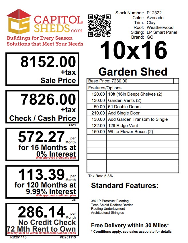 Reserve this building for a $500 deposit. Within 1 business day a rep will contact you to discuss delivery details and discounts you may qualify for such as cash/check, military/1st responder, etc. Don’t lose out on this beautiful building – Place your deposit today to hold it!