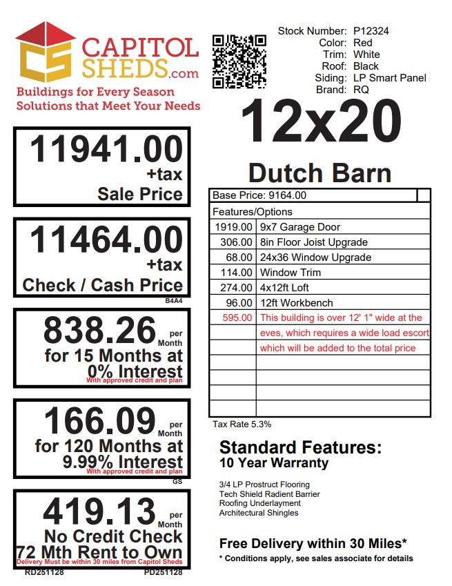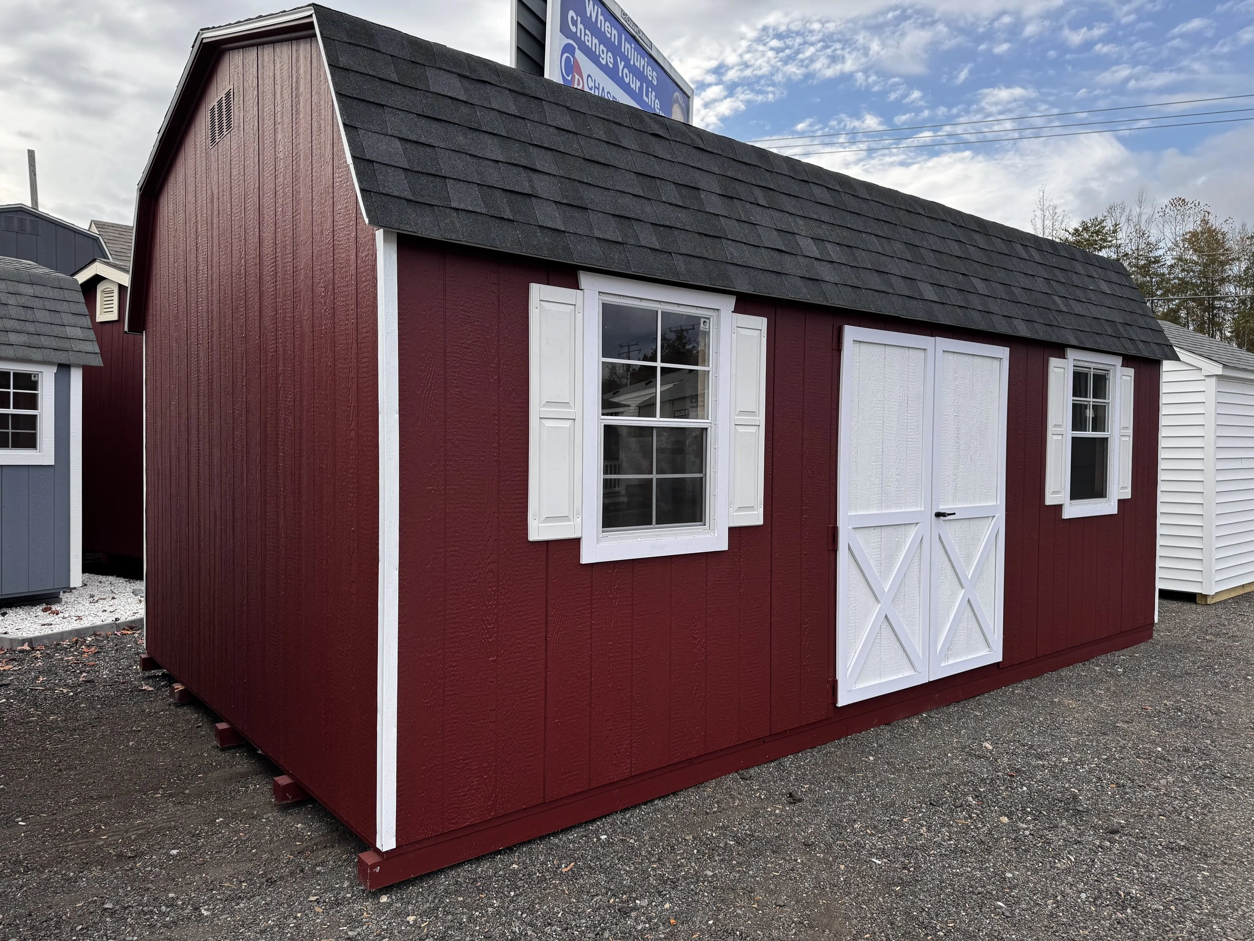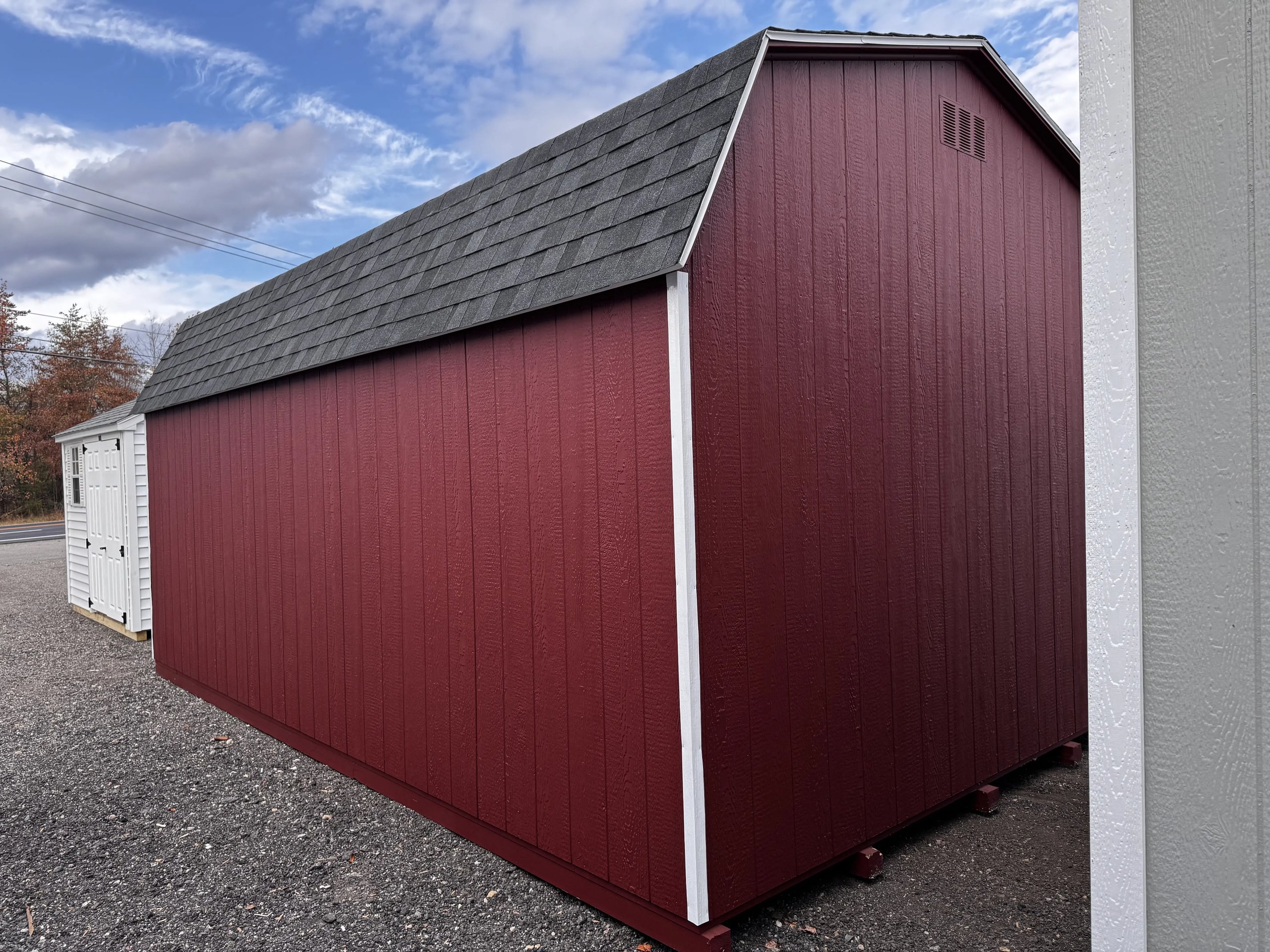 The 12×20 Dutch Barn is built to balance style and durability. With red LP Smart Panel siding and white trim, plus a black architectural shingle roof, this barn makes a bold statement. Framed with 2×4 studs and rafters spaced 16 inches apart, it offers lasting strength and energy efficiency with LP Tech Shield roof sheeting and LP T&G Prostruct flooring. Upgraded with a 9×7 garage door with glass, 24×36 windows with trim, an 8-inch floor joist, a 4-foot loft, and a 2-inch workbench, this barn combines practicality with ample storage.