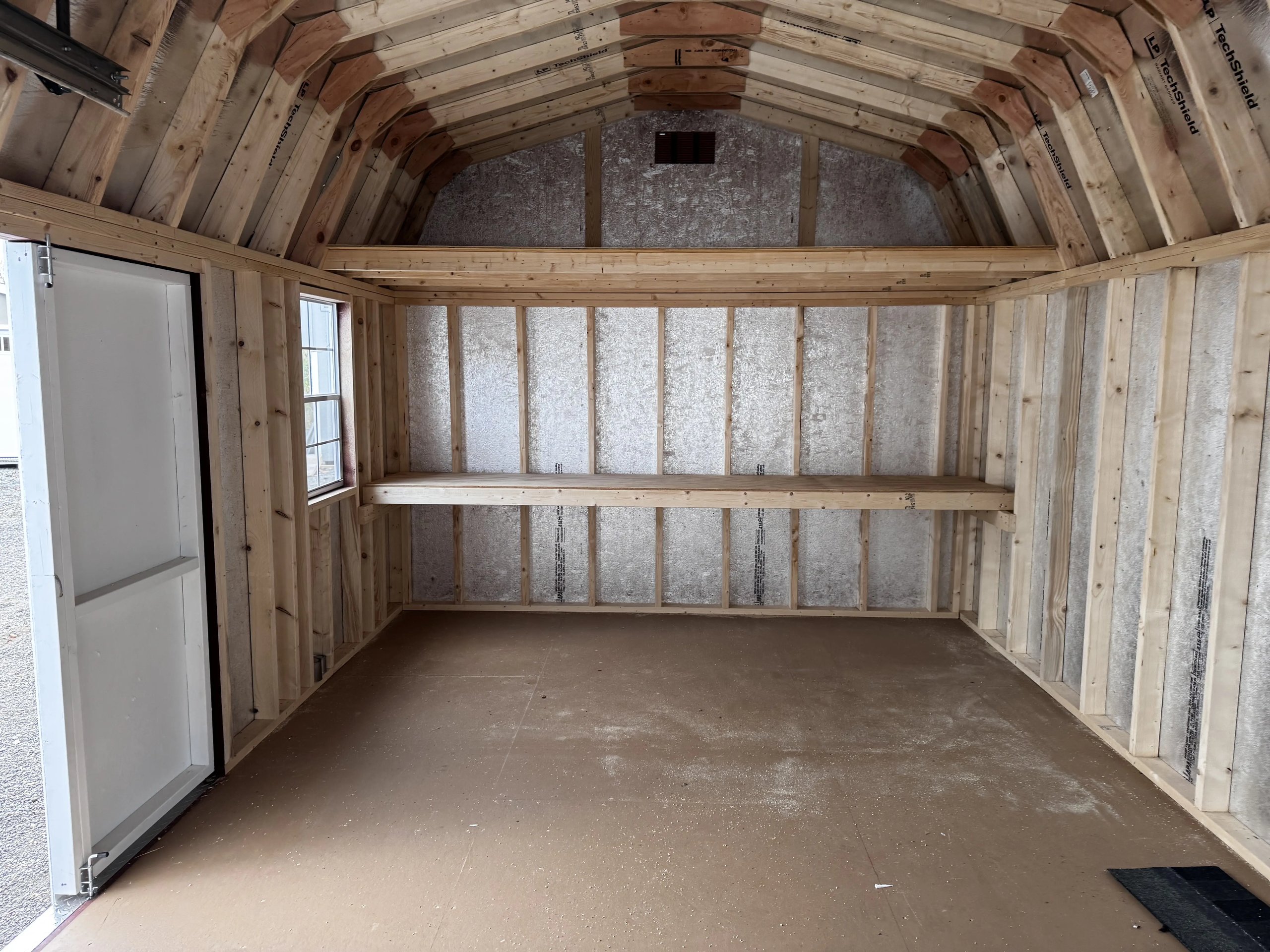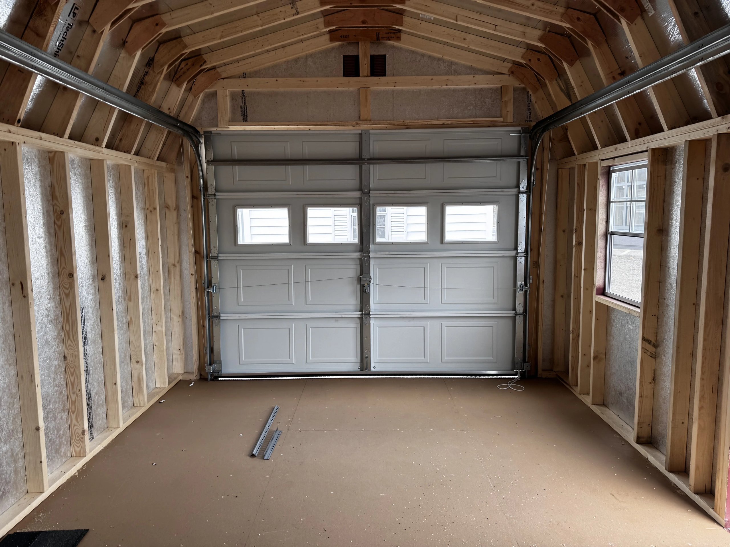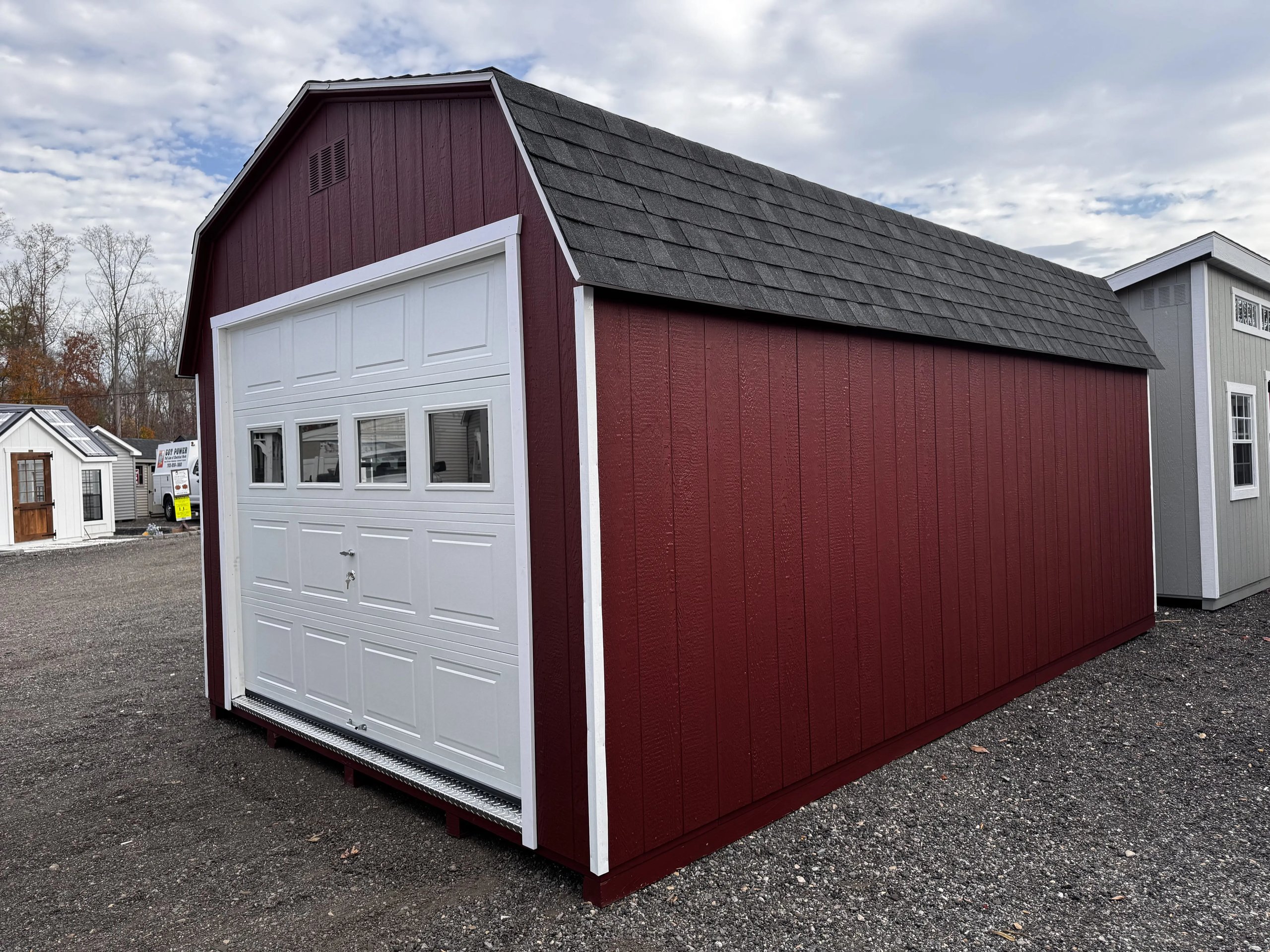 The 12×20 Dutch Barn is built to balance style and durability. With red LP Smart Panel siding and white trim, plus a black architectural shingle roof, this barn makes a bold statement. Framed with 2×4 studs and rafters spaced 16 inches apart, it offers lasting strength and energy efficiency with LP Tech Shield roof sheeting and LP T&G Prostruct flooring. Upgraded with a 9×7 garage door with glass, 24×36 windows with trim, an 8-inch floor joist, a 4-foot loft, and a 2-inch workbench, this barn combines practicality with ample storage.