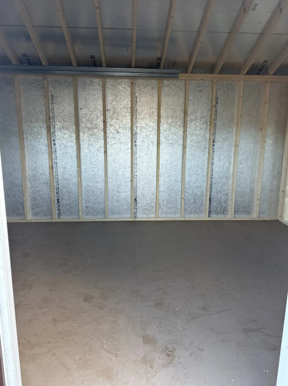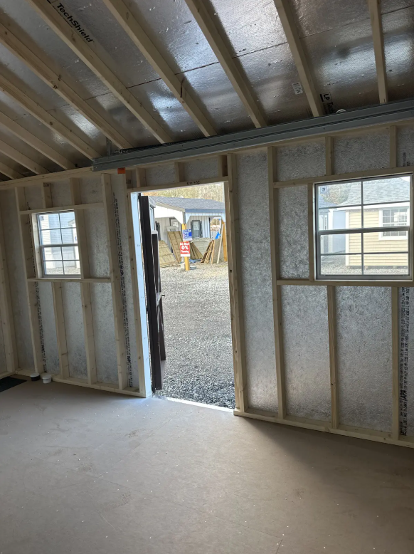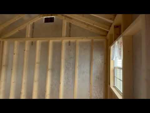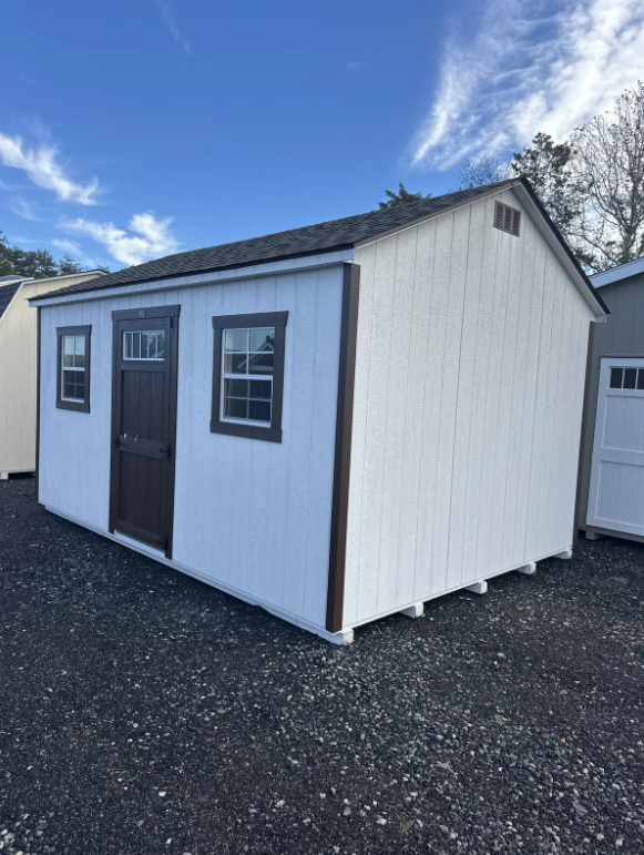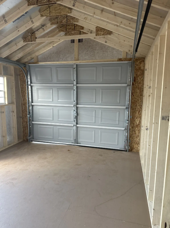 This High Wall A-Frame shed, crafted by Amish artisans, offers a perfect blend of form and function. Measuring 12×16, it features white LP Smart Panel siding with brown trim and a weatherwood-colored roof of dimensional shingles. Built with precision, it includes 2×4 wall and roof framing at 16-inch centers, LP Tech Shield sheeting, and LP Prostruct flooring supported by upgraded 8-inch on-center pressure-treated joists. Its standout features include a 9×7 garage door, a garden door with elegant transoms, and trimmed windows for added charm. Designed for durability and style, this shed is an ideal solution for storage or a workspace.