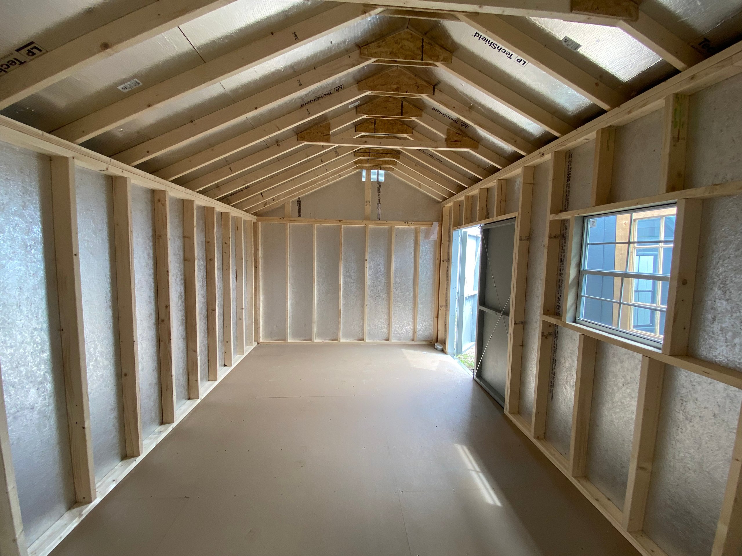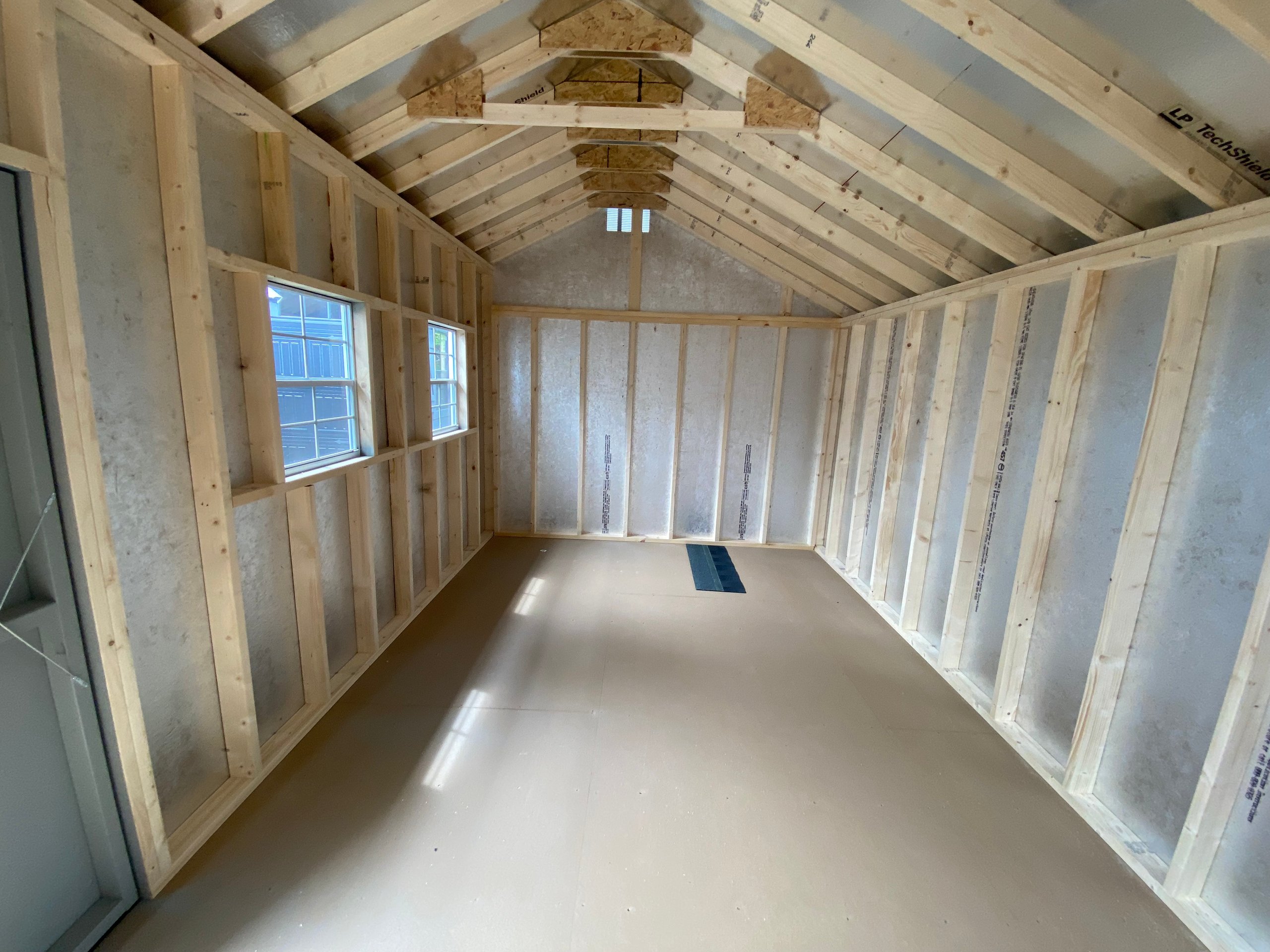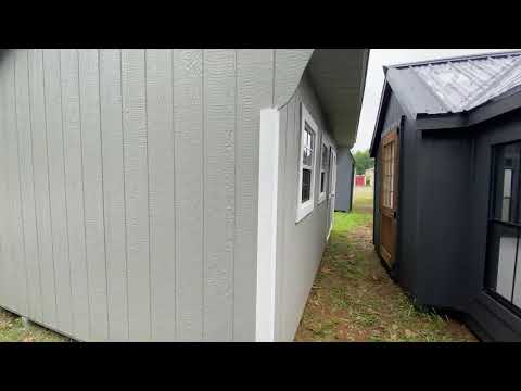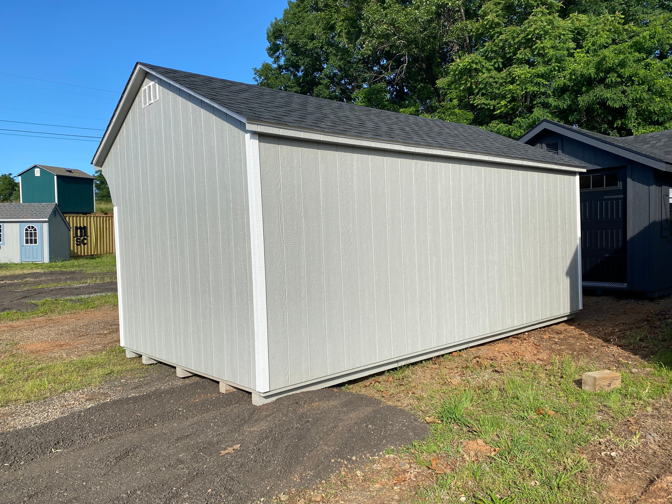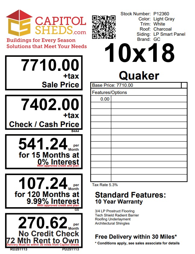 This classic 10×18 Quaker-style shed offers timeless charm with a practical layout, ideal for storage or a backyard workspace. Its light gray LP Smart Panel siding pairs beautifully with crisp white trim and a charcoal architectural shingle roof. The offset roofline and wide eaves add a distinct touch of style, while two windows and double doors provide functionality and natural light. Built to last with 2×4 framing 16” on center, LP Tech Shield roof sheeting, and durable LP Prostruct flooring over pressure-treated 2×4 floor joists 12” on center, this shed is a dependable, attractive addition to any property.