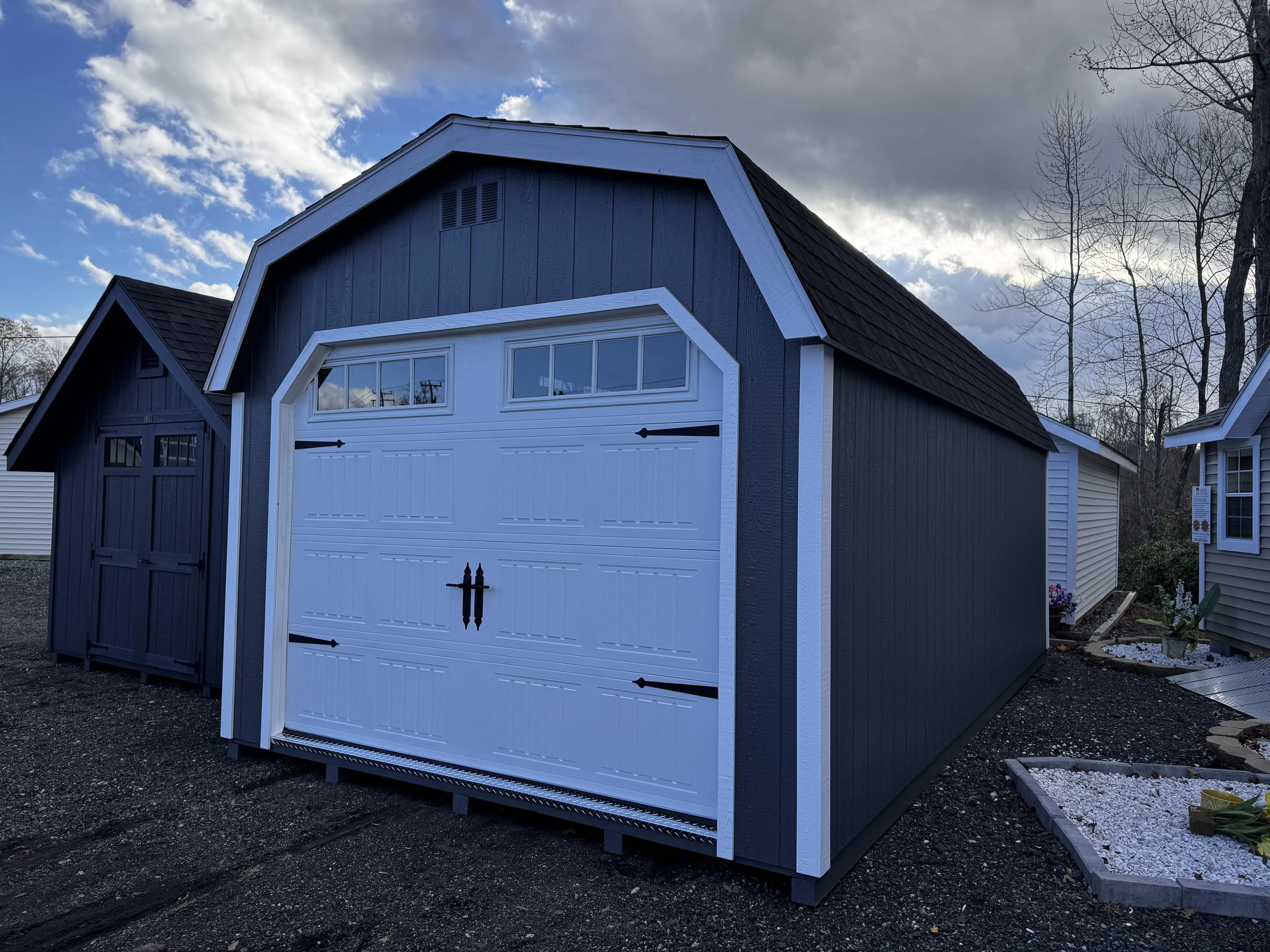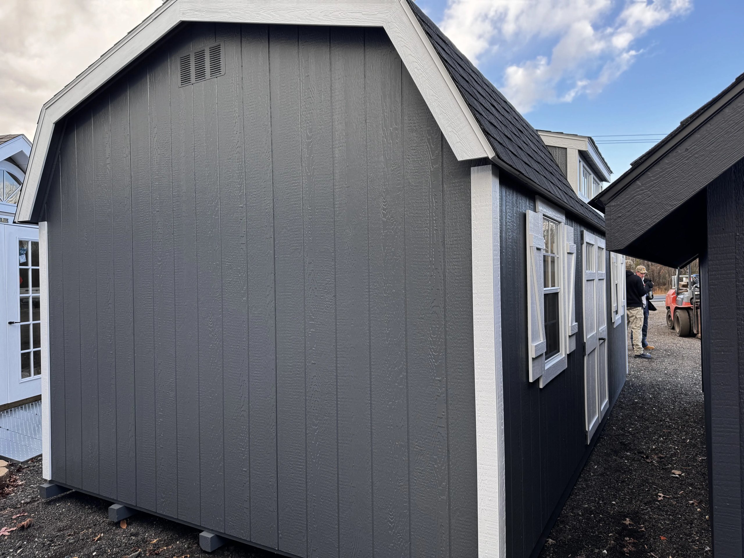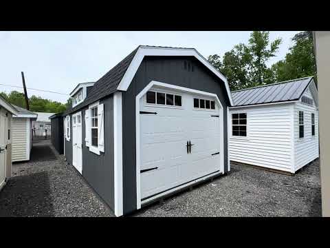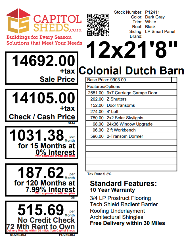 Style Name: Colonial Dutch Barn Size: 12×21’8” Siding: LP Smart Panel Main Color: Dark Gray Trim Color: White Roof Color: Black Roofing: Architectural Shingles Roofing Underlayment: Roof Felt Paper Number of Windows: 4 Number of Doors: 3 Wall Framing: 2×4 studs 16 inches on center Roof Framing: 2×4 rafters 16 inches on center Roof Sheeting: LP Tech Shield Flooring: LP T&G Prostruct Flooring Floor Joists: Pressure Treated 2×4 joists 16 inches on center   Included Upgrades: 8” On Center Floor Joists 9×7 Carriage Garage Door Z Shutters Door transoms 4’ loft 2×2 Solar Skylights 24×36 Window Upgrade 2 ft workbench