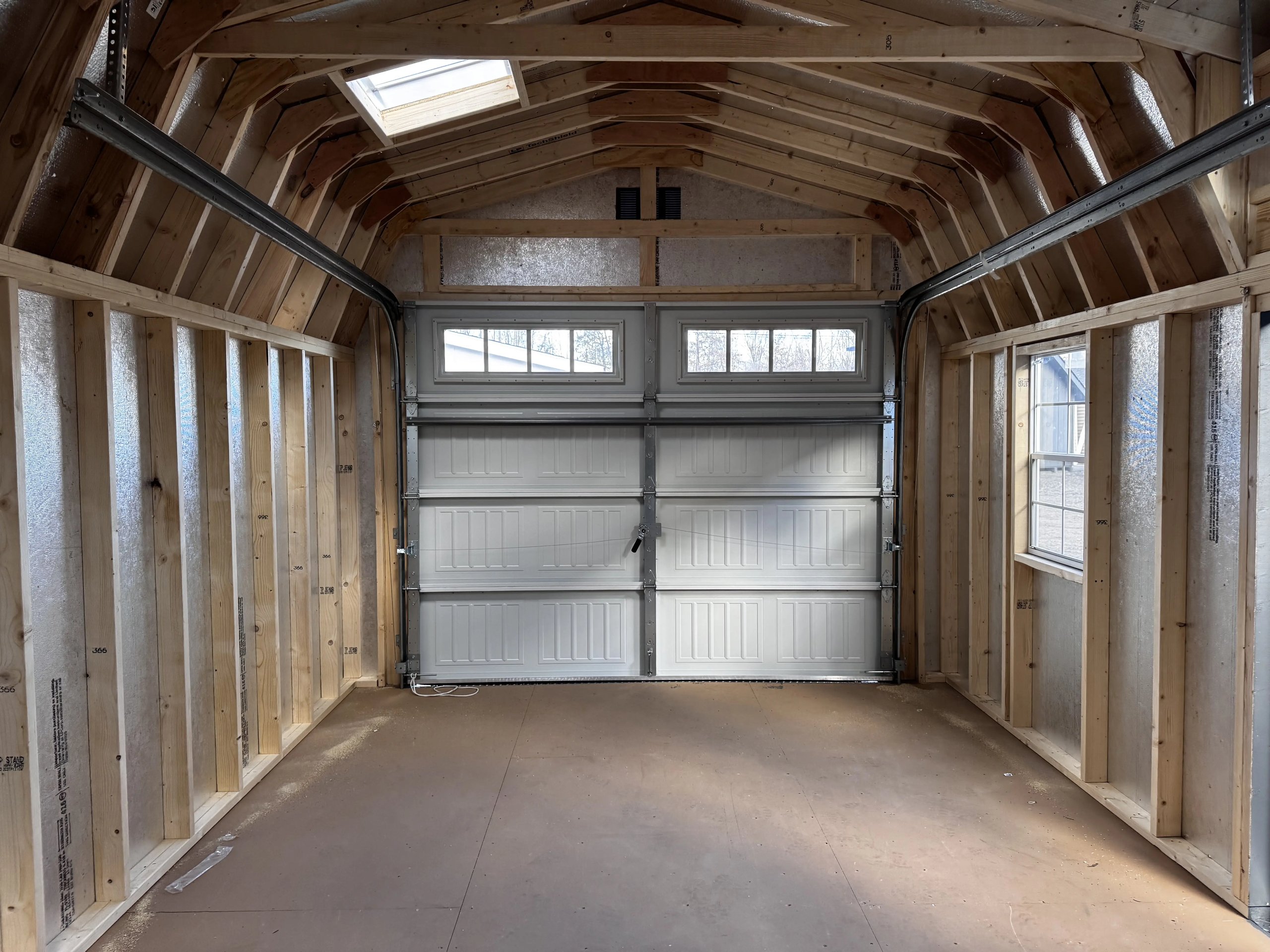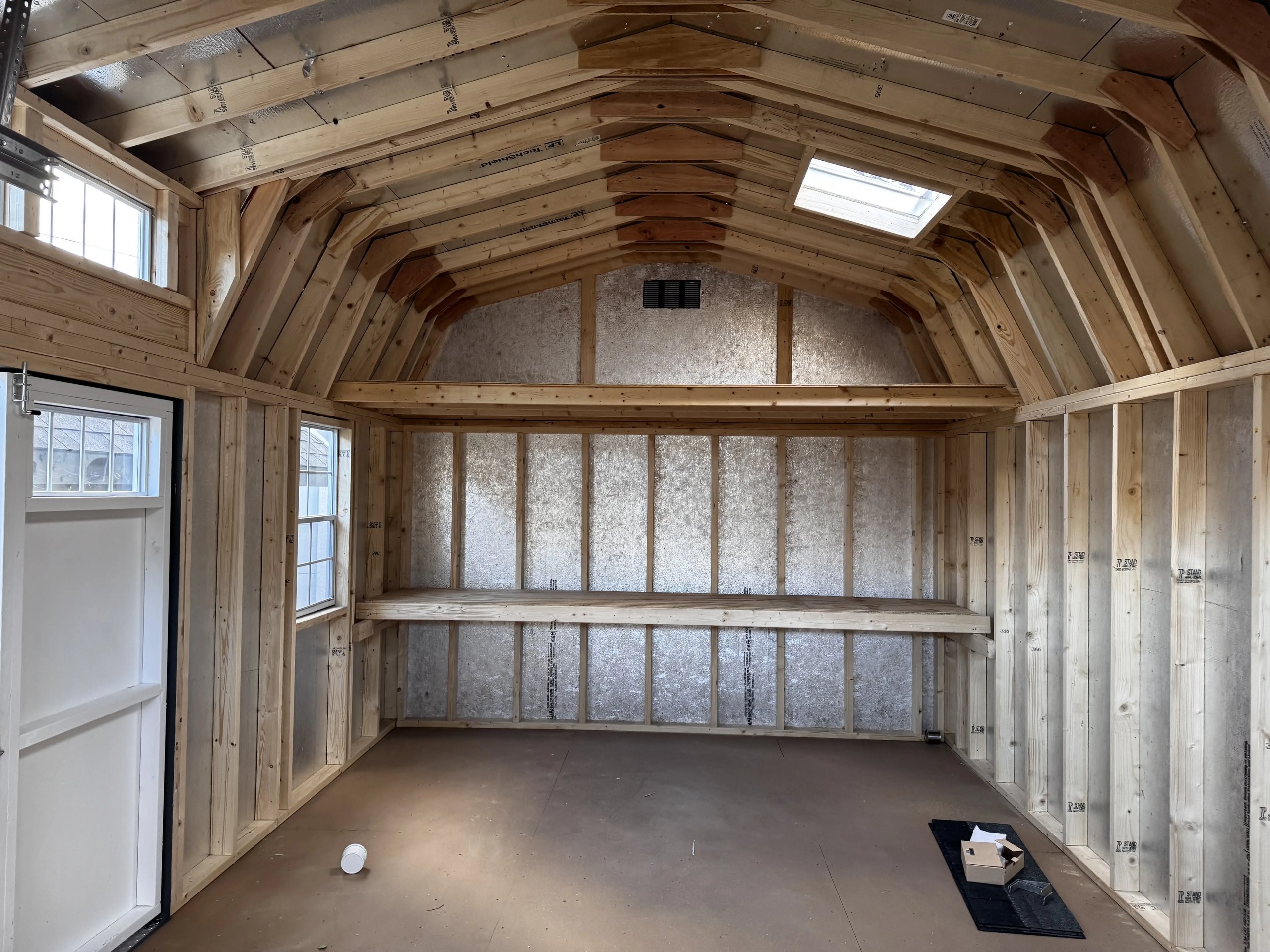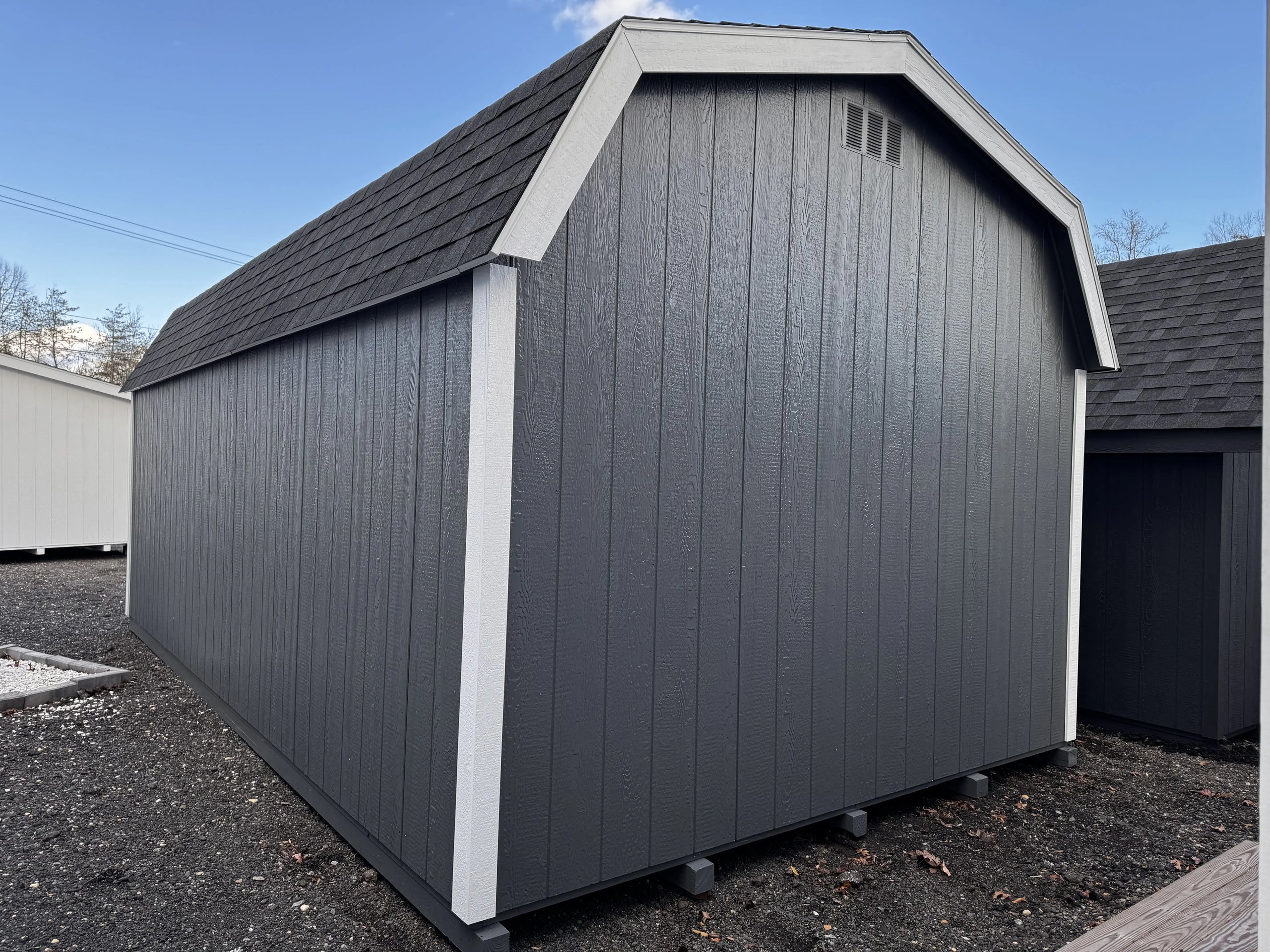Style Name: Colonial Dutch Barn Size: 12×21’8” Siding: LP Smart Panel Main Color: Dark Gray Trim Color: White Roof Color: Black Roofing: Architectural Shingles Roofing Underlayment: Roof Felt Paper Number of Windows: 4 Number of Doors: 3 Wall Framing: 2×4 studs 16 inches on center Roof Framing: 2×4 rafters 16 inches on center Roof Sheeting: LP Tech Shield Flooring: LP T&G Prostruct Flooring Floor Joists: Pressure Treated 2×4 joists 16 inches on center   Included Upgrades: 8” On Center Floor Joists 9×7 Carriage Garage Door Z Shutters Door transoms 4’ loft 2×2 Solar Skylights 24×36 Window Upgrade 2 ft workbench