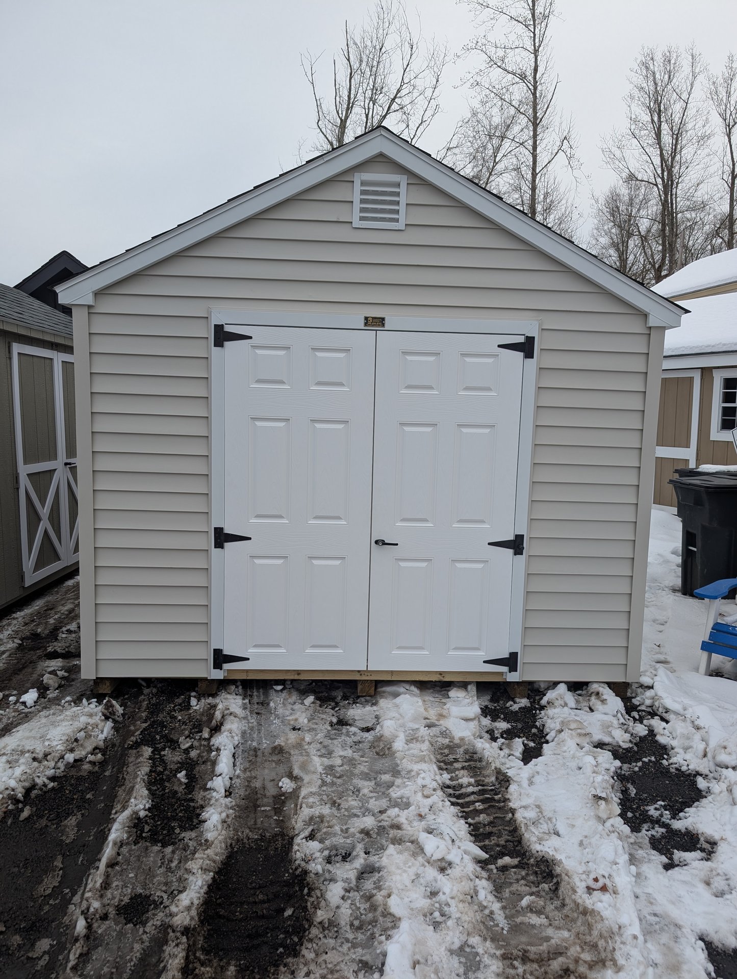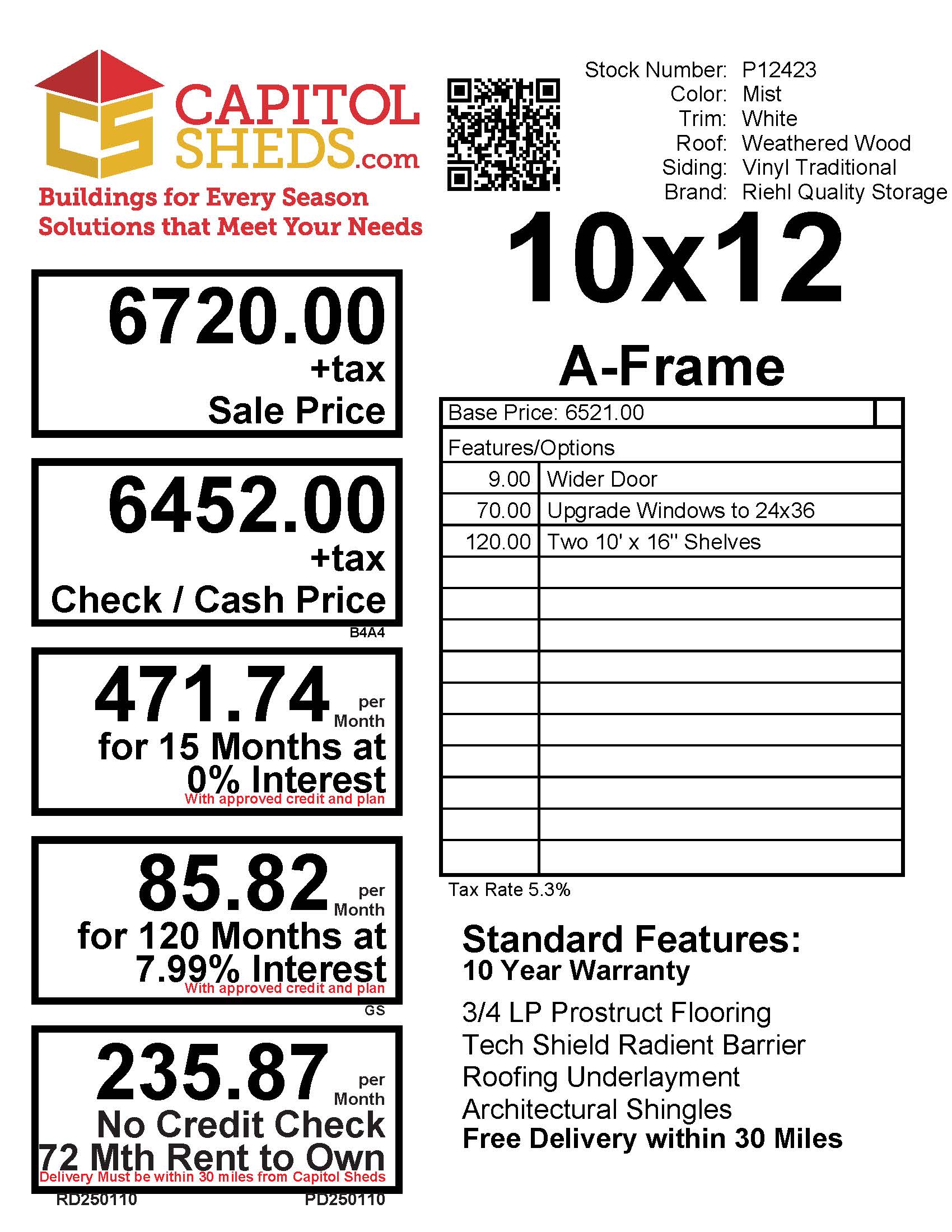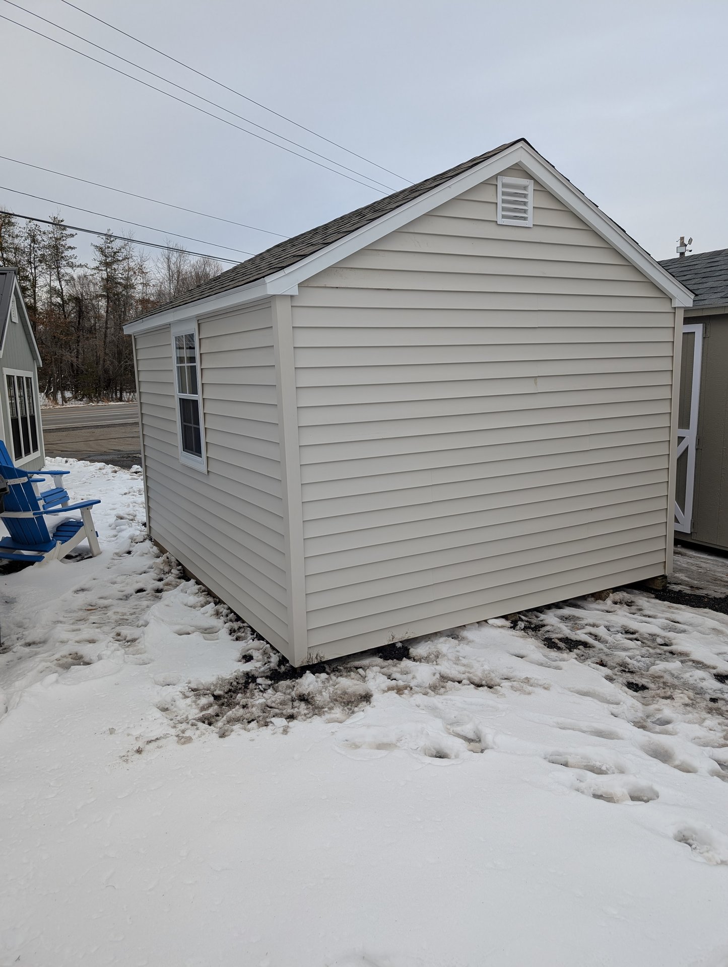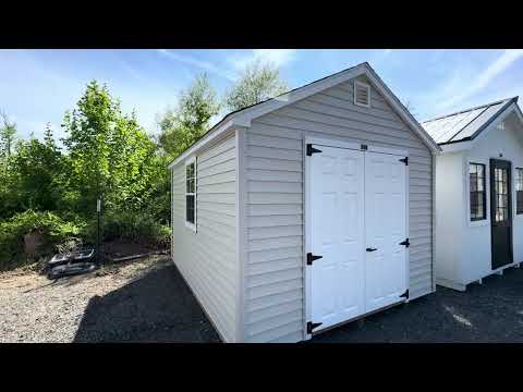 The A-Frame 10×12 Amish-built storage shed offers a perfect blend of style and strength. With a Mist-colored vinyl exterior and white trim, it’s both attractive and durable. The weathered wood roof with dimensional shingles adds a rustic touch, while the upgraded 24×36 windows provide ample natural light. The shed is built with quality materials including LP Prostruct flooring and pressure-treated floor joists. Featuring a wider door for easy access and two 10’ x 16” shelves for extra storage, this shed is ideal for organizing tools, equipment, or creating a workspace. Built to last for years of use.