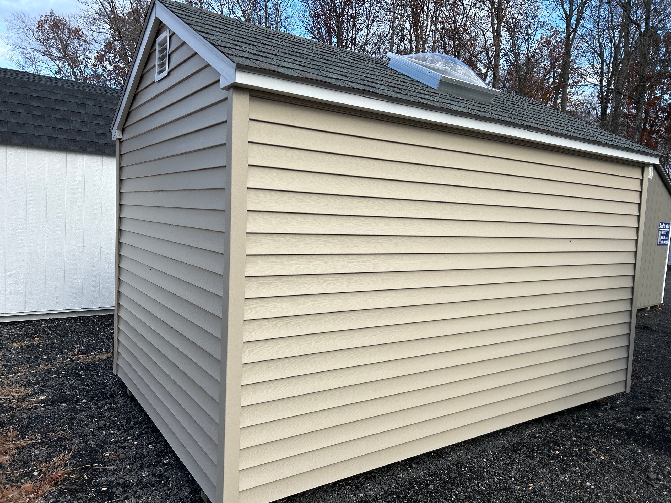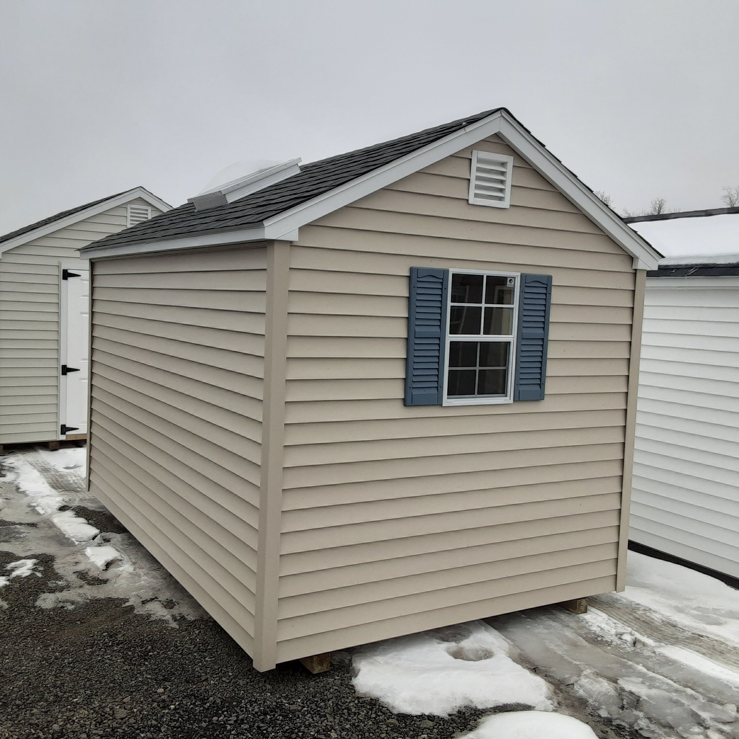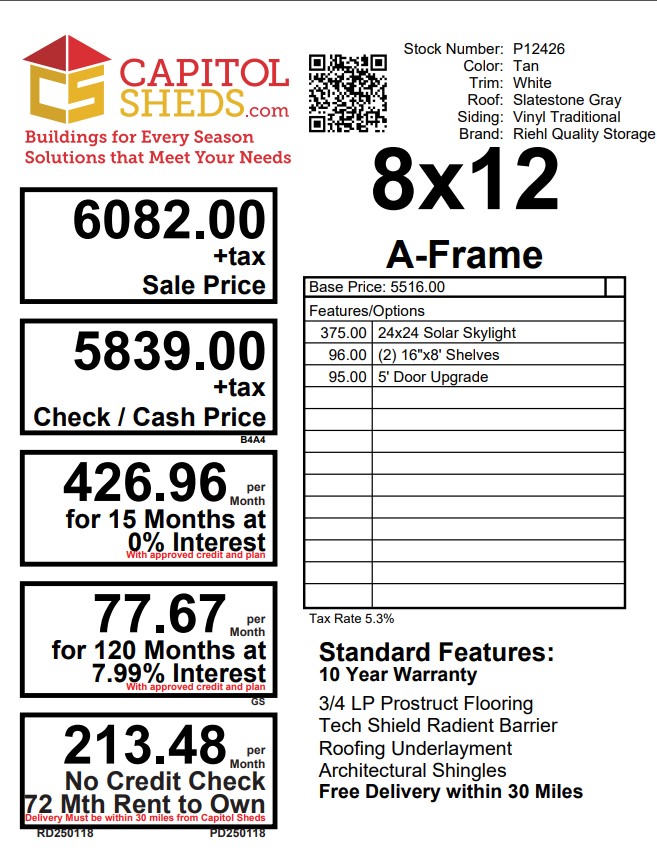 This Amish-built 8×12 A-Frame storage shed combines durability and style. Crafted with traditional vinyl siding in tan and white trim, it features a Slatestone Gray roof with dimensional shingles and roof felt for extra protection. The structure boasts 2×4 framing, LP Prostruct flooring, and pressure-treated floor joists for lasting strength. Additional upgrades include a 6′ fiberglass double door, a 24″x24″ solar skylight for natural light, and two 16″x8′ shelves for added organization. With 2 windows and a well-designed layout, this shed is perfect for both storage and functionality.