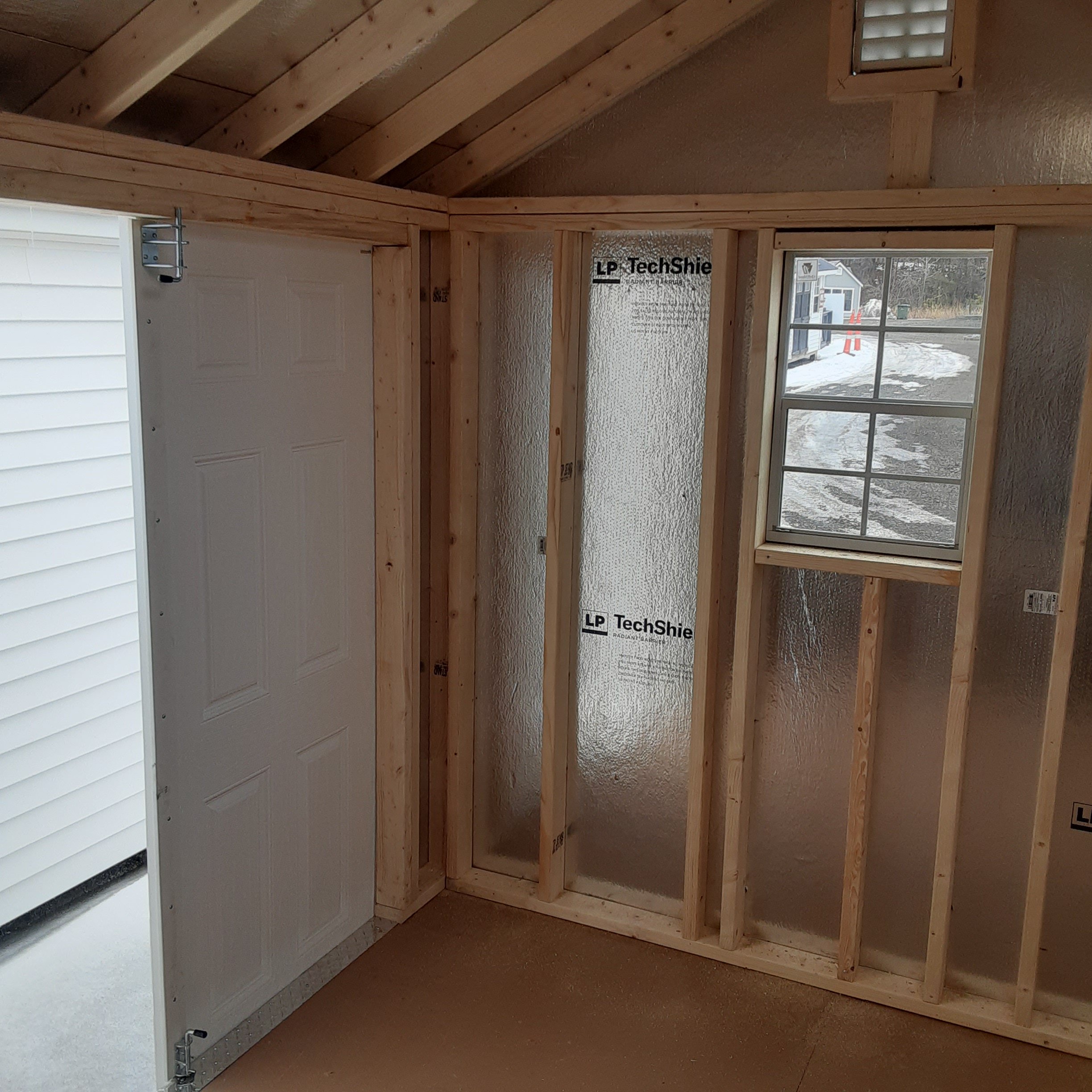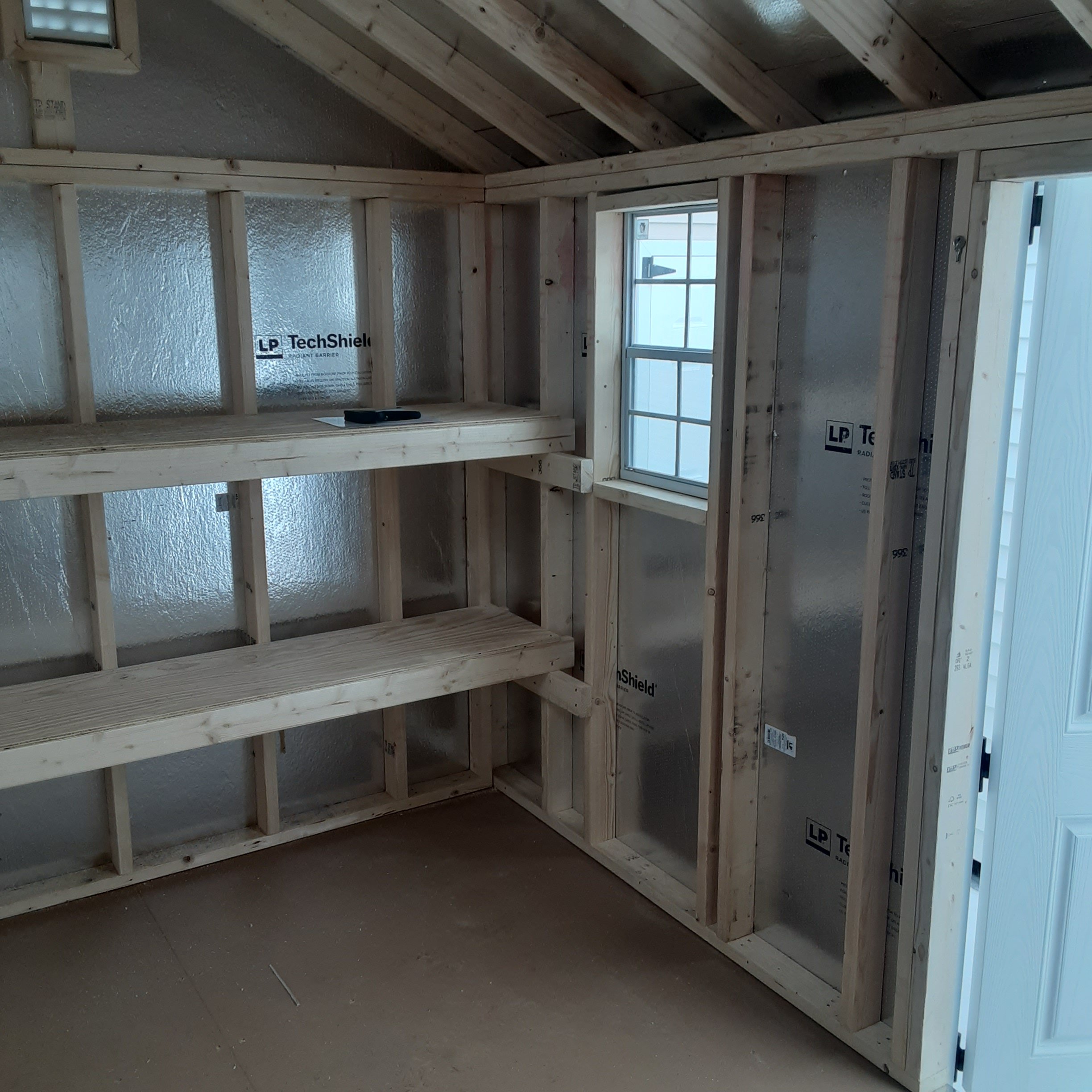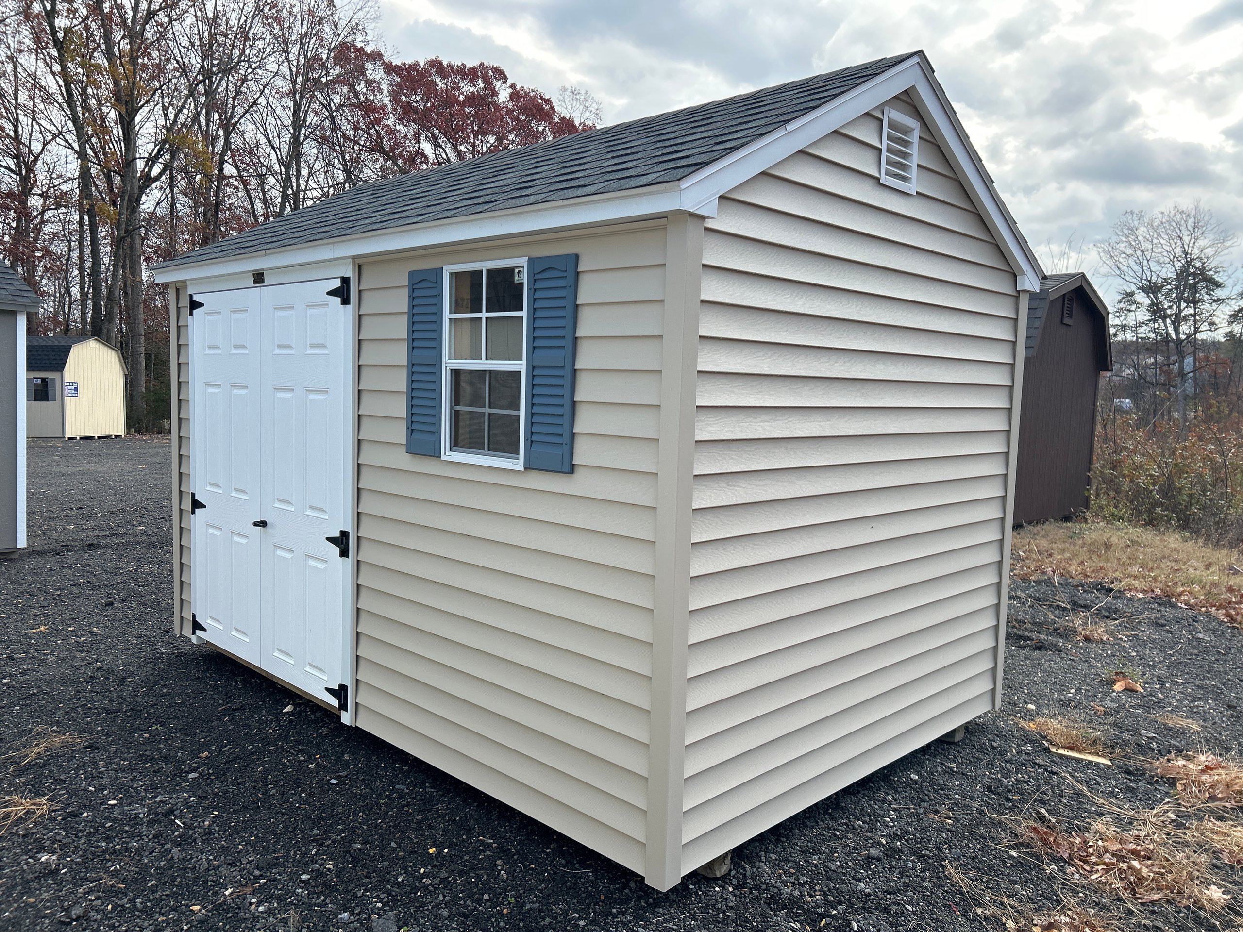 This Amish-built 8×12 A-Frame storage shed combines durability and style. Crafted with traditional vinyl siding in tan and white trim, it features a Slatestone Gray roof with dimensional shingles and roof felt for extra protection. The structure boasts 2×4 framing, LP Prostruct flooring, and pressure-treated floor joists for lasting strength. Additional upgrades include a 6′ fiberglass double door, a 24″x24″ solar skylight for natural light, and two 16″x8′ shelves for added organization. With 2 windows and a well-designed layout, this shed is perfect for both storage and functionality.