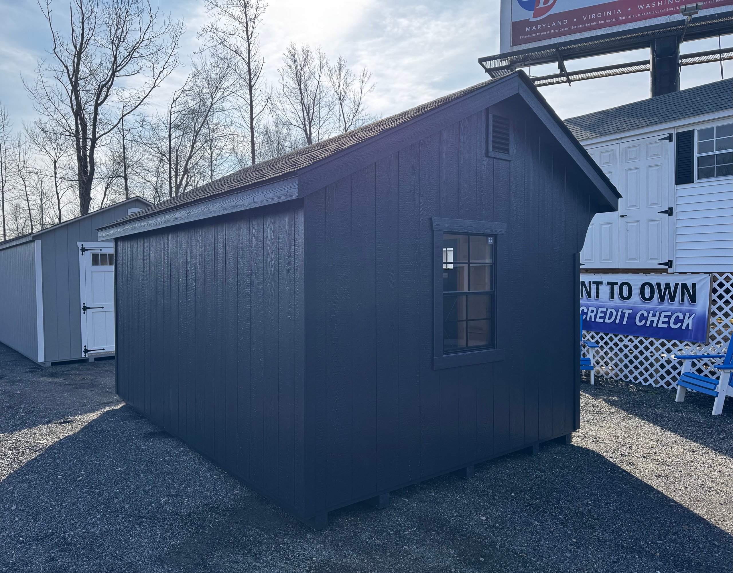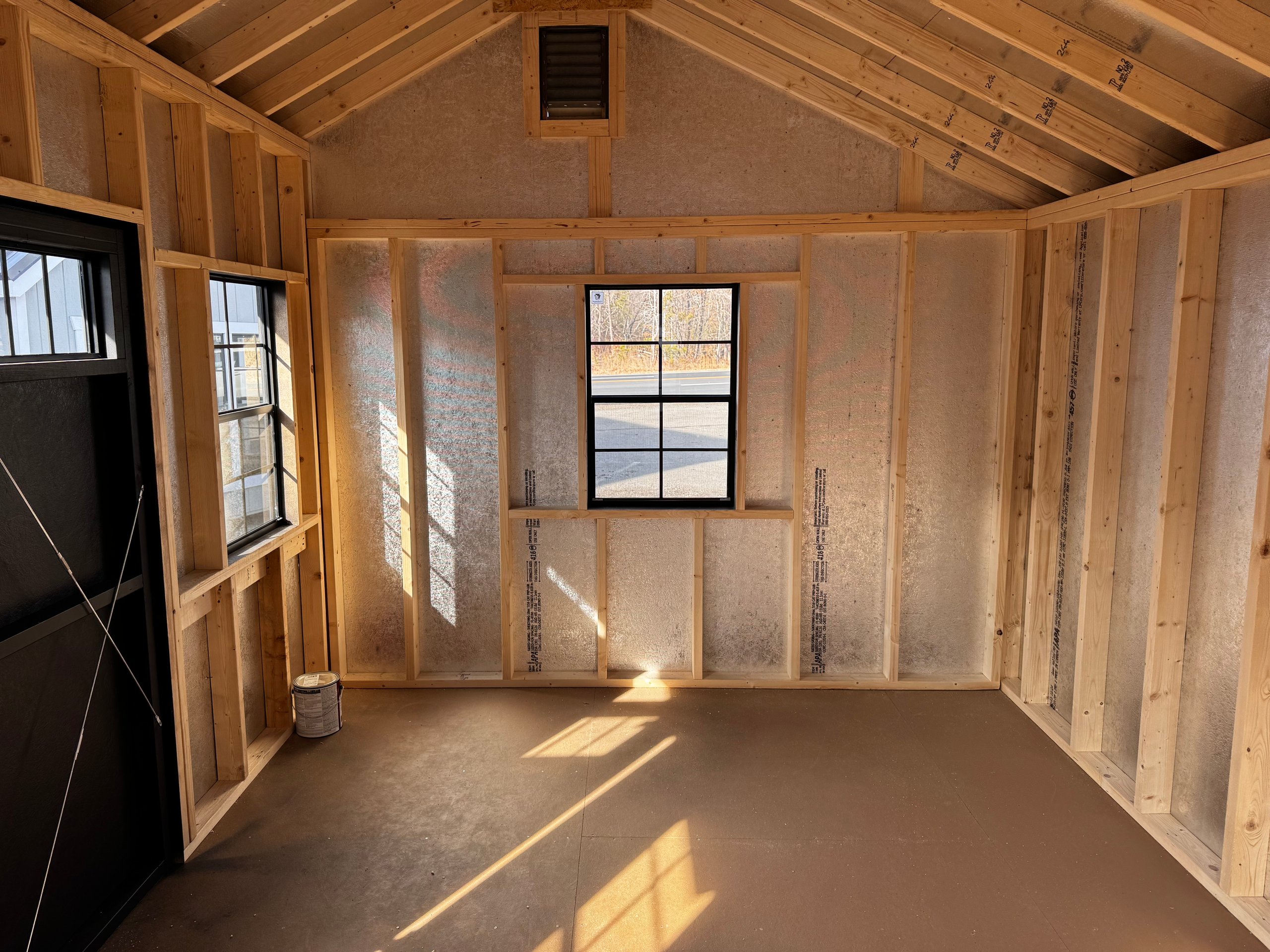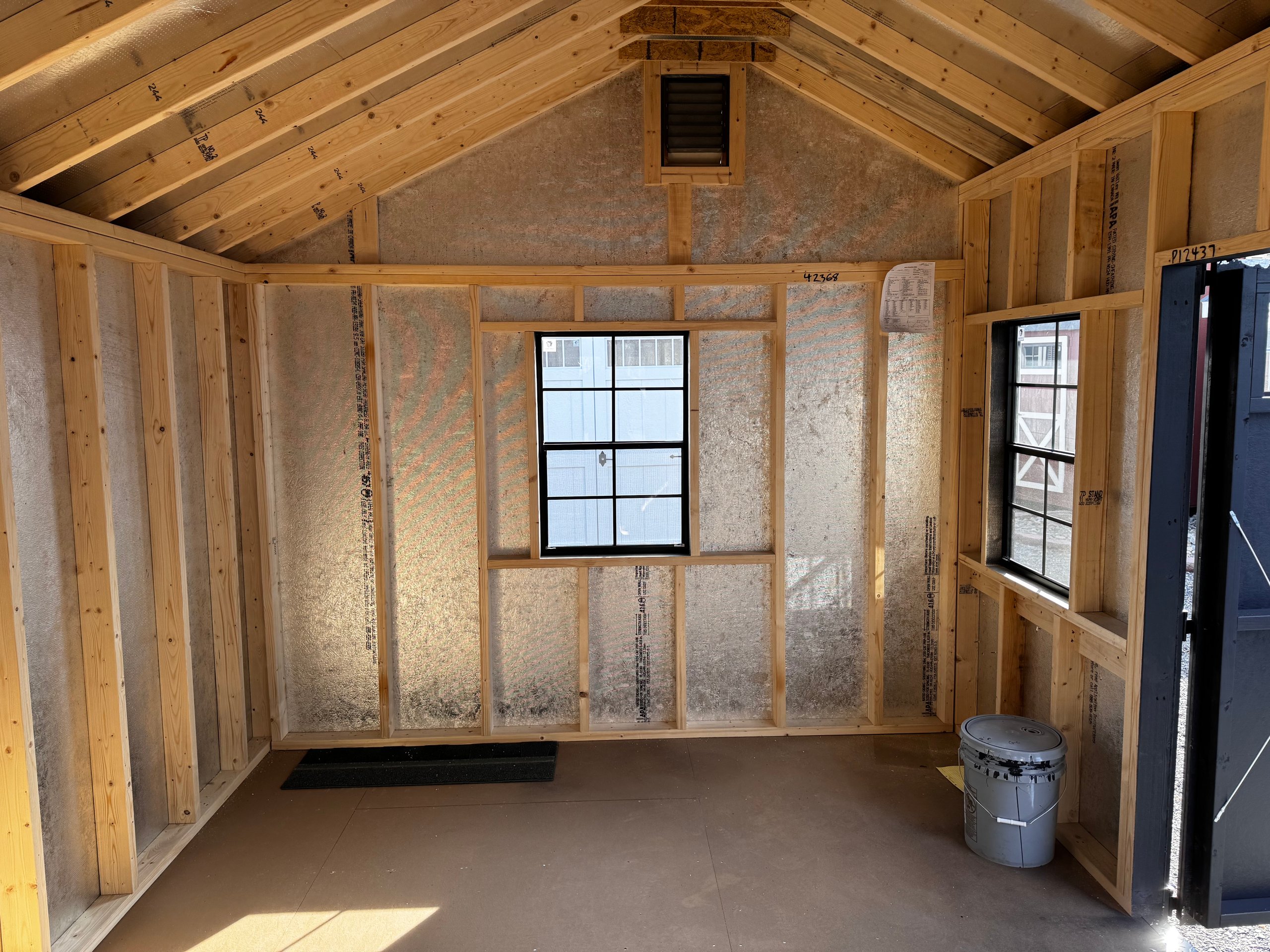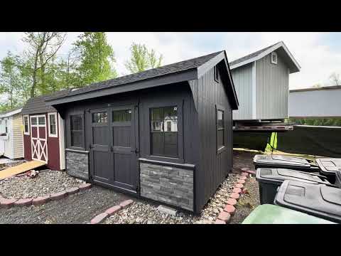 The 10×14 Carriage shed blends classic design with sophisticated upgrades to enhance your outdoor space. Featuring durable mopboard-colored LP Smart Panel siding with custom black accents, it’s both functional and elegant. Upgraded black 24×36 windows with trim and black 4-lite transoms allow abundant natural light while maintaining privacy. The Lewiston stone front adds a luxurious touch, complementing the charcoal architectural shingle roof. Built for durability, this shed includes LP Tech Shield roof sheeting, ProStruct flooring, and pressure-treated 2×4 joists. Garden vents improve ventilation, making it perfect for storage, hobbies, or workspace needs.