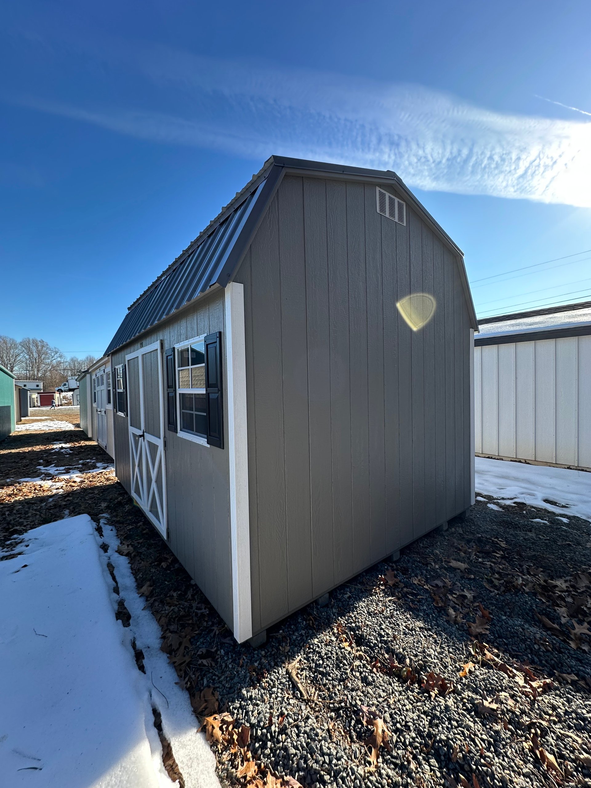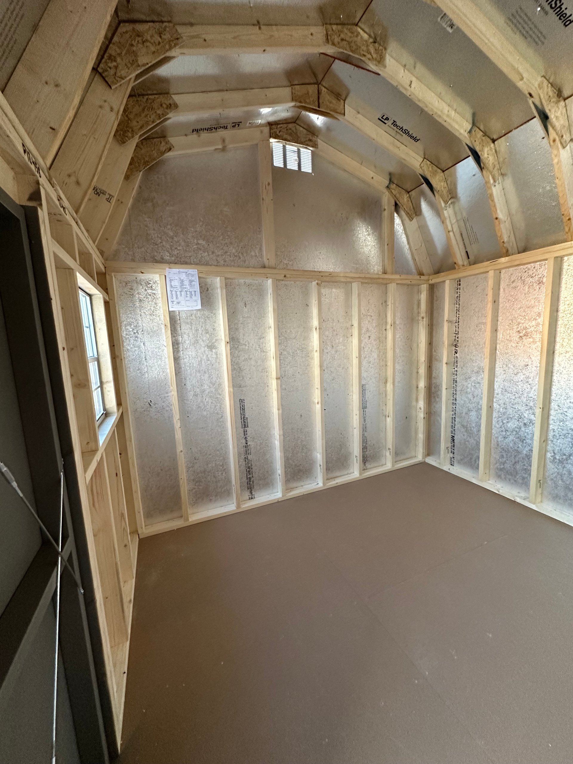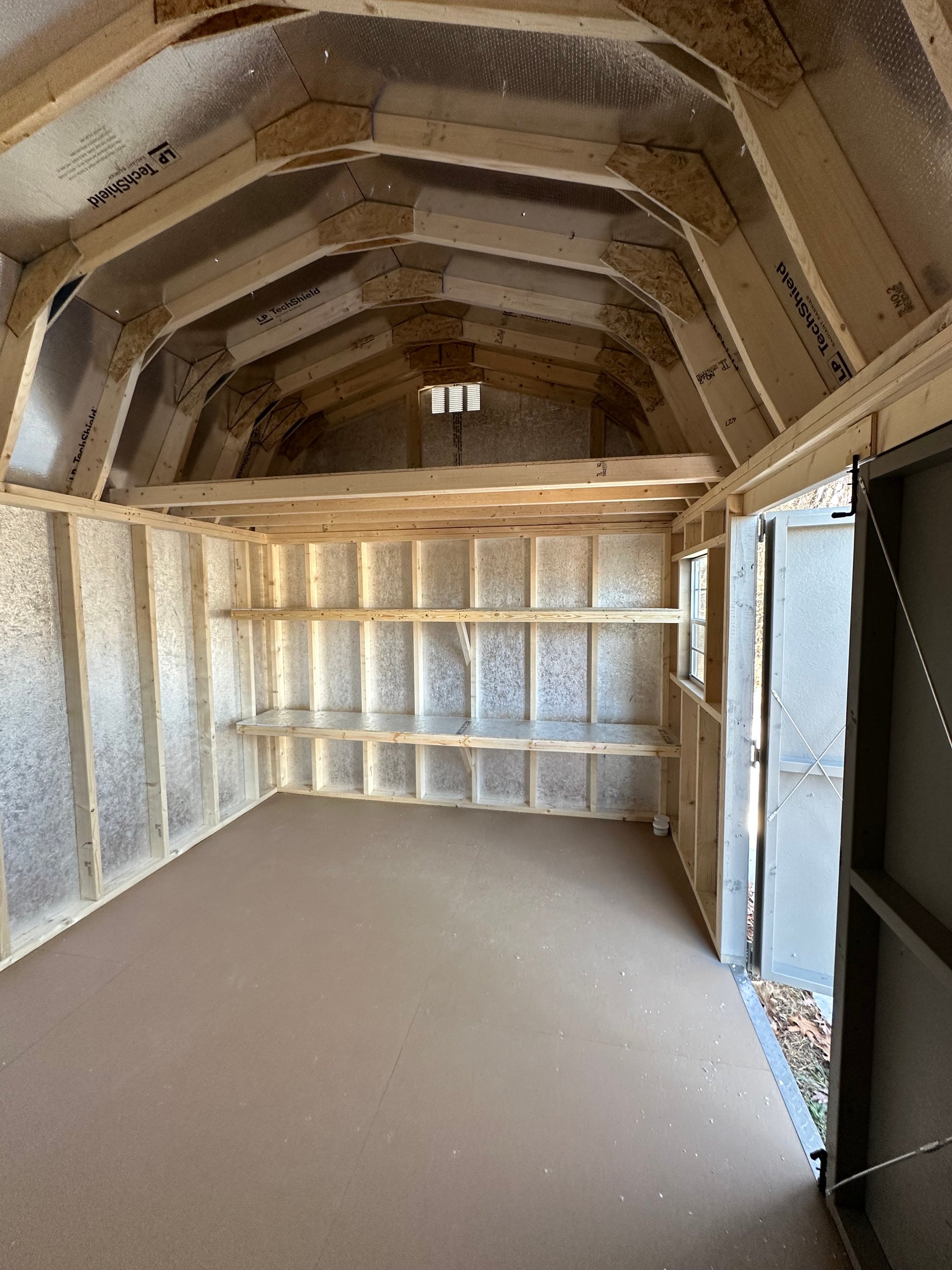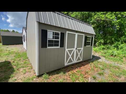 This 10×14 Dutch Barn shed offers a classic silhouette with modern durability. Finished in Clay LP Smart Panel siding with crisp White trim and a Charcoal metal roof, it’s both attractive and resilient. The barn-style roof adds extra overhead space, perfect for maximizing interior storage. Built with sturdy 2×4 wall and roof framing spaced 16 inches on center, plus LP Tech Shield roof sheathing and LP Prostruct flooring with pressure-treated joists. Two windows provide natural light, while the dual doors allow easy entry. A 10-foot interior shelf is included, ideal for organizing tools, bins, or seasonal decorations.