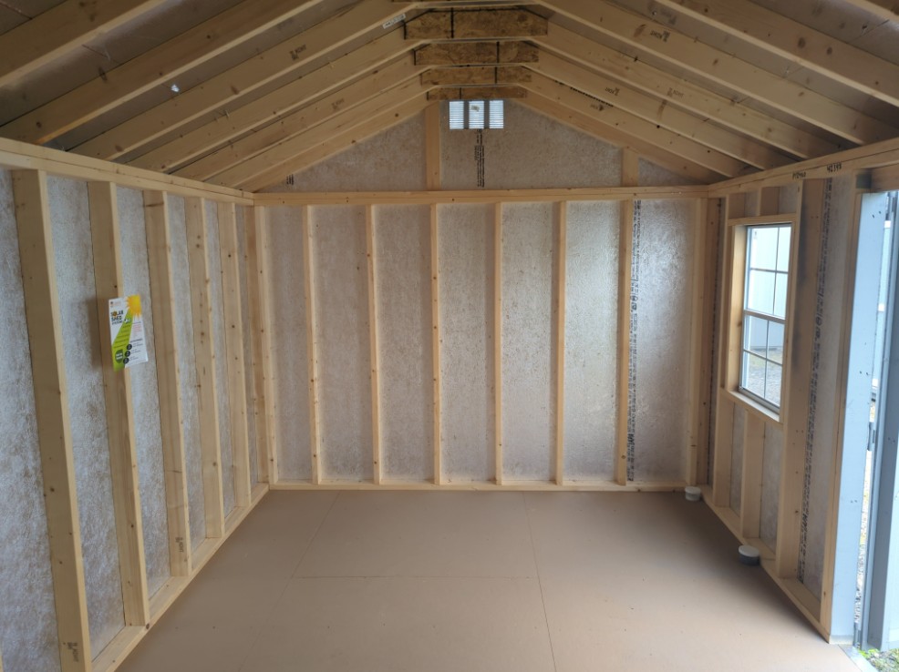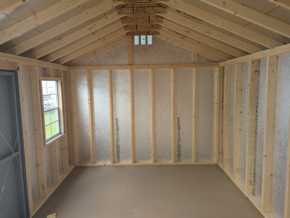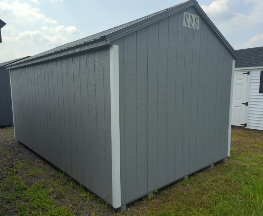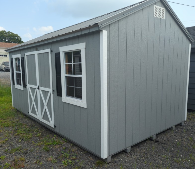 This 10×16 Cape-style shed blends timeless design with practical upgrades. Finished in Ronks Gray LP Smart Panel siding with crisp white trim and a charcoal roof, it offers a clean, classic exterior. A 5′ garden-style double door provides easy access. Two windows and deluxe garden vents enhance airflow and brightness. Inside, durable 3/4″ LP ProStruct flooring supports everyday use, making this Cape shed both attractive and highly functional.