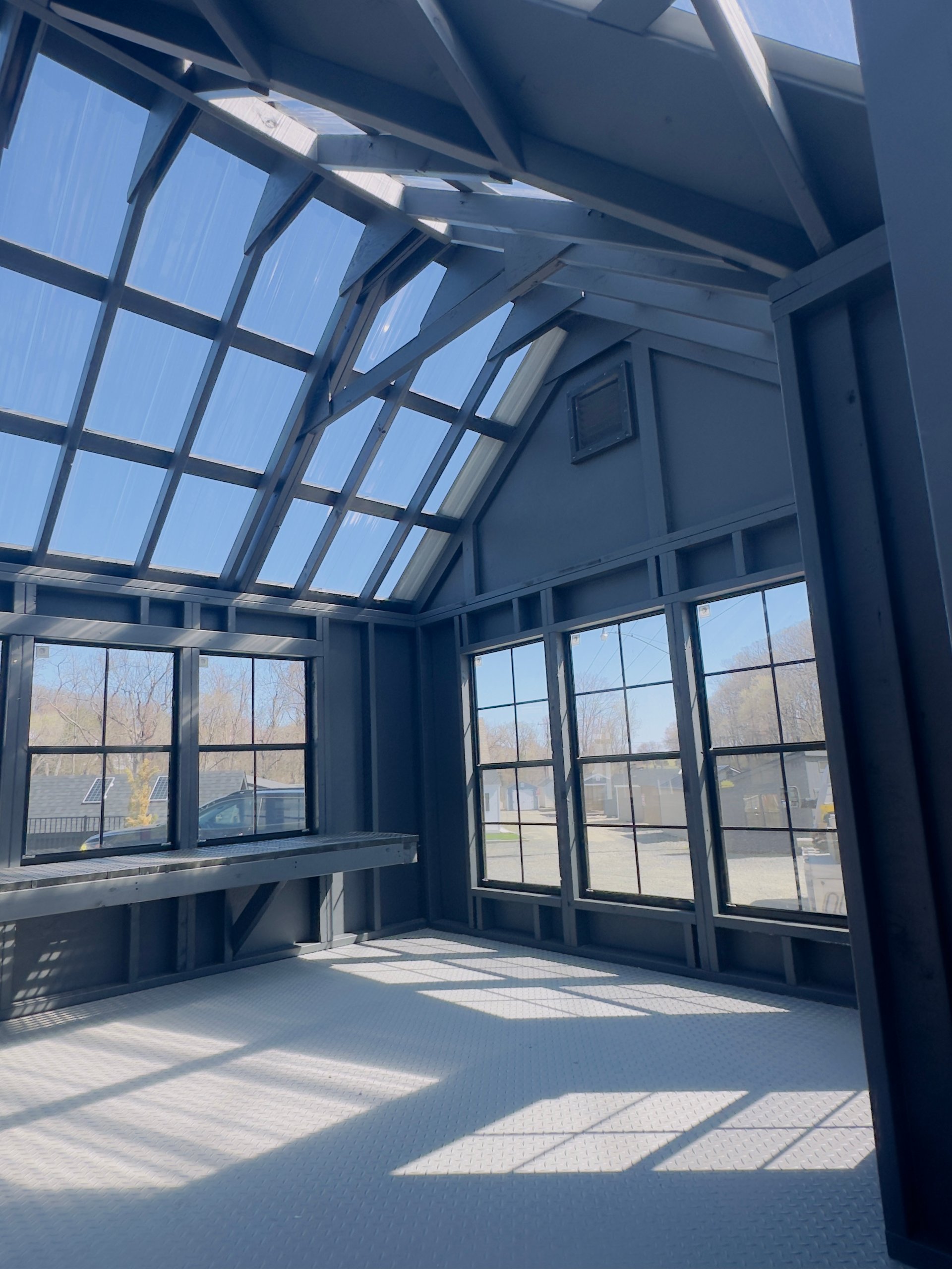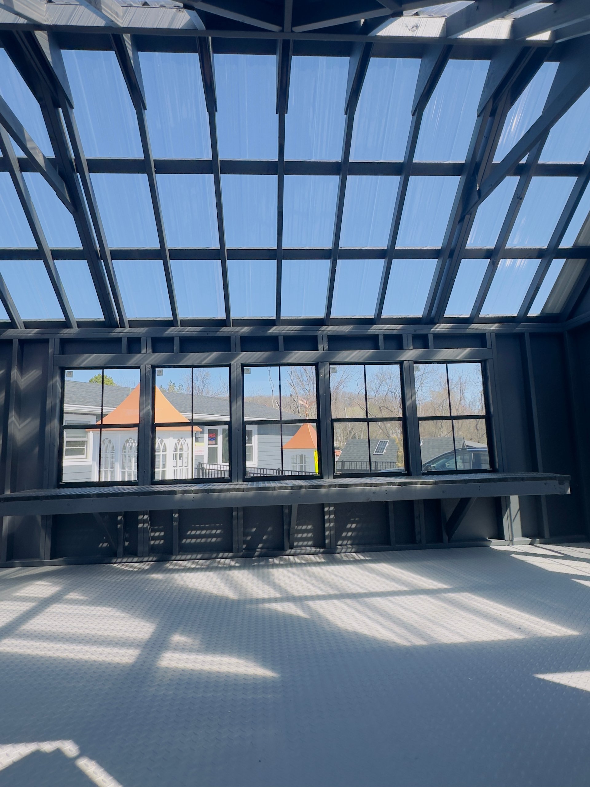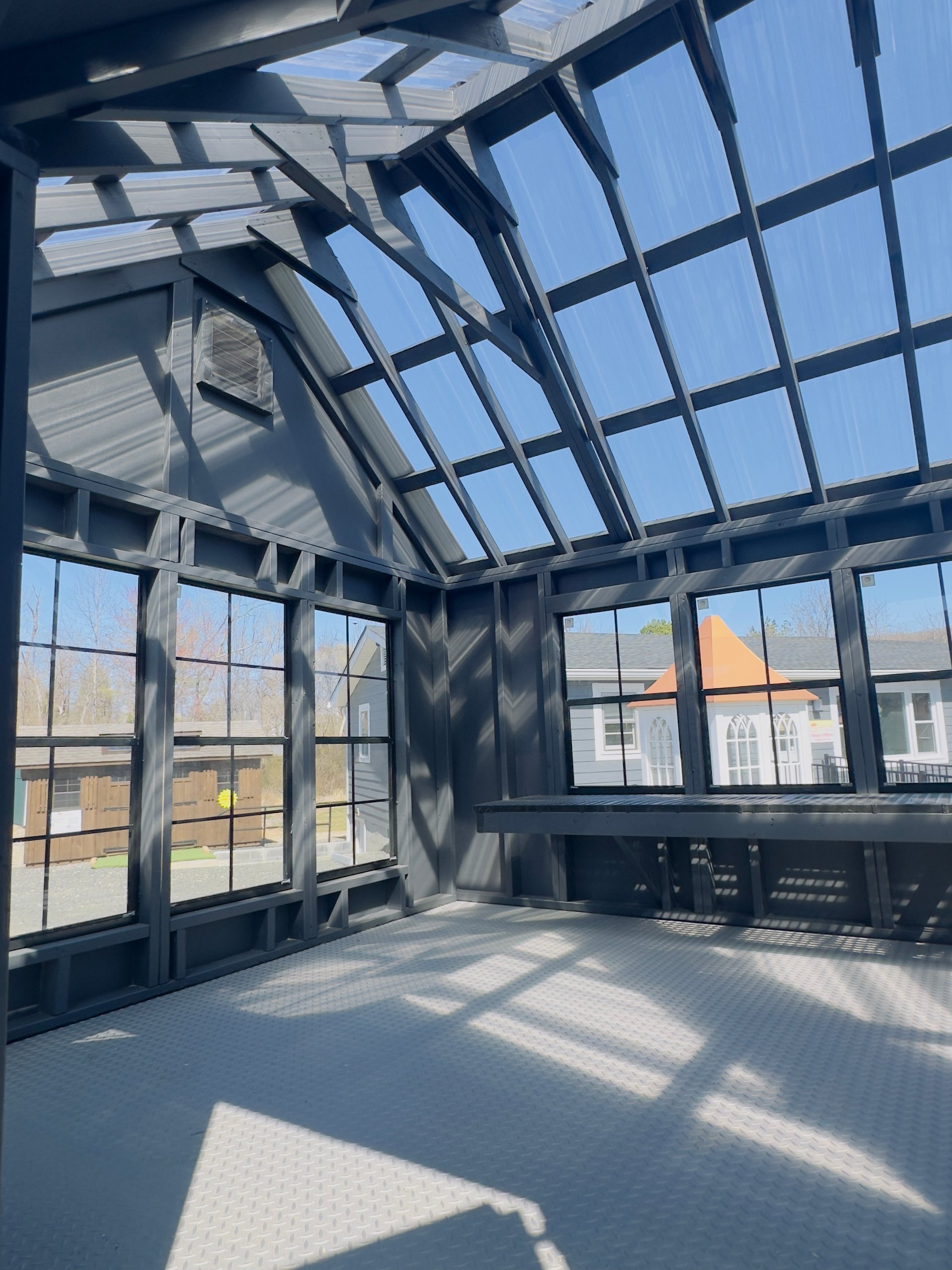 The 10×16 Victorian Greenhouse is designed for both beauty and function, featuring Mopboard LP Smart Panel siding, a clear metal roof for optimal sunlight, and a painted interior. With eight 24×48 black windows and five 24×36 black windows, it ensures superior ventilation and natural light. The greenhouse includes a durable Luxguard rubber floor, a 12’ greenhouse workbench, and a charming bump-out peak dormer. A pine door, additional 3’ single door, and extra window trim enhance its classic appeal. Built with LP Tech Shield roof sheeting and pressure-treated floor joists, this greenhouse provides a stylish and durable gardening space.
