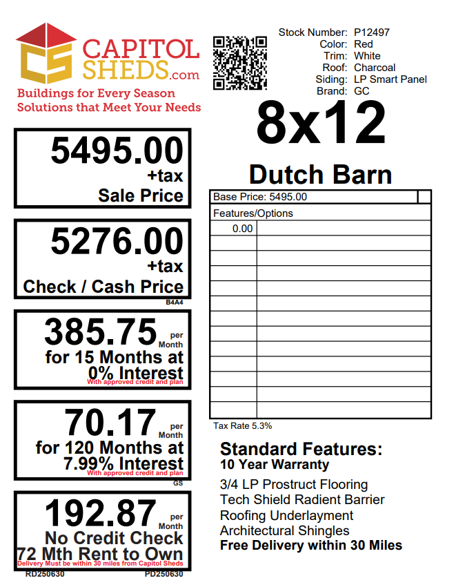 Reserve this building for a $500 deposit. Within 1 business day a rep will contact you to discuss delivery details and discounts you may qualify for such as cash/check, military/1st responder, etc. Don’t lose out on this beautiful building – Place your deposit today to hold it!