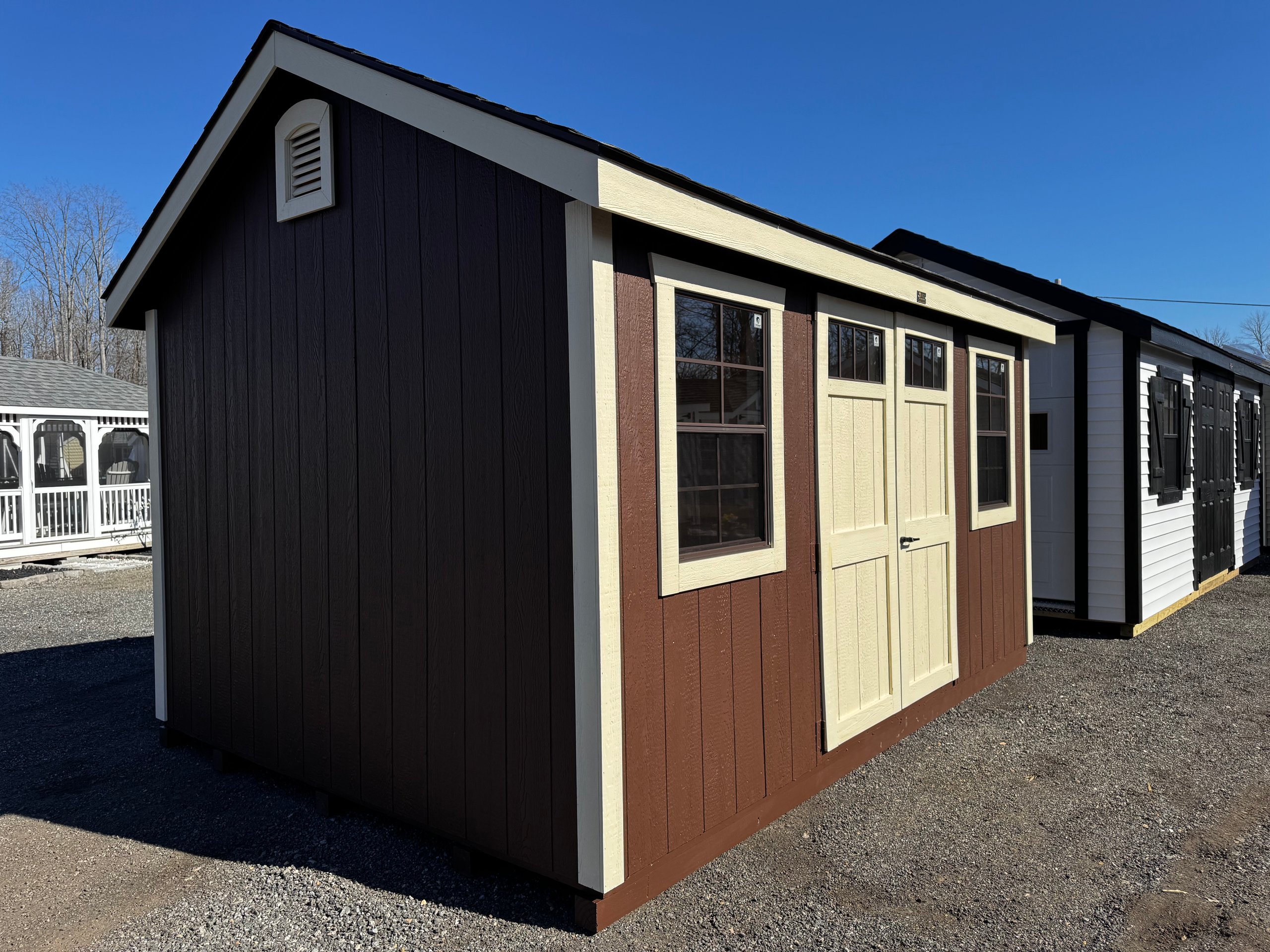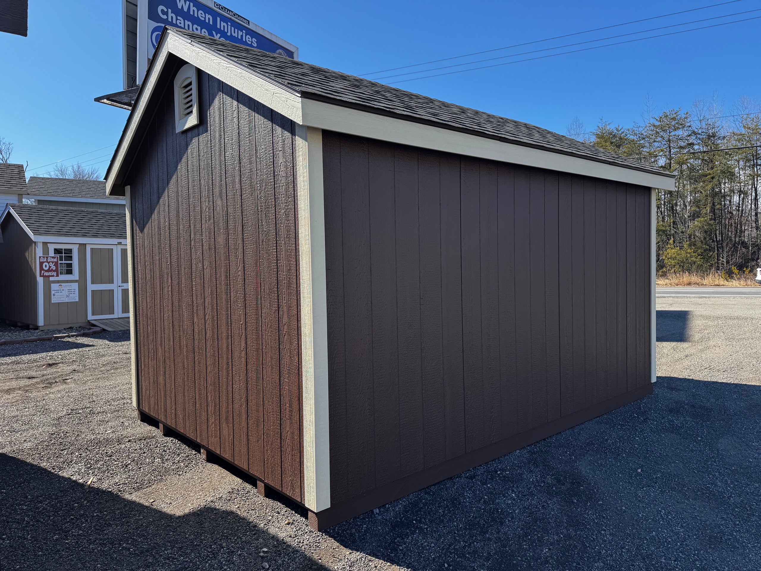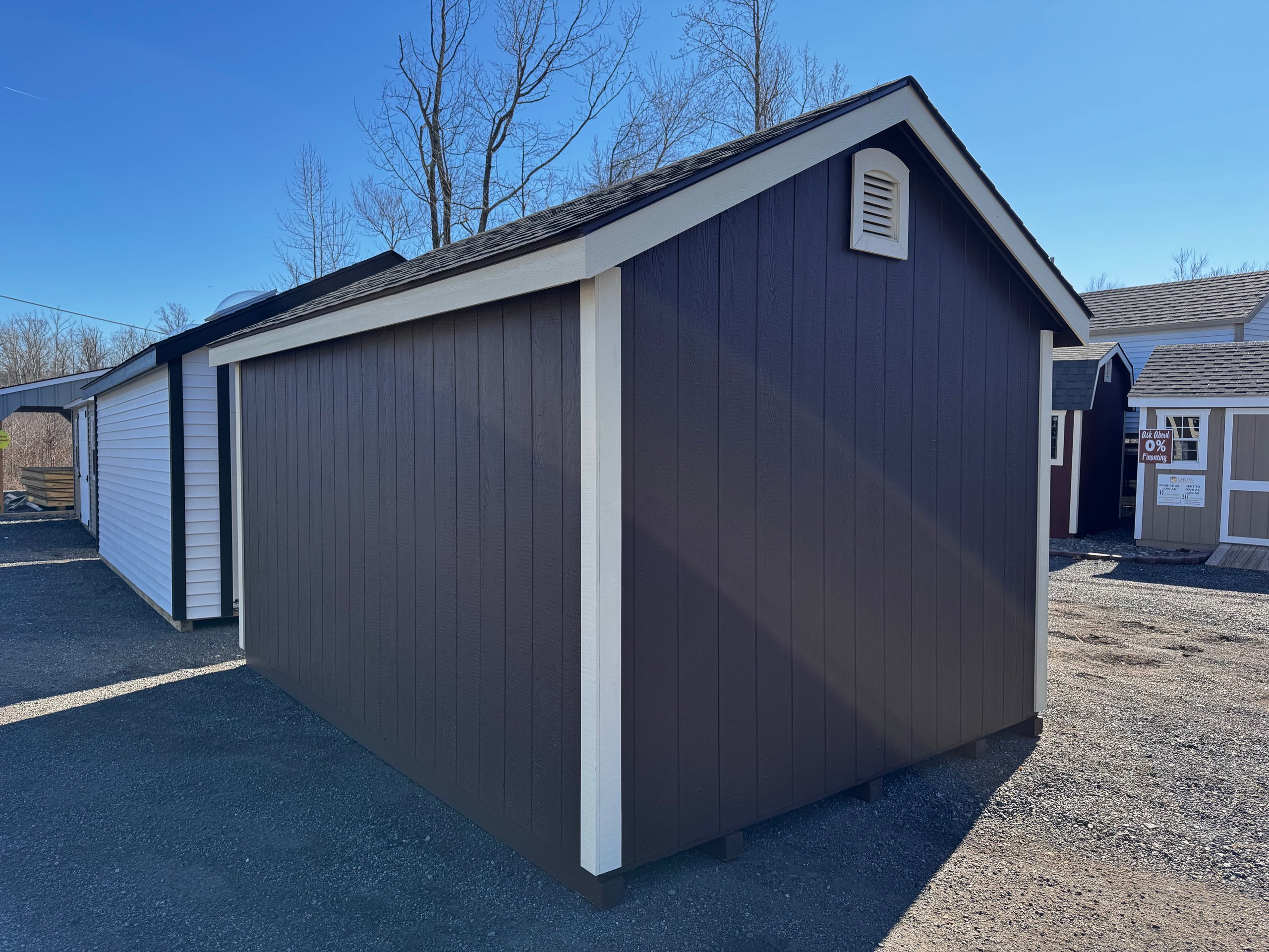Upgrade your backyard with this 10×14 Colonial A-Frame storage shed, built for durability and classic appeal. Featuring LP Smart Panel siding in Charcoal Brown with Navajo trim, this shed complements any landscape. The Weathered Wood shingle roof is supported by sturdy 2×4 framing, 16” on center, ensuring strength and longevity. Two upgraded 24×36 windows and a transom window provide natural light, while a Victorian vent enhances airflow. Inside, enjoy practical upgrades like a 24” workbench and 16” shelving for organized storage. Designed to last with LP Tech Shield roof sheeting and LP Prostruct flooring, this shed blends function and elegance.