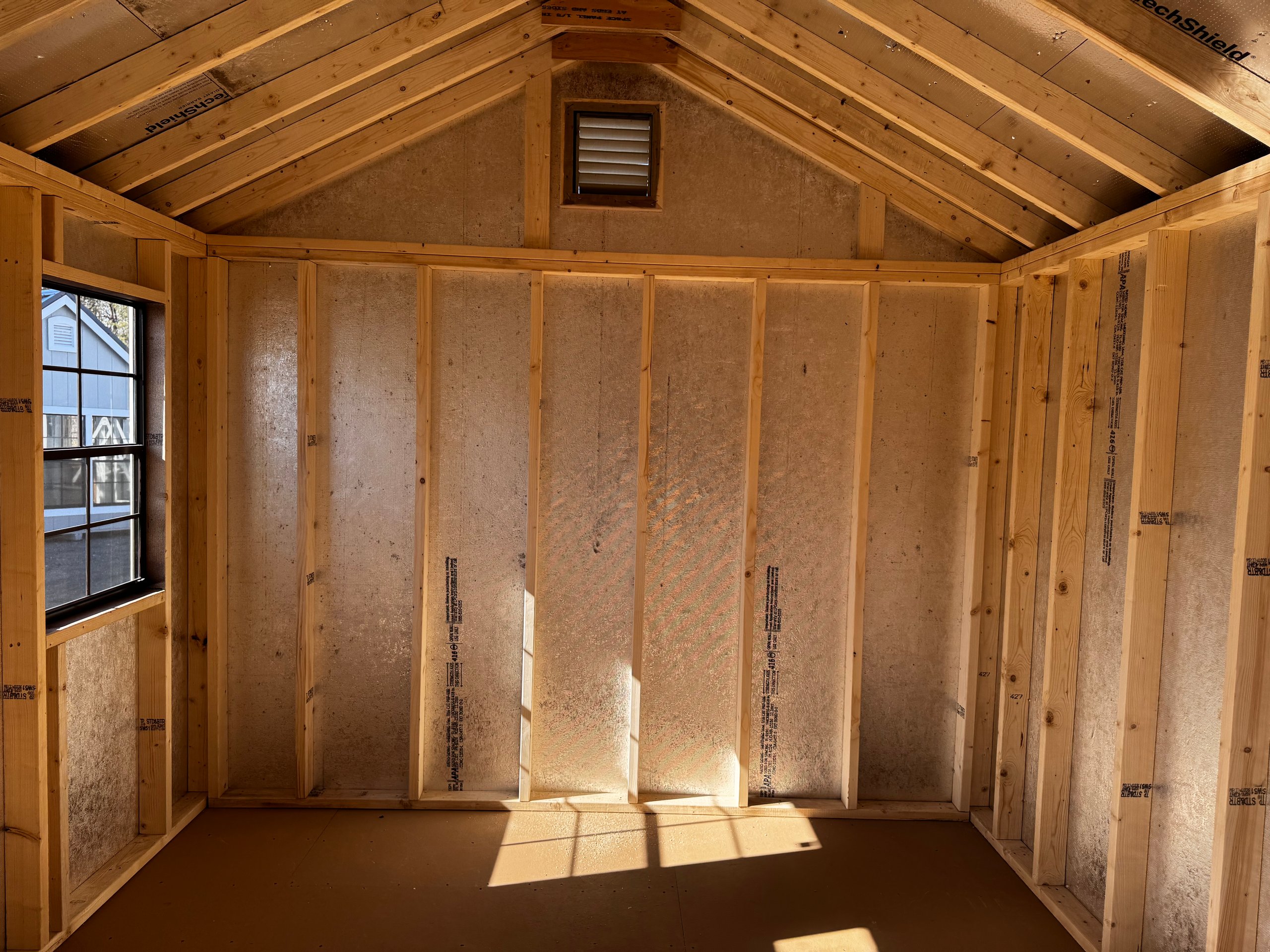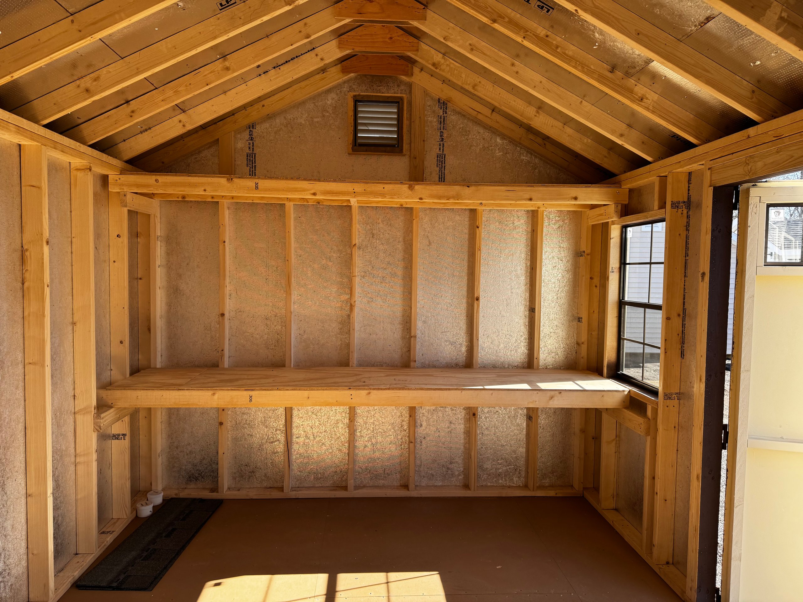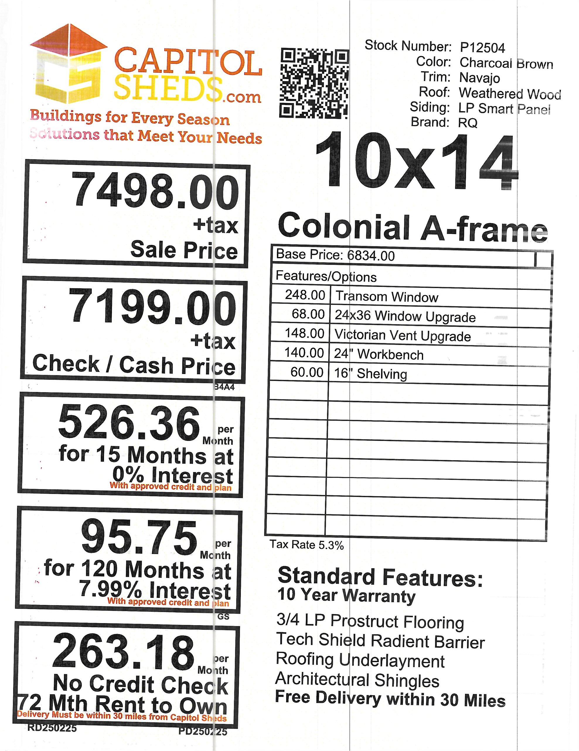 Upgrade your backyard with this 10×14 Colonial A-Frame storage shed, built for durability and classic appeal. Featuring LP Smart Panel siding in Charcoal Brown with Navajo trim, this shed complements any landscape. The Weathered Wood shingle roof is supported by sturdy 2×4 framing, 16” on center, ensuring strength and longevity. Two upgraded 24×36 windows and a transom window provide natural light, while a Victorian vent enhances airflow. Inside, enjoy practical upgrades like a 24” workbench and 16” shelving for organized storage. Designed to last with LP Tech Shield roof sheeting and LP Prostruct flooring, this shed blends function and elegance.