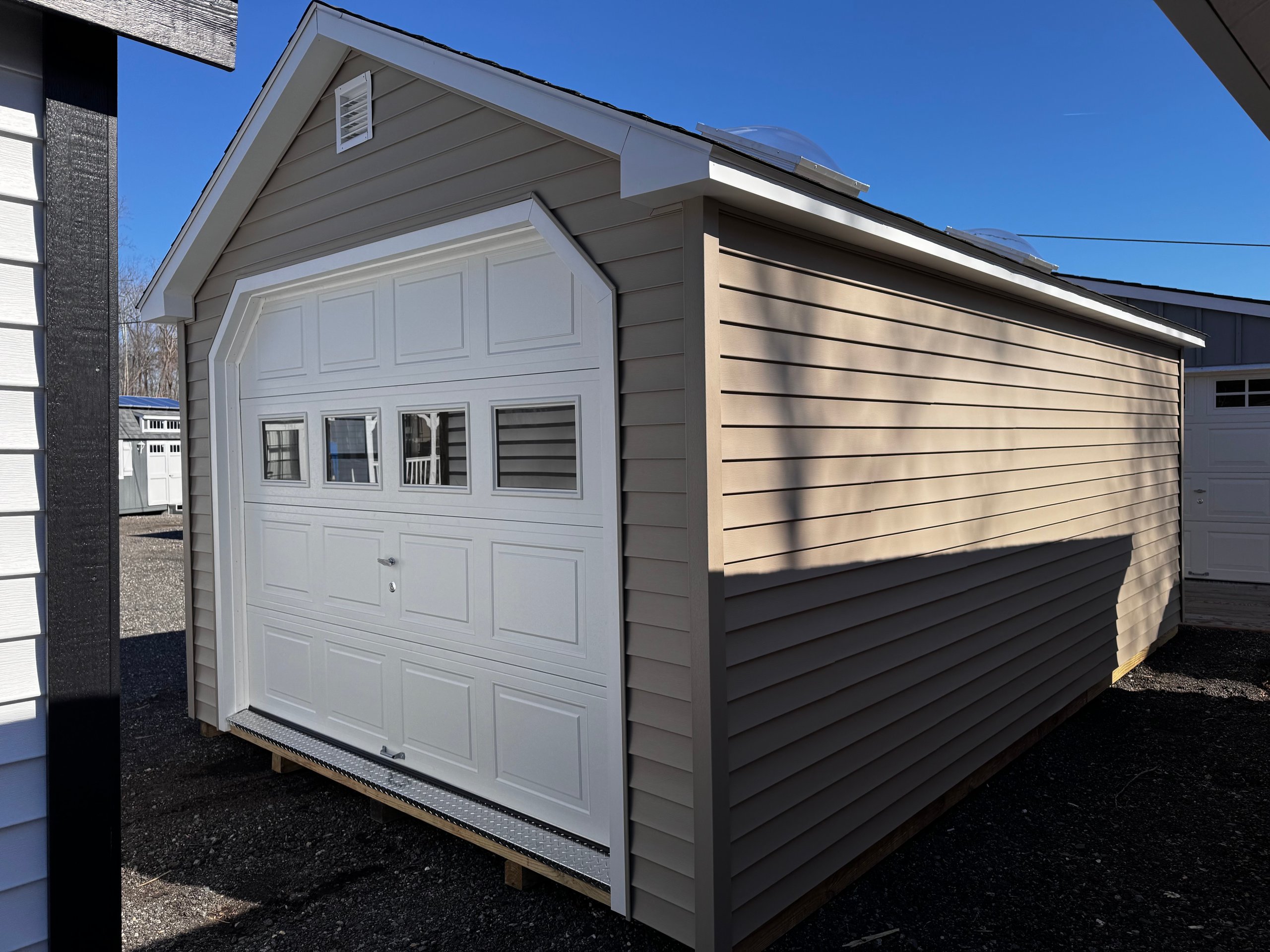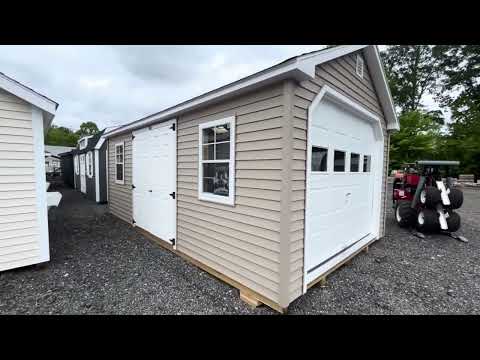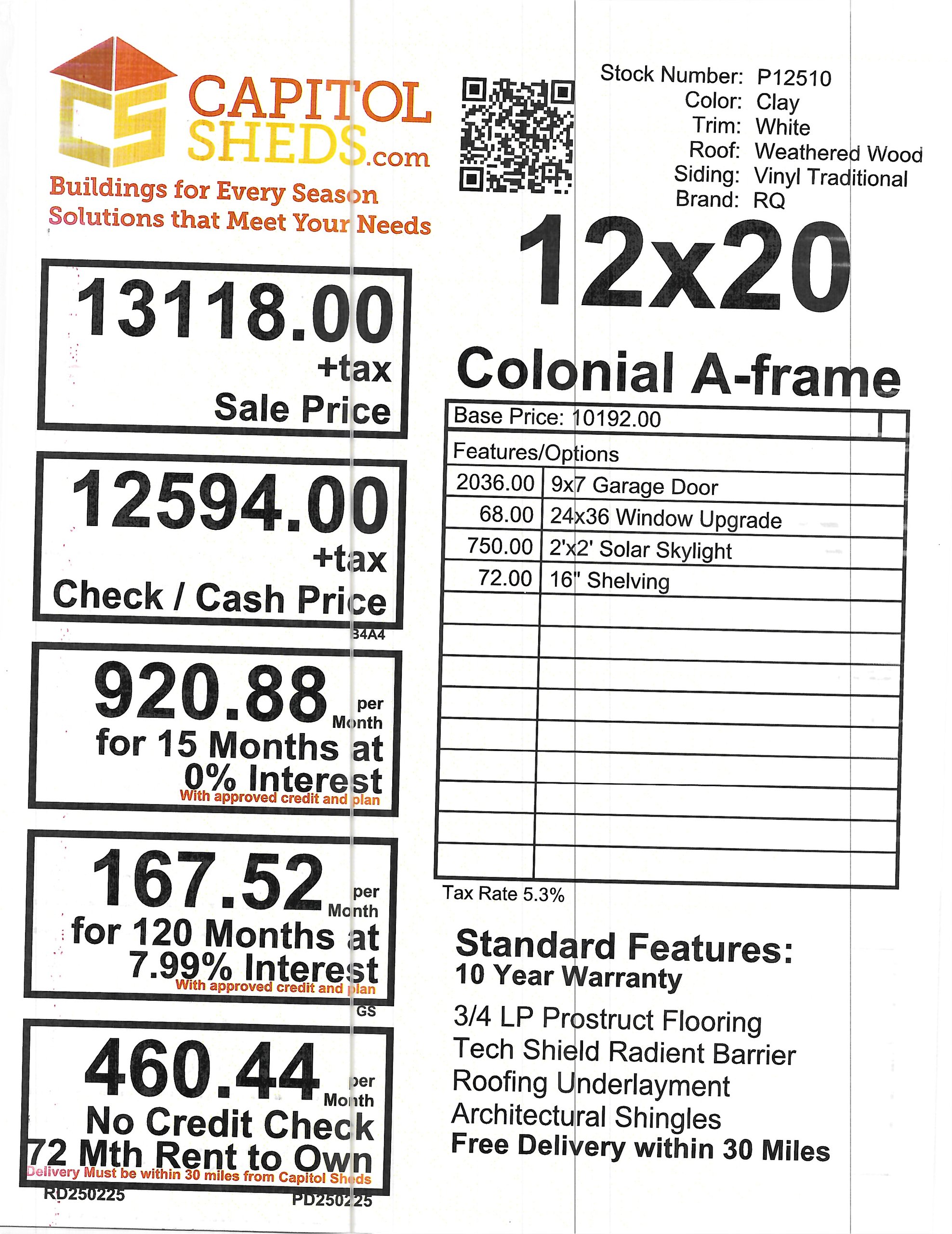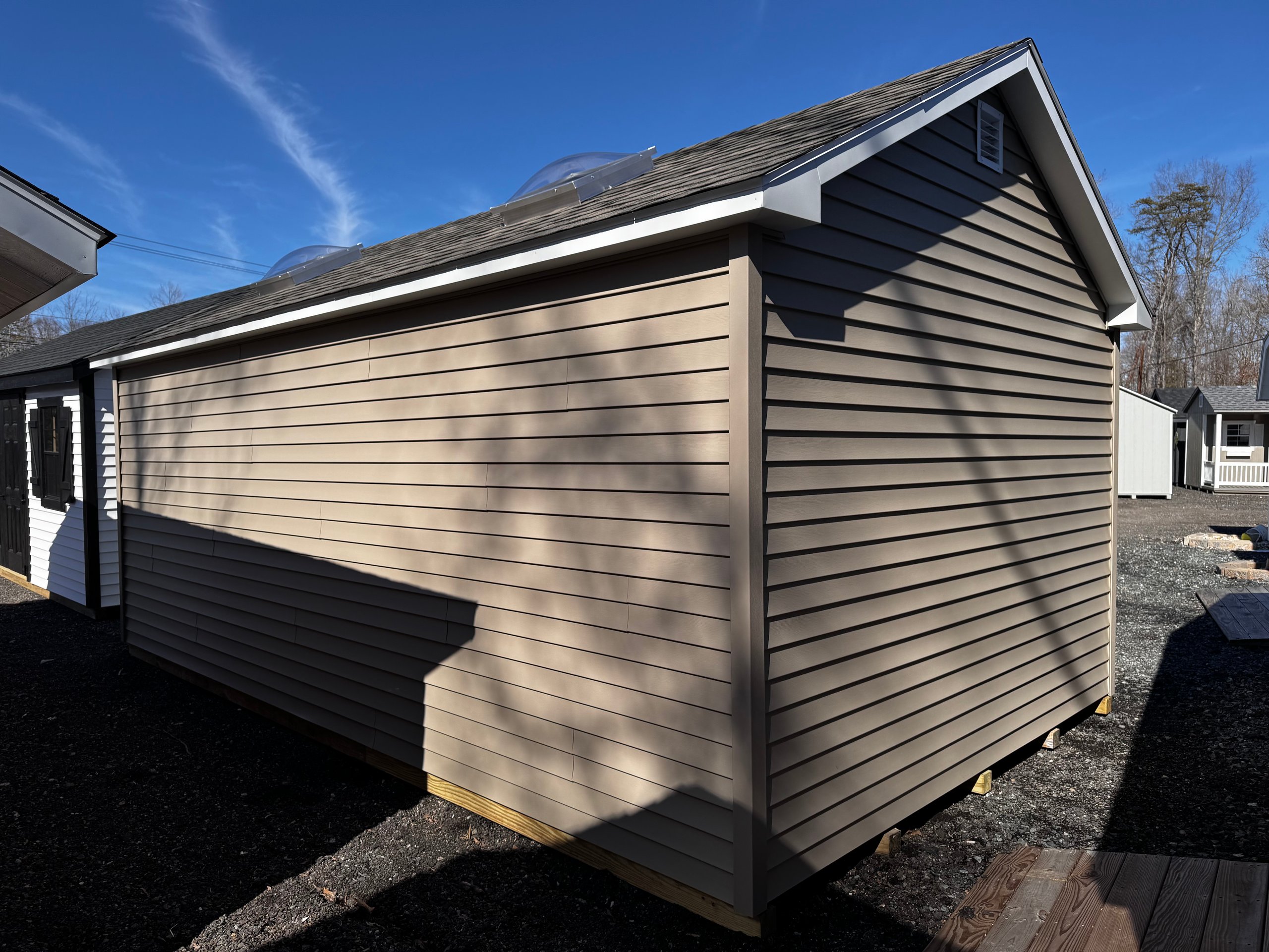 Enhance your storage space with this 12×20 Colonial A-Frame shed, featuring durable traditional vinyl siding in Clay with crisp White trim for a timeless look. The Weathered Wood shingle roof, supported by 2×4 framing (16” on center), offers lasting strength, while LP Tech Shield roof sheeting improves energy efficiency. Upgraded 24×36 windows and a 2’x2’ solar skylight provide ample natural light. A 9×7 garage door ensures easy access, perfect for larger equipment. Inside, 16” shelving offers organized storage. With LP Prostruct flooring and pressure-treated joists, this shed is built for durability and function.