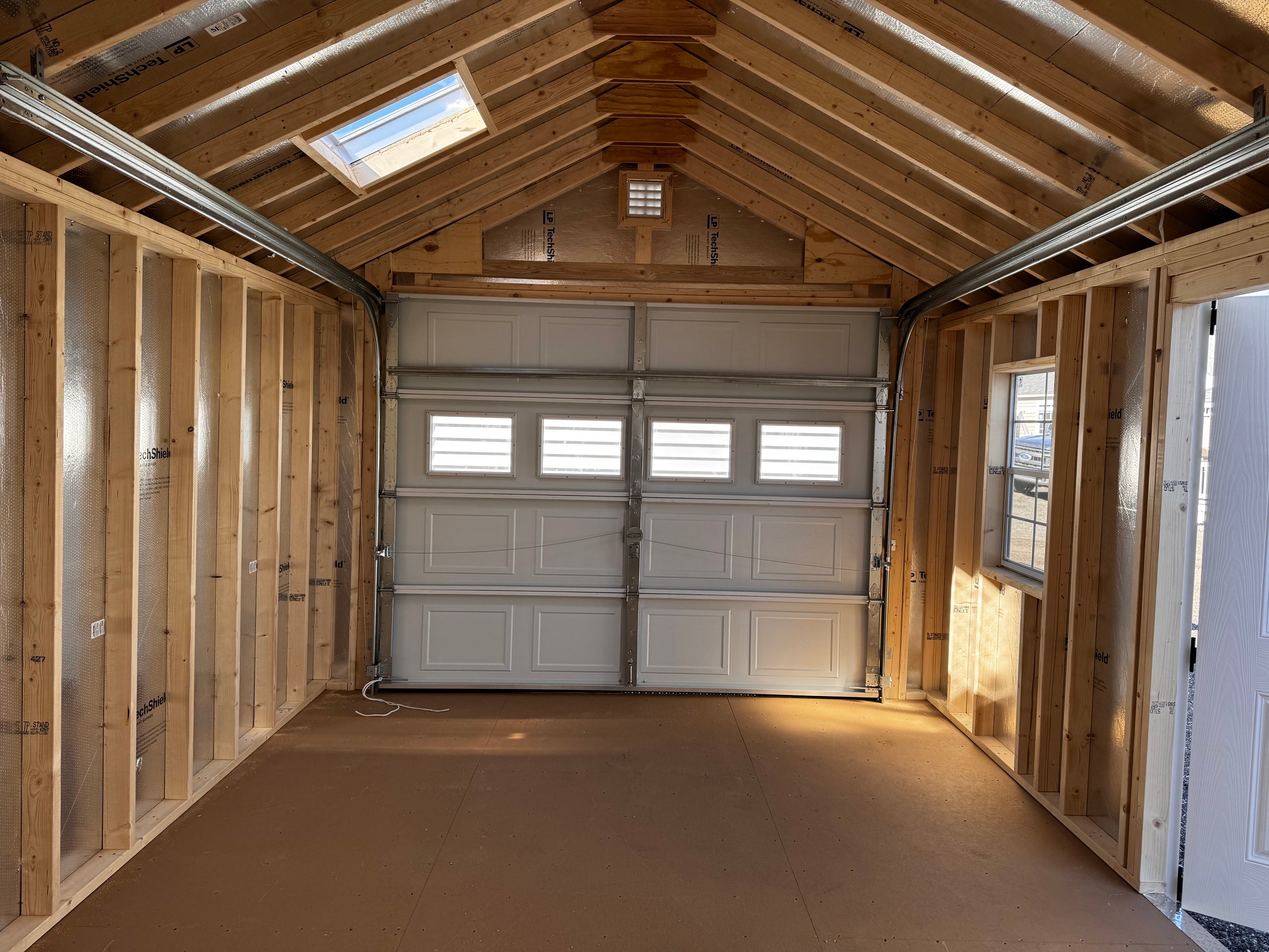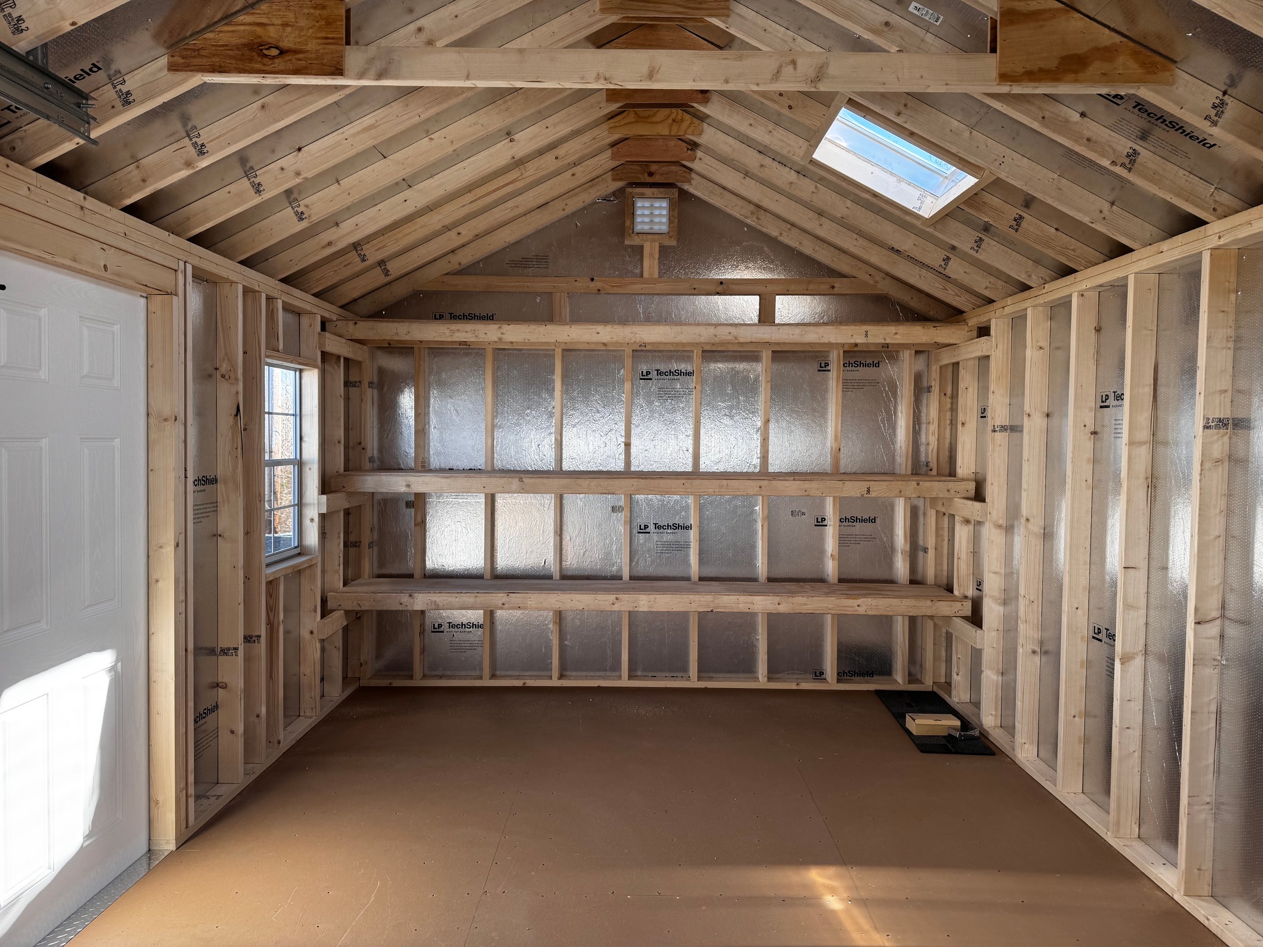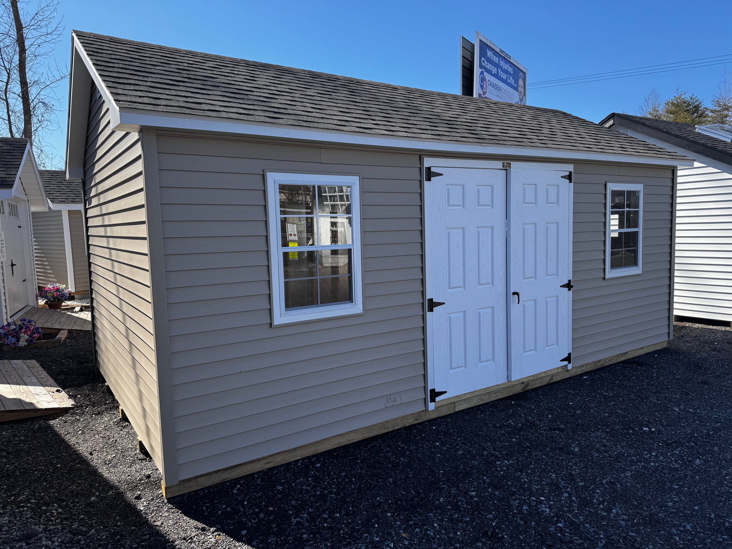 Enhance your storage space with this 12×20 Colonial A-Frame shed, featuring durable traditional vinyl siding in Clay with crisp White trim for a timeless look. The Weathered Wood shingle roof, supported by 2×4 framing (16” on center), offers lasting strength, while LP Tech Shield roof sheeting improves energy efficiency. Upgraded 24×36 windows and a 2’x2’ solar skylight provide ample natural light. A 9×7 garage door ensures easy access, perfect for larger equipment. Inside, 16” shelving offers organized storage. With LP Prostruct flooring and pressure-treated joists, this shed is built for durability and function.