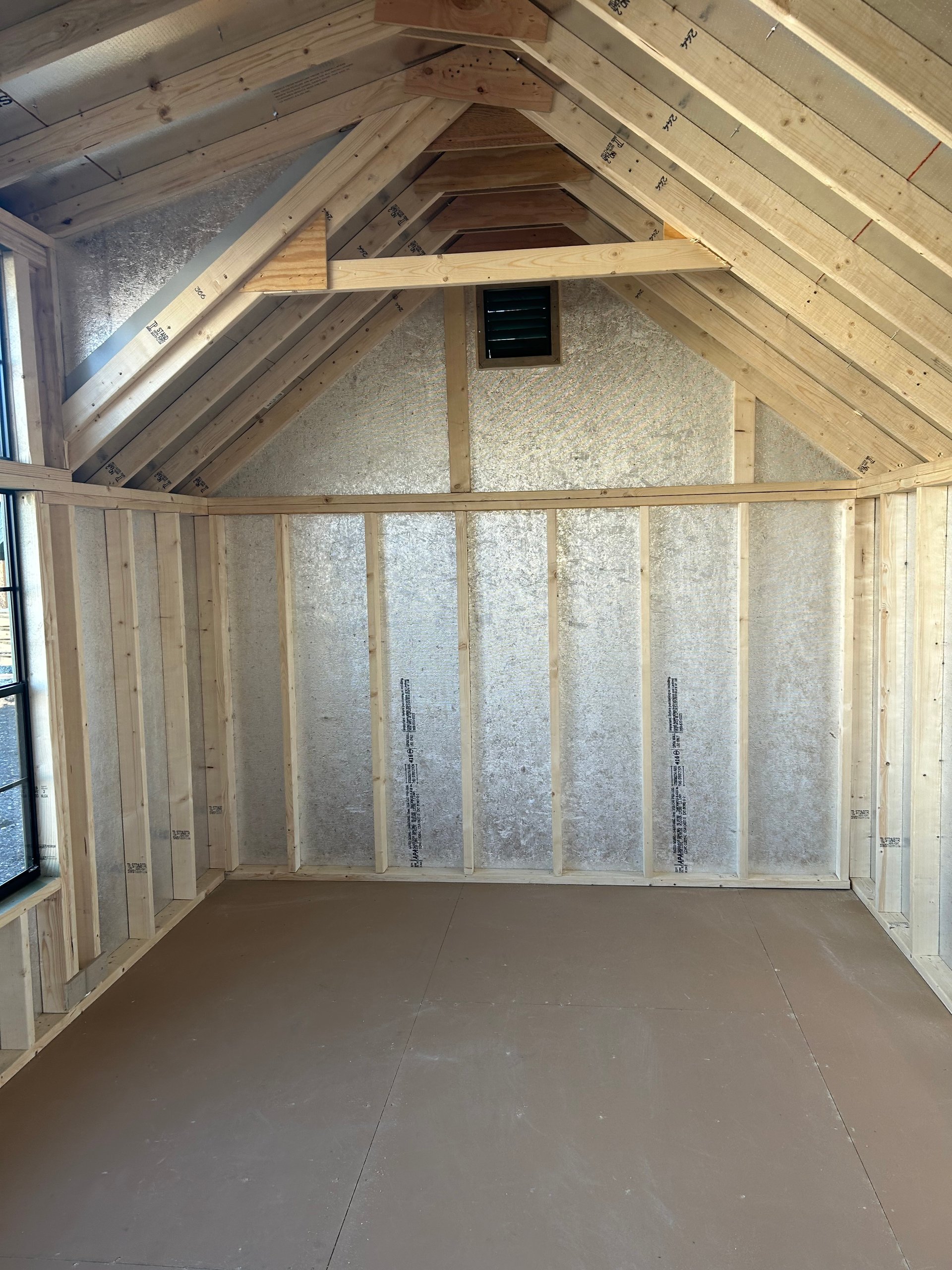 The 10×16 Victorian A-frame offers a sophisticated blend of function and style. Featuring LP Smart Panel siding in Pequea Green with a Copper Metallic metal roof upgrade, it combines durability with eye-catching design. The structure includes 2×4 wall and roof framing at 16” on center, LP Tech Shield roof sheeting, and LP T&G Prostruct flooring. Enhancing its modern appeal are black transom windows, three black 24×48 windows, and a striking modern farmhouse 3-transom dormer. With custom paint and a uniquely colored metal roof, this shed is a premium choice for those looking for both elegance and practicality.