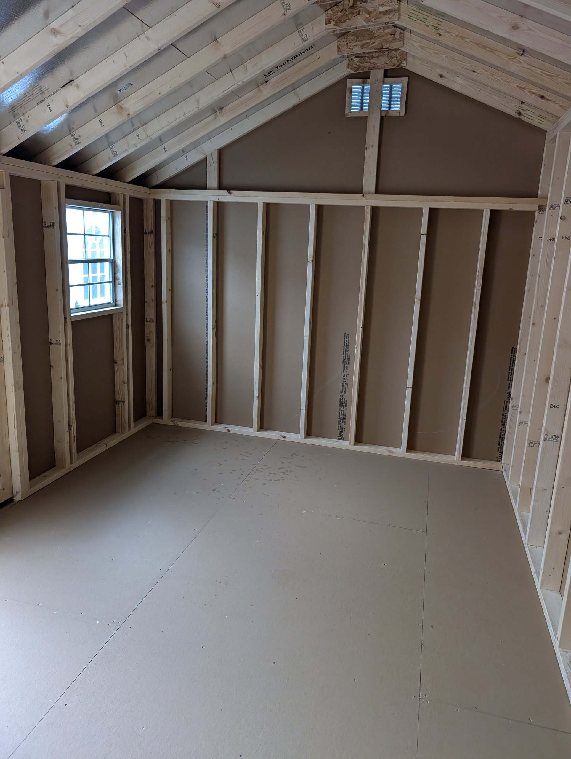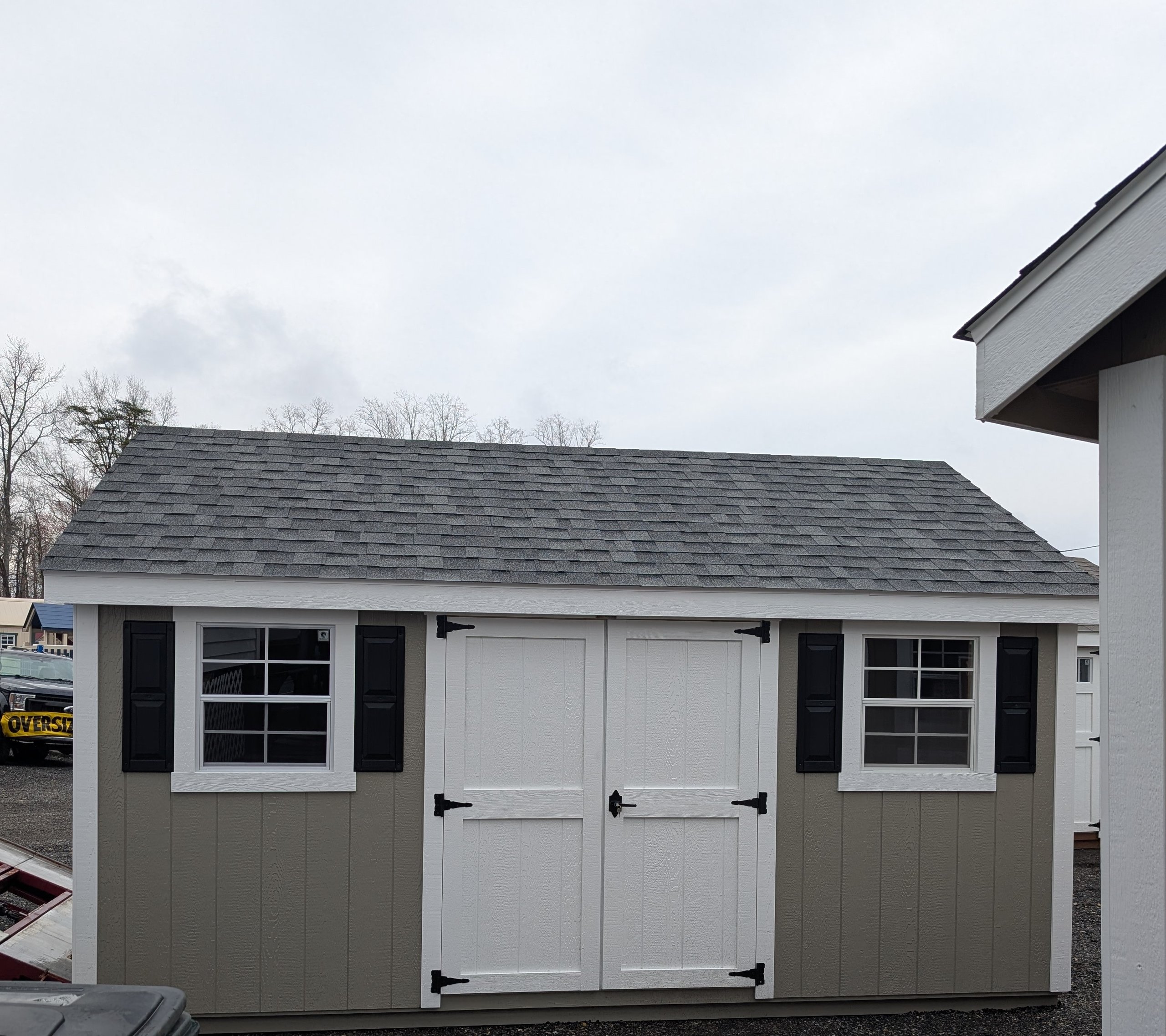 This 10×16 Reverse Saltbox shed combines traditional aesthetics with practical storage. It features LP Smart Panel siding in clay with a pewter roof and white trim. The shed includes a garden door upgrade, and two windows for natural light with shutter upgrade. The sturdy construction includes 3/4″ LP Prostruct flooring and a Tech Shield radiant barrier to help regulate temperature. Ideal for homeowners looking for a stylish and functional storage solution.
