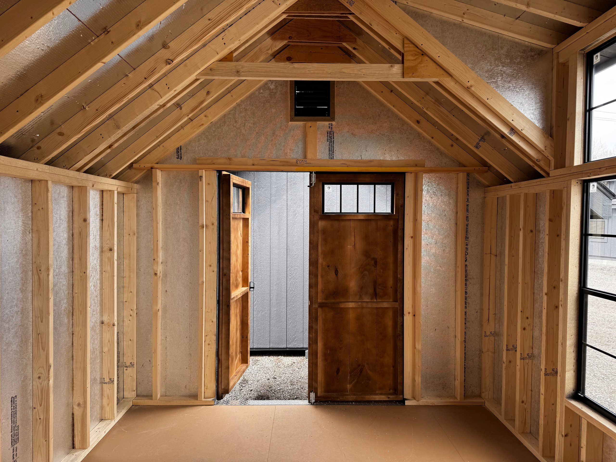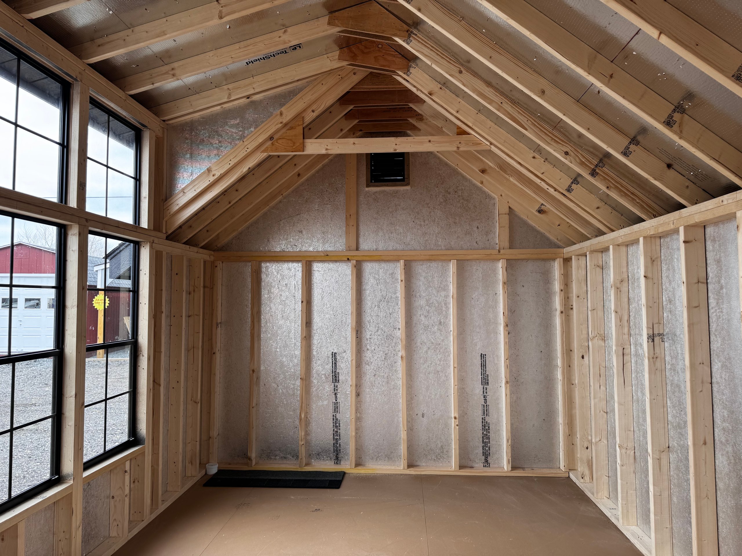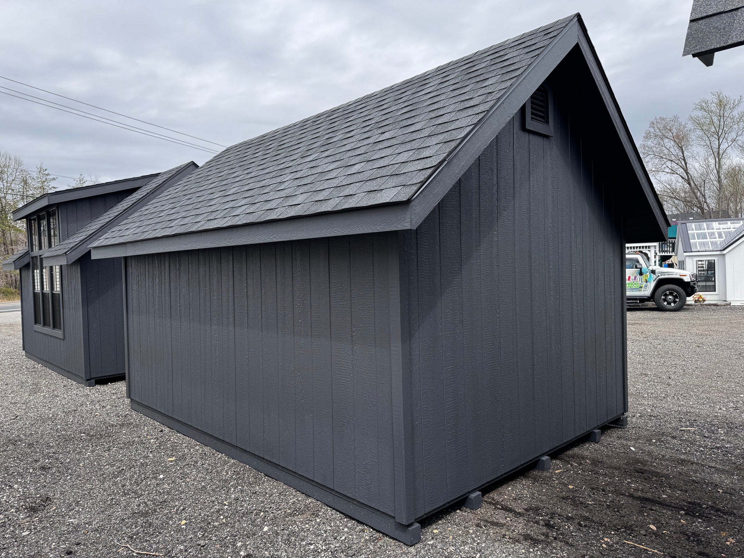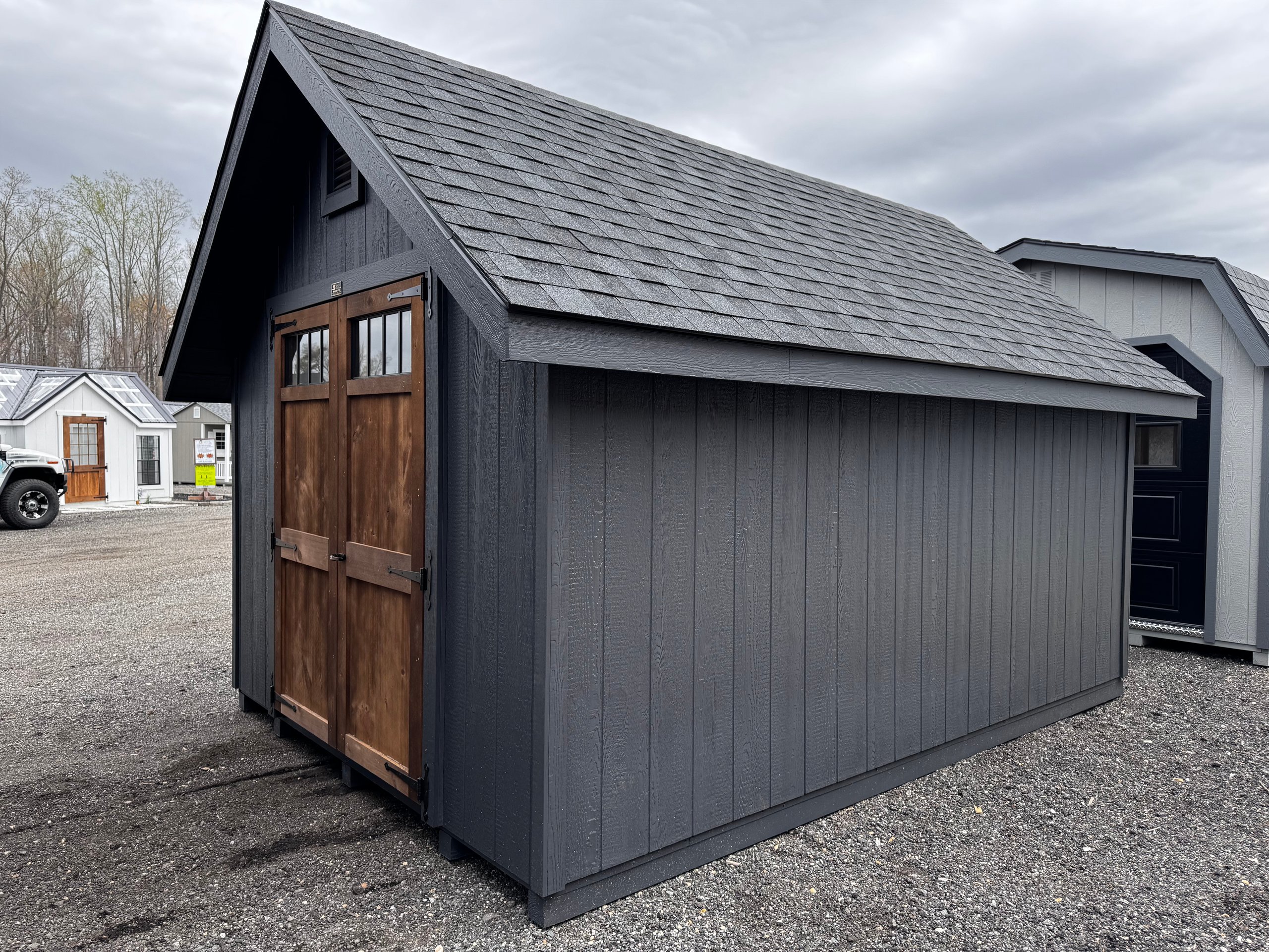 Elevate your backyard with the Victorian A-Frame 10×14 Amish-Built Storage Shed, blending timeless design with unmatched craftsmanship. Featuring LP Smart Panel siding in a striking Mopboard finish, black architectural shingles, and a modern farmhouse 3-transom dormer, this shed offers both beauty and durability. Eight 24×28 black windows and transom windows on the pine double doors provide natural light. Built with pressure-treated 2×4 framing, LP Tech Shield roof sheeting, and ¾” LP Prostruct flooring, this shed is designed to last. Whether for storage, a workshop, or a garden retreat, this elegant structure delivers function and style.
