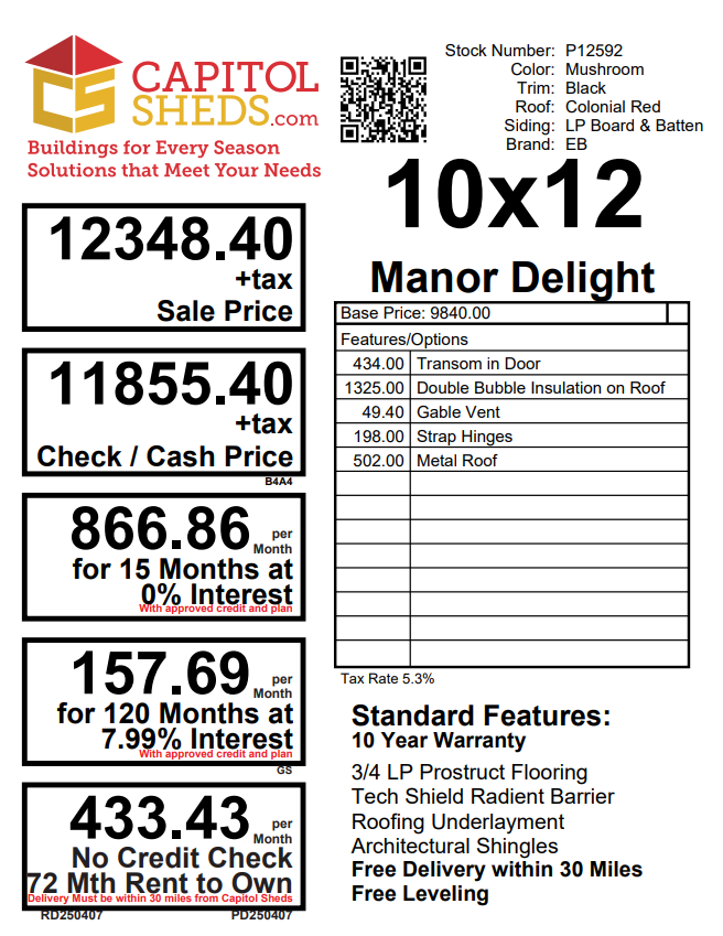 Reserve this building for a $500 deposit. Within 1 business day a rep will contact you to discuss delivery details and discounts you may qualify for such as cash/check, military/1st responder, etc. Don’t lose out on this beautiful building – Place your deposit today to hold it!