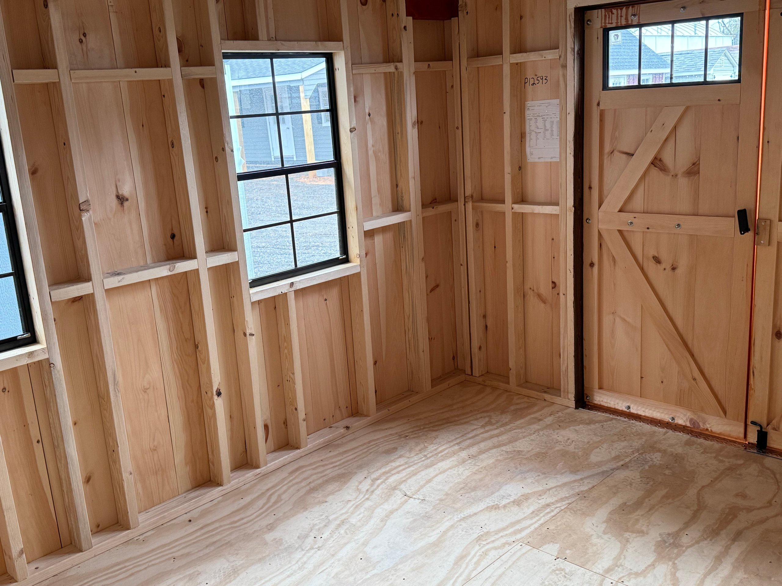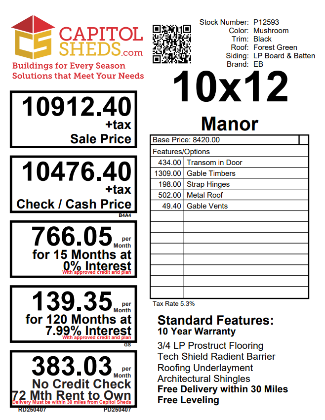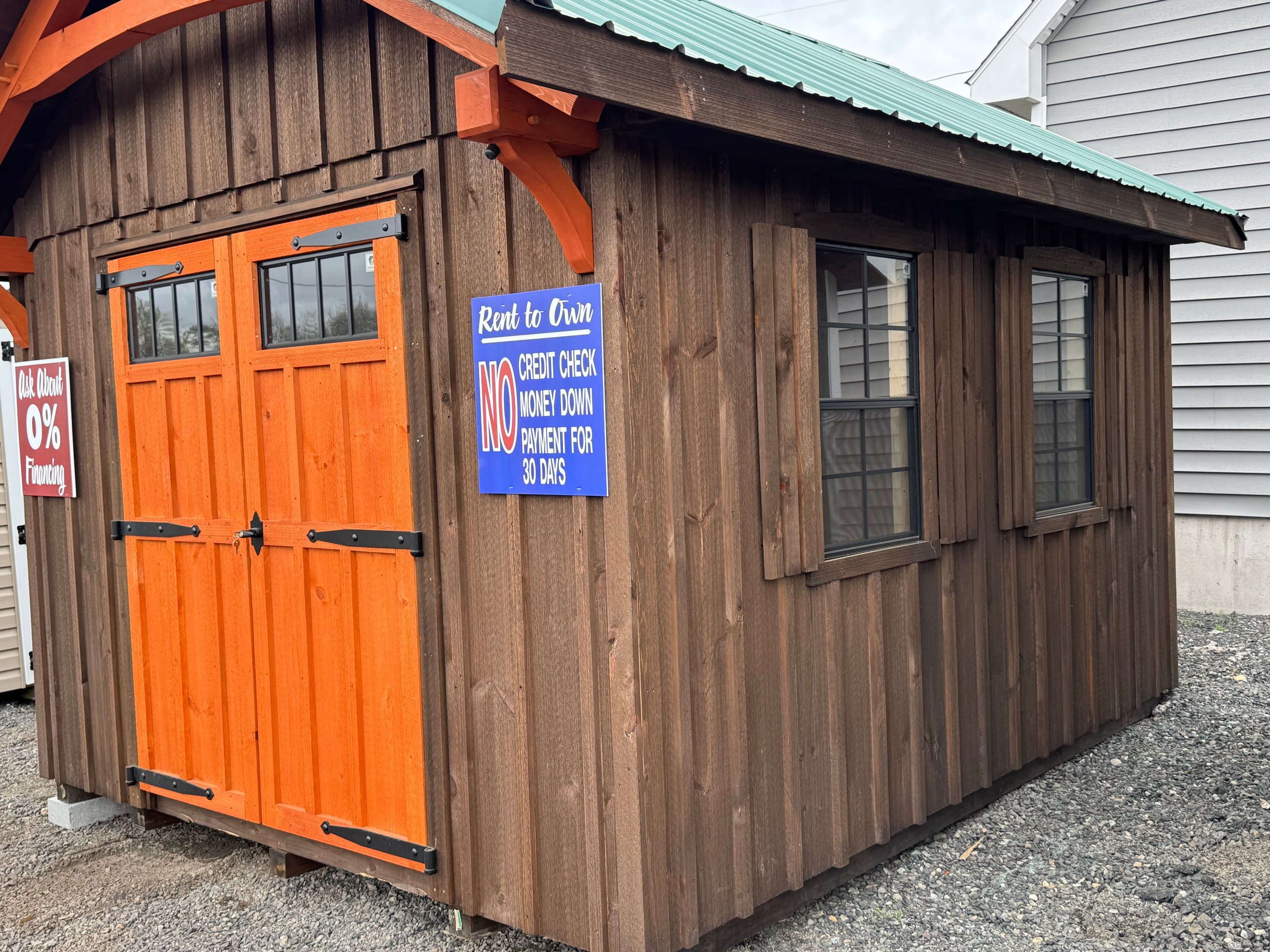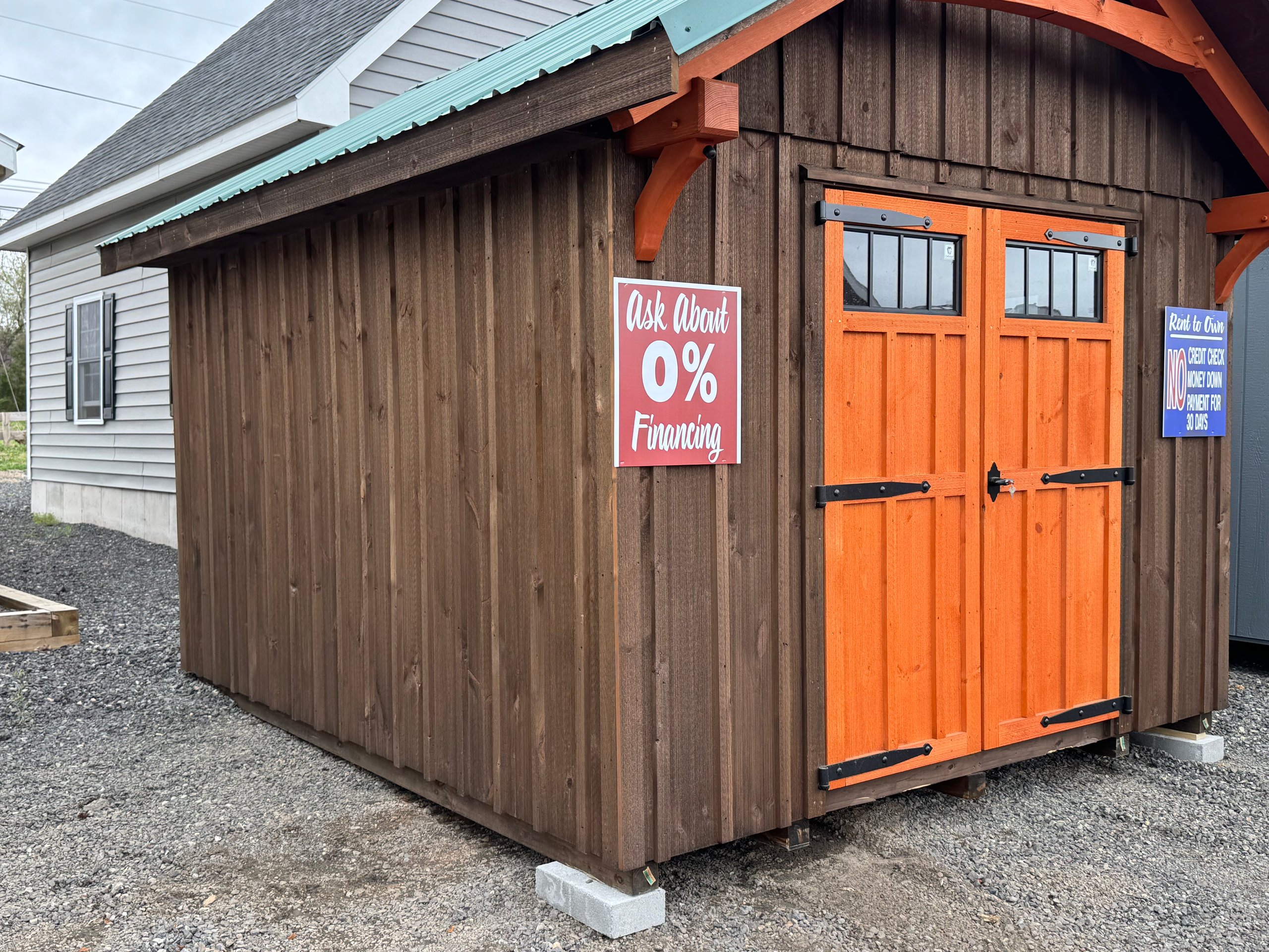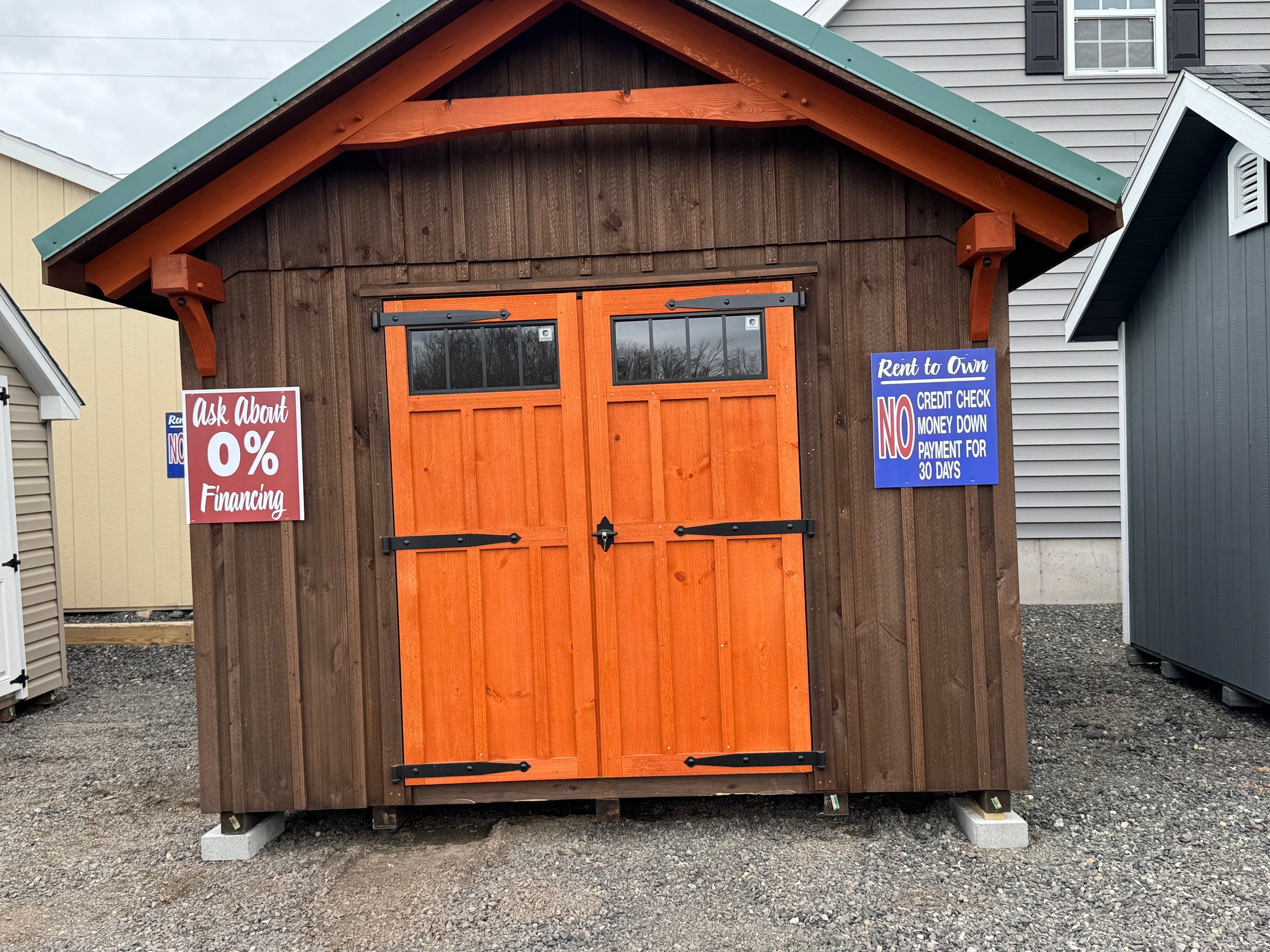 Crafted with timeless Amish craftsmanship, the 10×12 Manor storage shed combines rustic elegance with lasting durability. Featuring pine board & batten siding in a rich mushroom stain, accented by bold black trim and a striking forest green metal roof, it’s as beautiful as it is functional. Two windows and double doors offer natural light and easy access, while tar paper underlayment adds extra protection. Whether for tools, garden gear, or seasonal storage, this shed is a charming, practical addition to any backyard.
