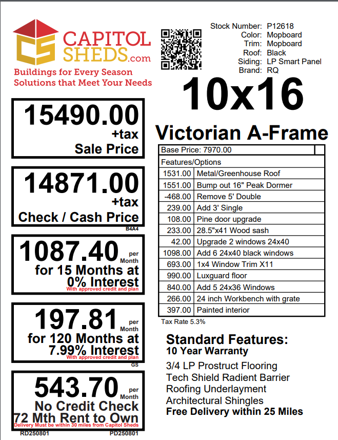 Reserve this building for a $500 deposit. Within 1 business day a rep will contact you to discuss delivery details and discounts you may qualify for such as cash/check, military/1st responder, etc. Don’t lose out on this beautiful building – Place your deposit today to hold it!