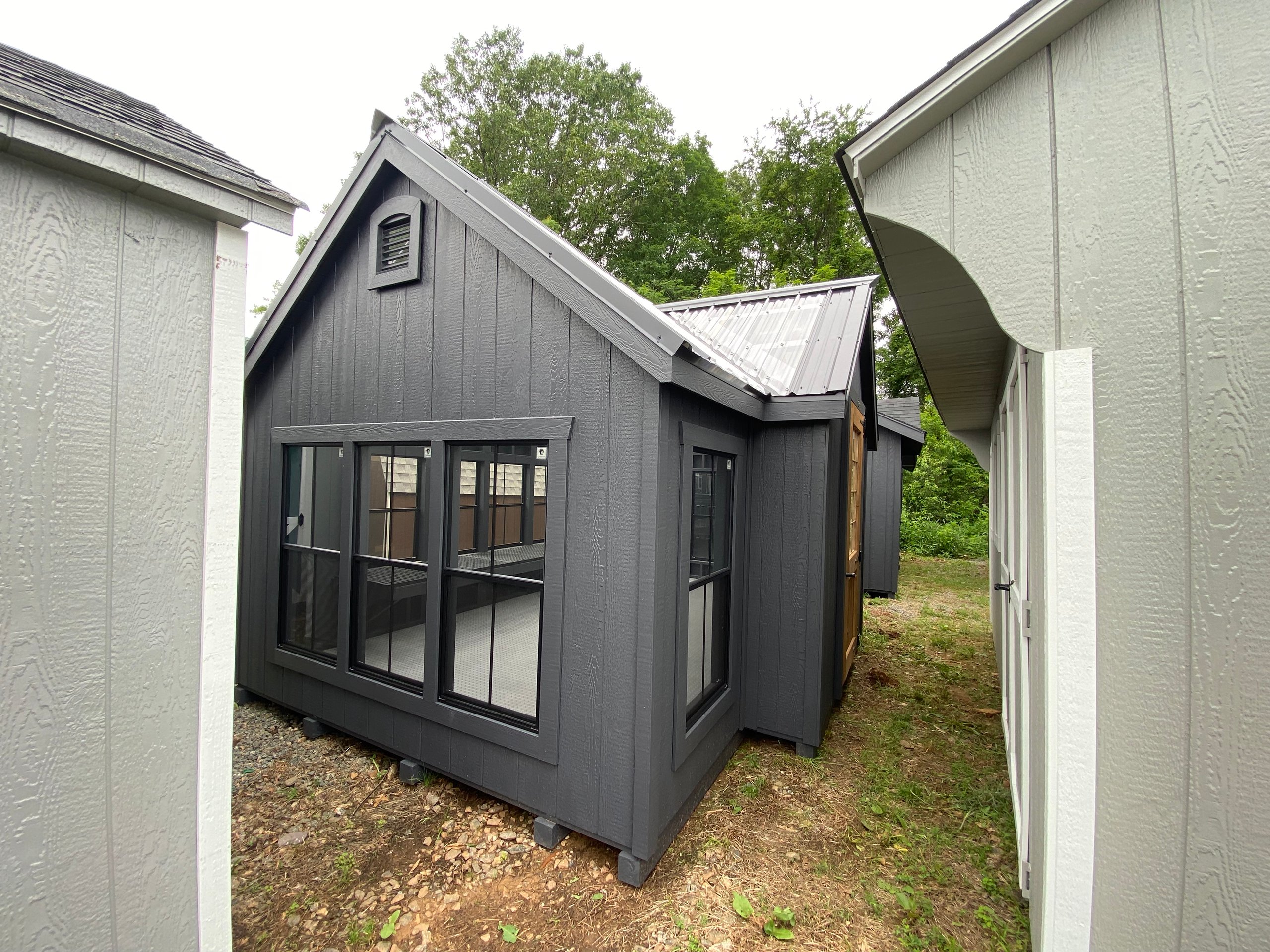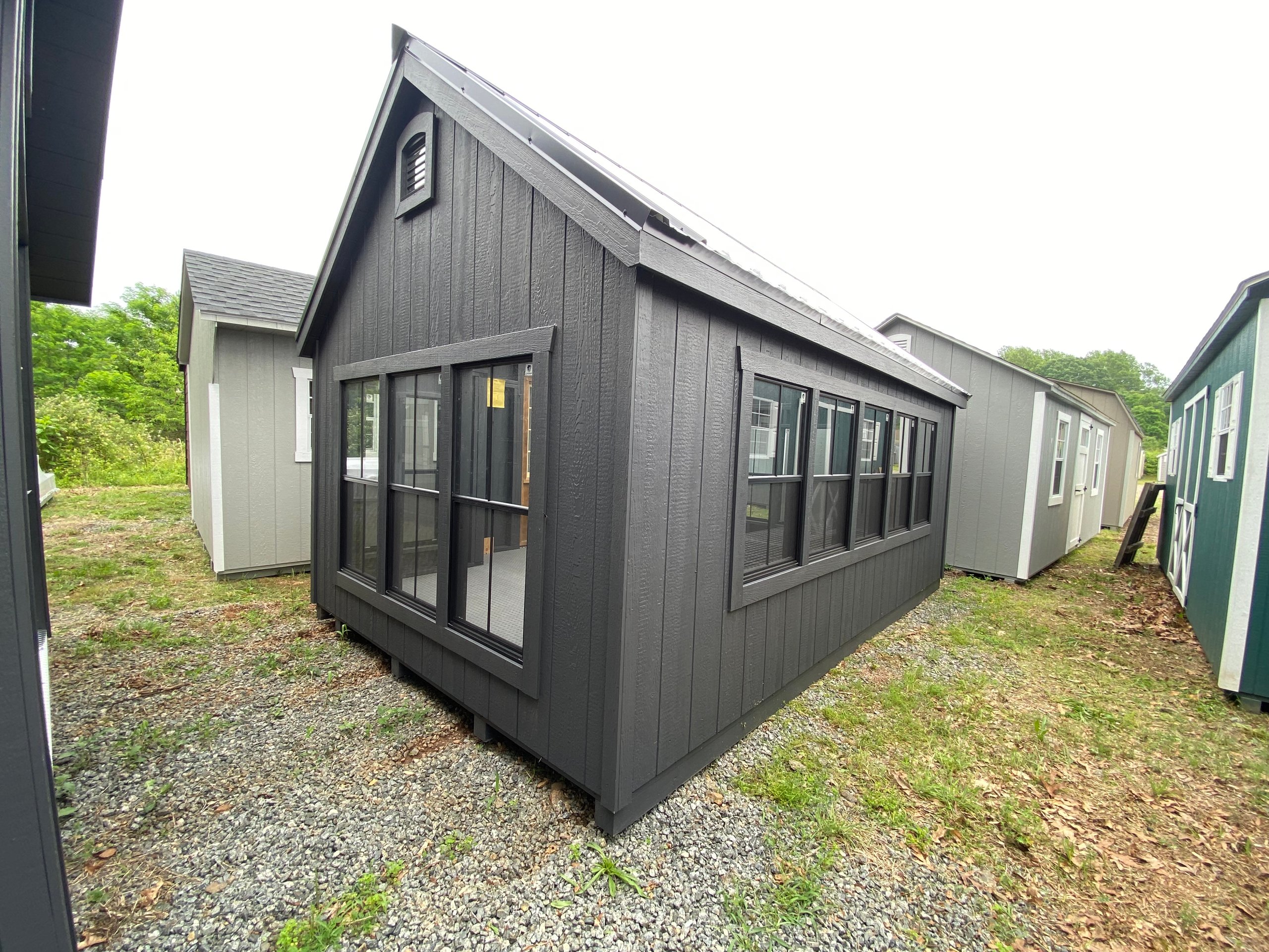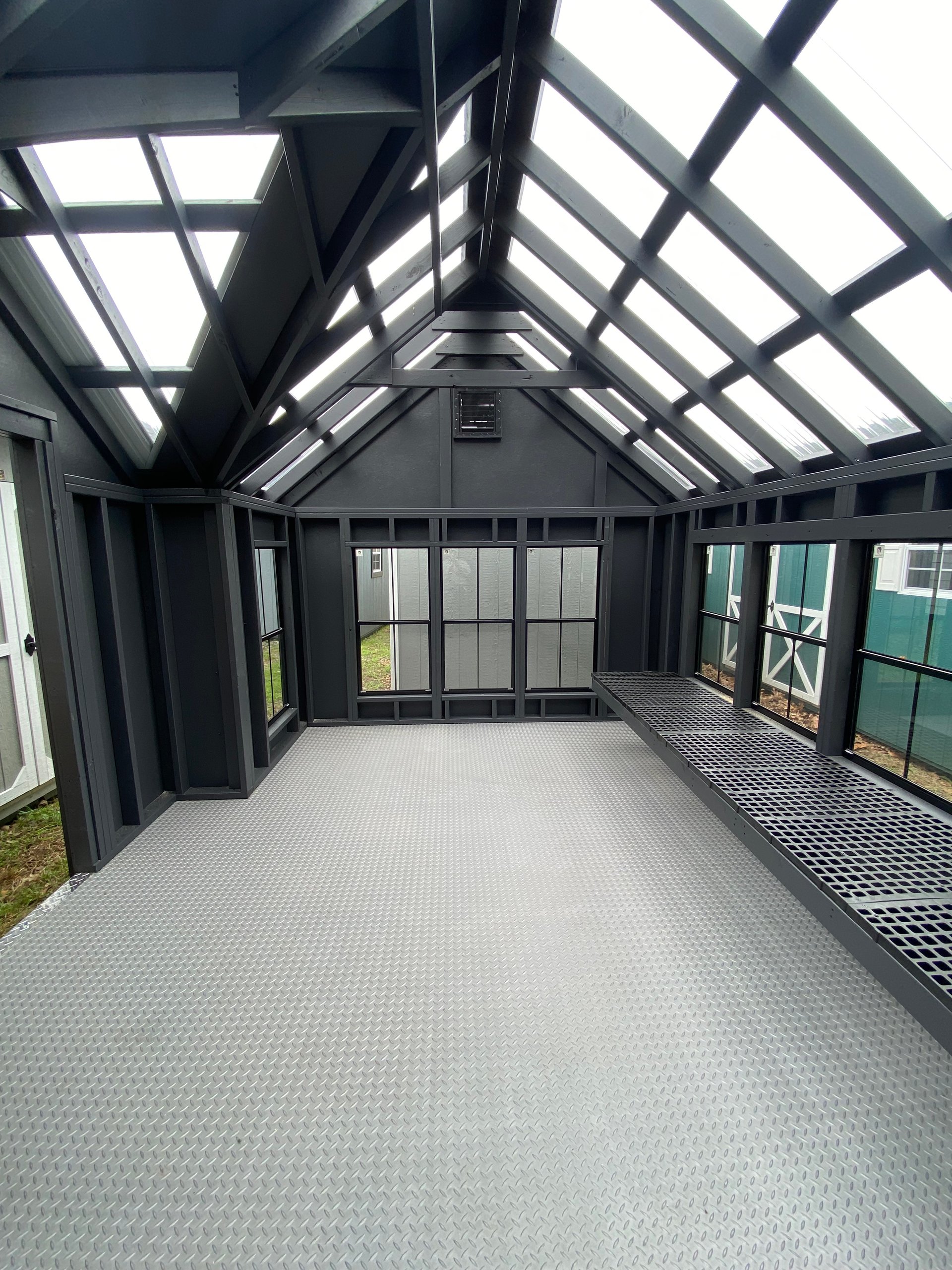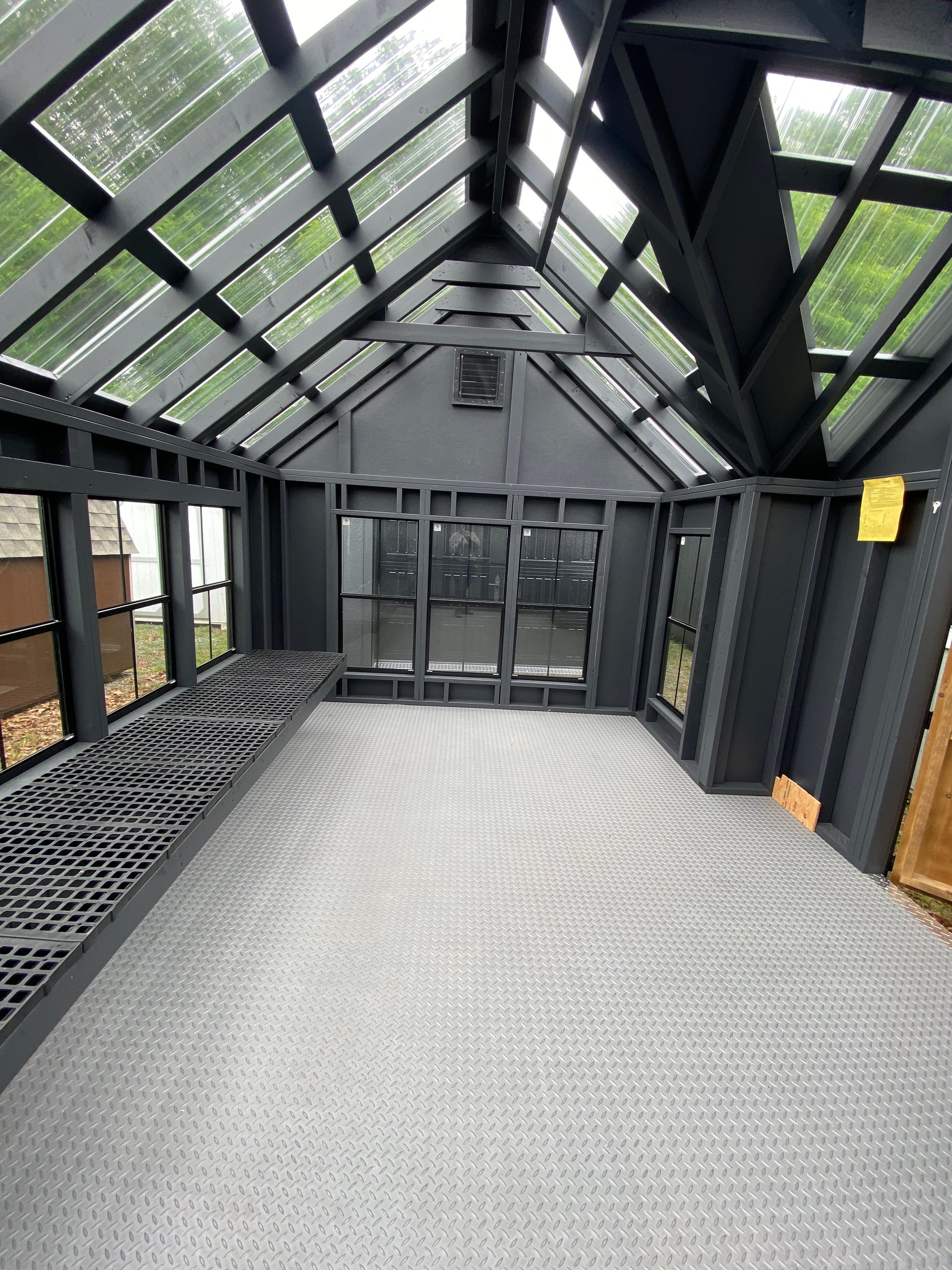 This stunning 10×16 Victorian Greenhouse blends timeless design with practical function. With 13 black-trimmed wood sash windows (eight 24×48 4/4 and five 24×36 2/2), this structure floods with natural light—perfect for gardening or stylish relaxation. The clear metal roof and bumpout peak dormer amplify sunlight while adding architectural charm. Built with LP Smart Panel siding, matching Mopboard trim, and a single pine door with a wood sash window, it also features a painted interior, LuxGuard flooring, and a 12′ greenhouse bench for planting or display. Durable 2×4 framing and Prostruct flooring ensure it’s as functional as it is beautiful.
