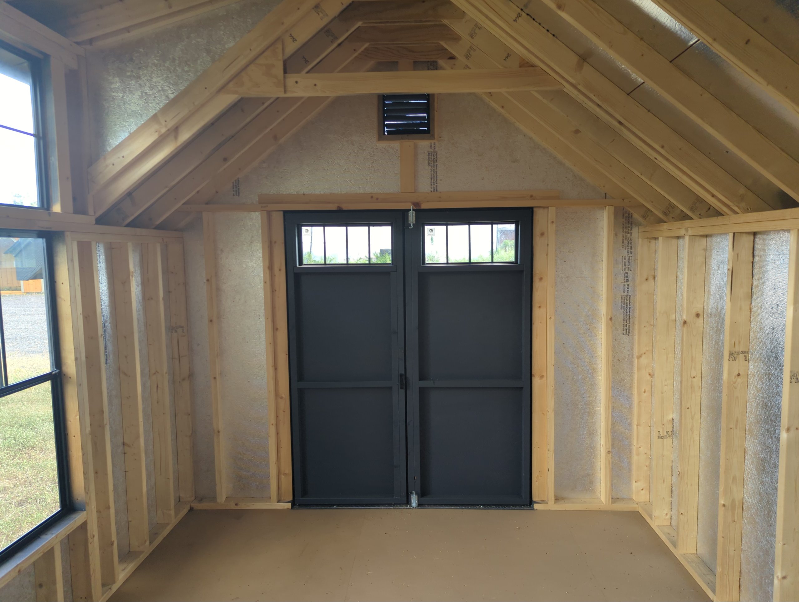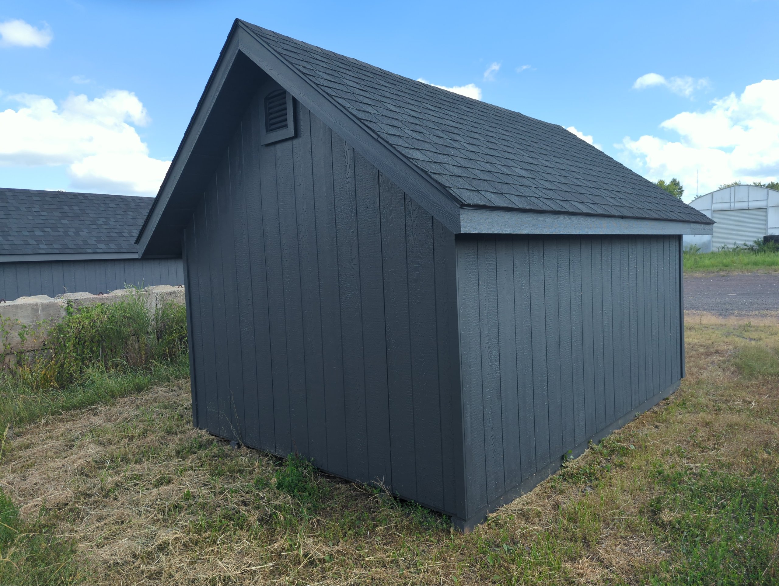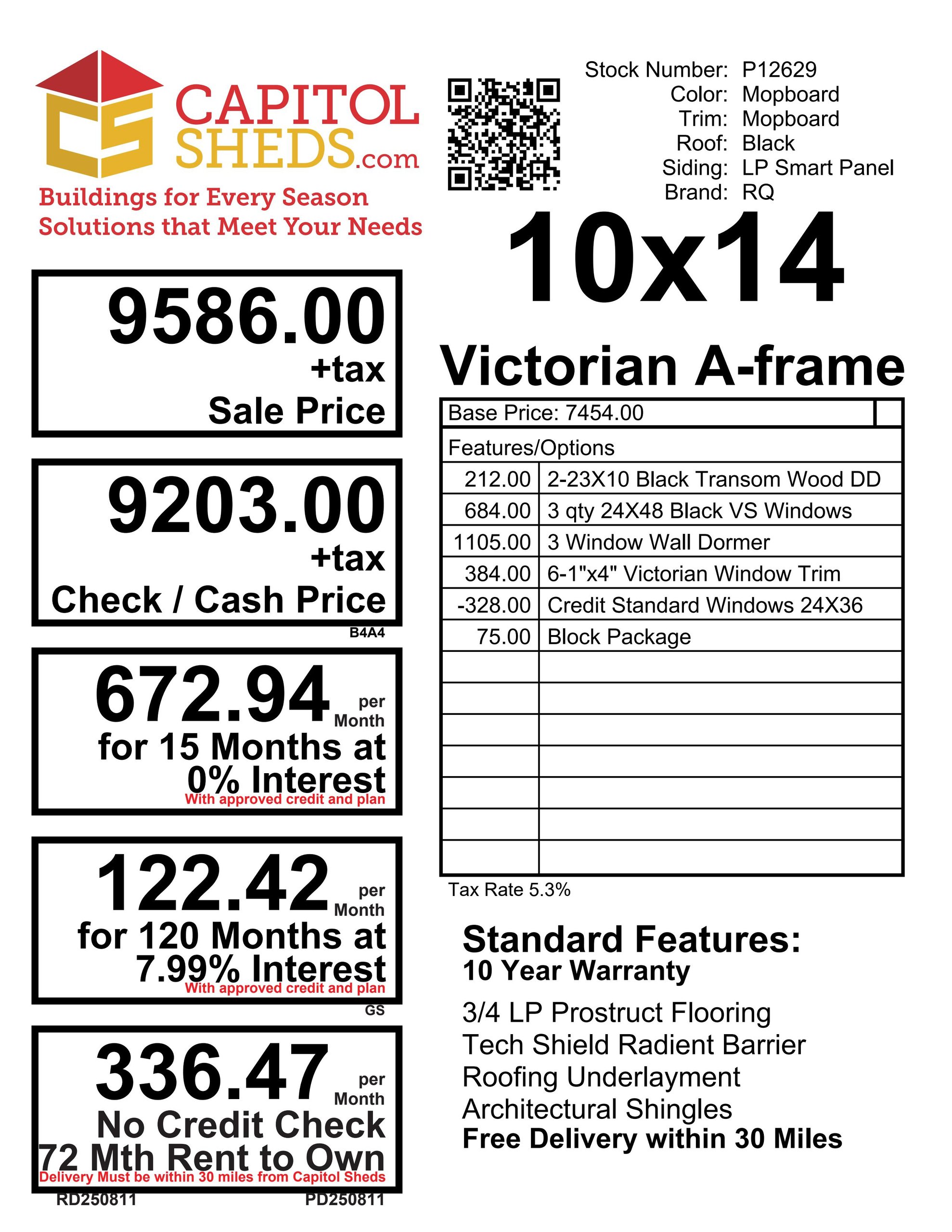 Upgrade your backyard with this Amish-built 10×14 Colonial A-Frame storage shed, designed for beauty, durability, and functionality. Featuring LP Smart Panel siding in classic Mopboard with matching trim, a black dimensional shingle roof, and premium LP ProStruct flooring, this shed is built to last. Six black-frame windows, a charming wall dormer, and elegant transom double doors enhance both style and natural light. Sturdy 2×4 construction 16″ on center, LP Tech Shield roof sheathing, and pressure-treated floor joists ensure superior strength. Perfect for use as a garden shed, workshop, or storage building, this timeless design combines curb appeal with exceptional craftsmanship.
