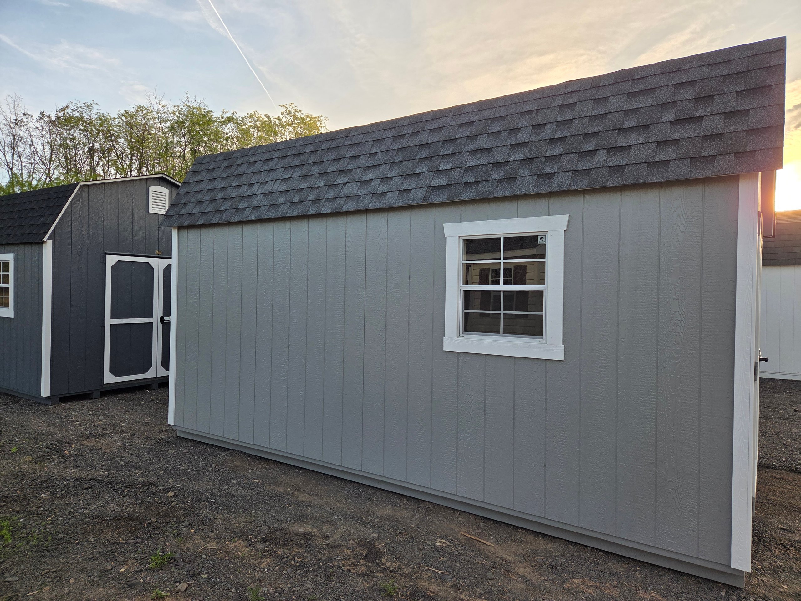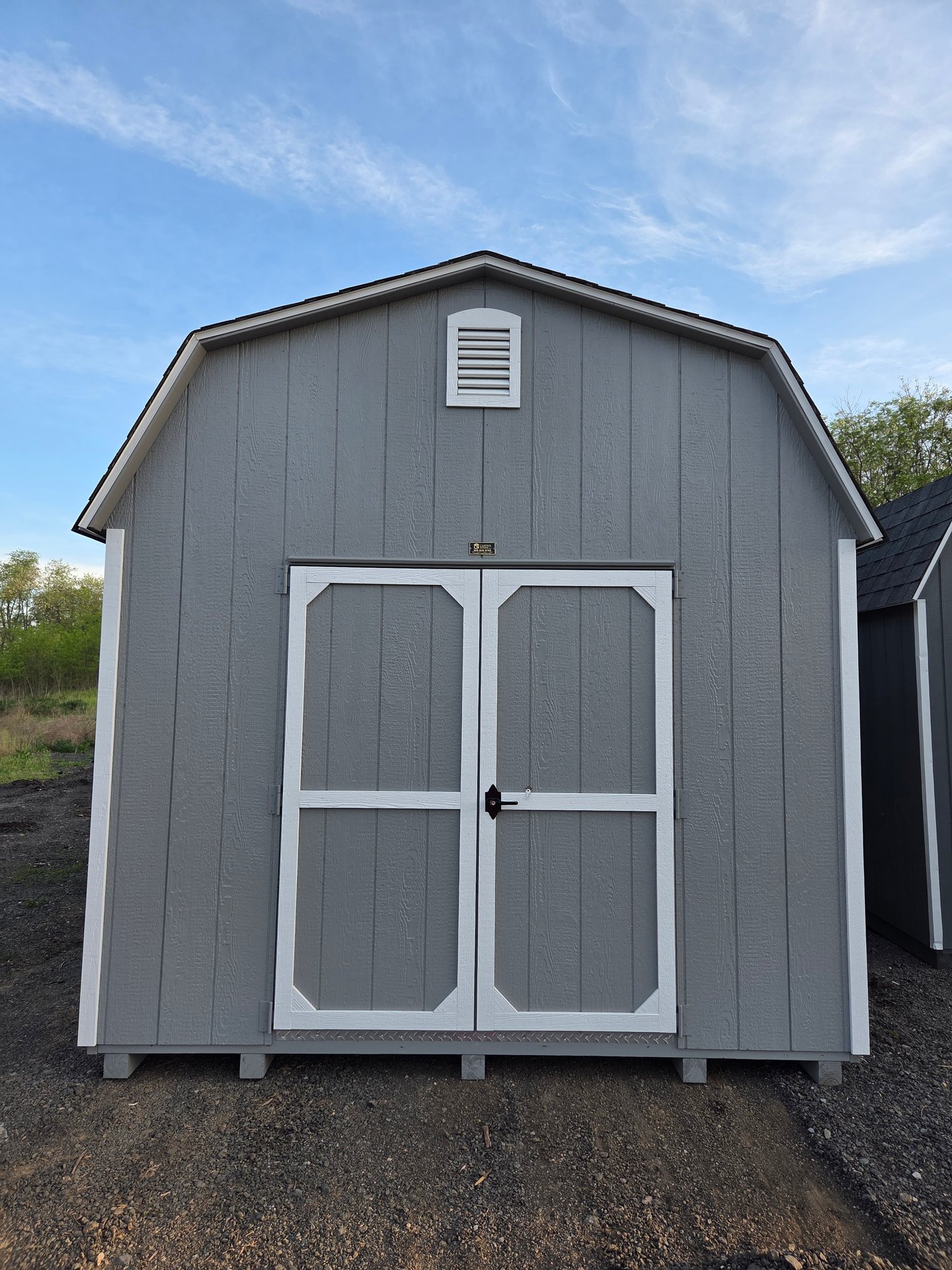 This Amish-built 10×16 Dutch Barn shed offers classic charm with dependable craftsmanship. Finished in Ronks Gray LP Smart Panel siding with crisp white trim and a Pewter shingle roof, it delivers timeless curb appeal. The gambrel roof design creates generous overhead space, enhanced by the included 4×10 loft for organized storage. Built with strong 2×4 wall and roof framing, LP Tech Shield roof sheeting, and roof felt underlayment, it’s designed for long-lasting durability. LP ProStruct flooring over pressure-treated joists provides a solid foundation, while garden vents improve airflow and interior comfort.