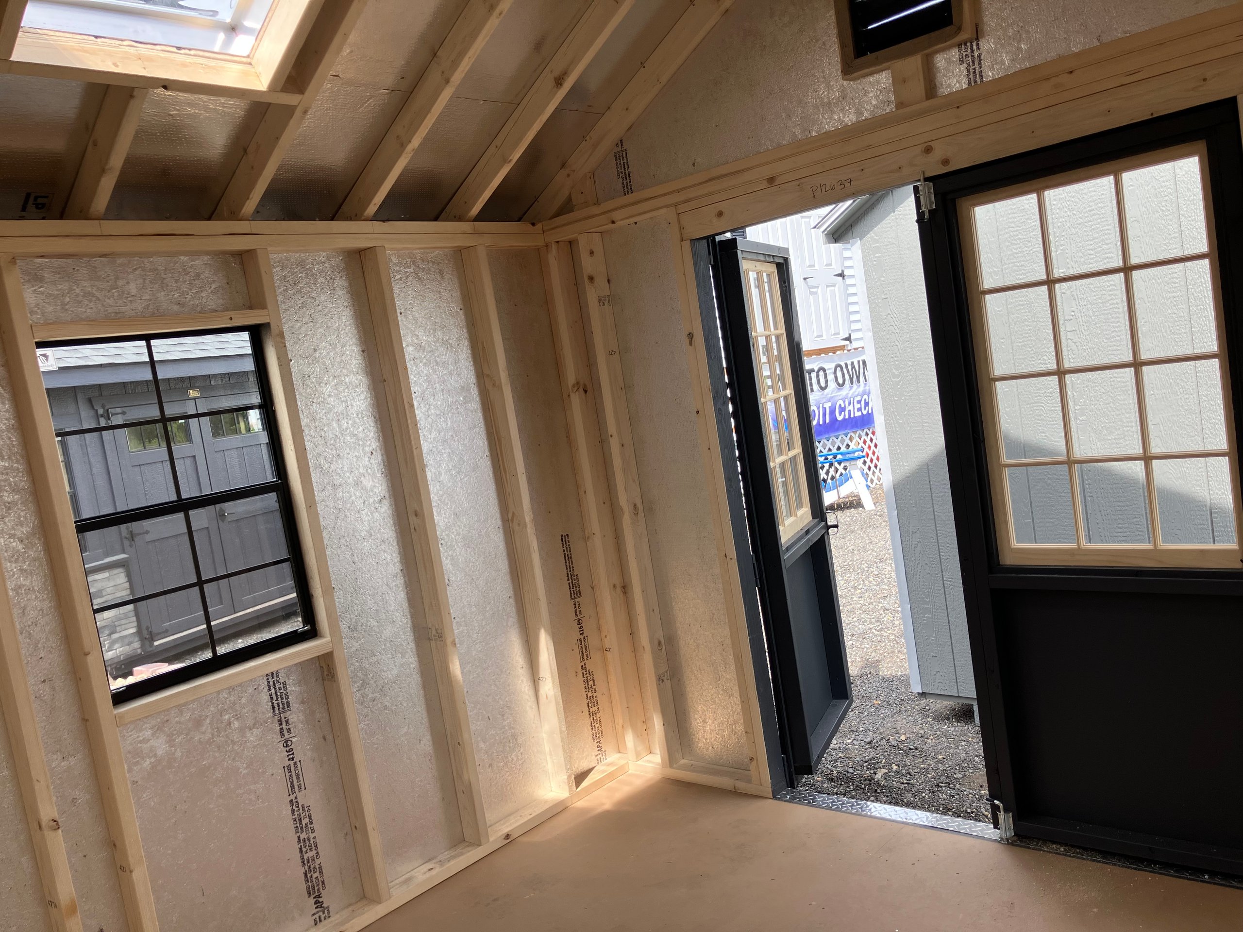 Crafted for durability and style, this Amish-built A-Frame shed is both functional and elegant. Its 10×10 structure features Mopboard Black LP Smart Panel siding, black trim, and a sleek black roof with architectural shingles and roof felt underlayment. Inside, sturdy 2×4 wall and roof framing ensure long-lasting support, complemented by LP Tech Shield sheeting and LP Prostruct flooring. Enjoy upgraded touches like Victorian vents, a solar skylight, and a 5′ double door for easy access. Two wood sash windows with black trim complete the modern yet timeless look. Perfect for secure, stylish storage that lasts.