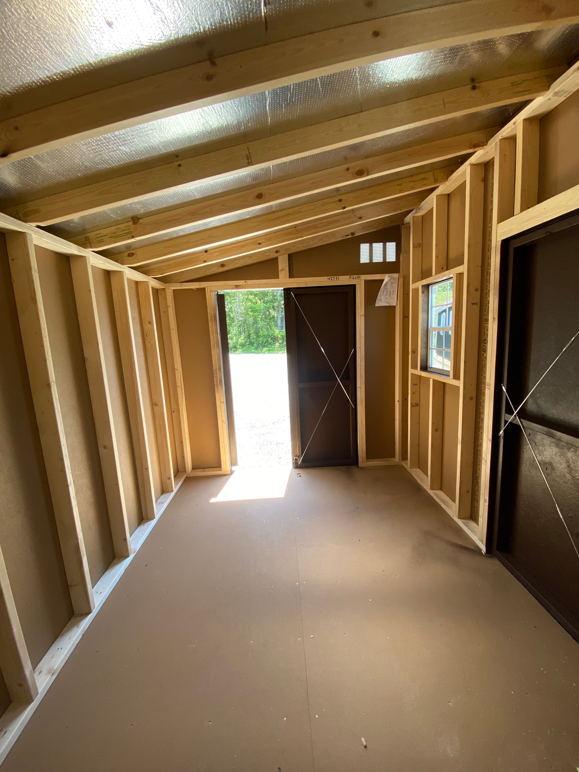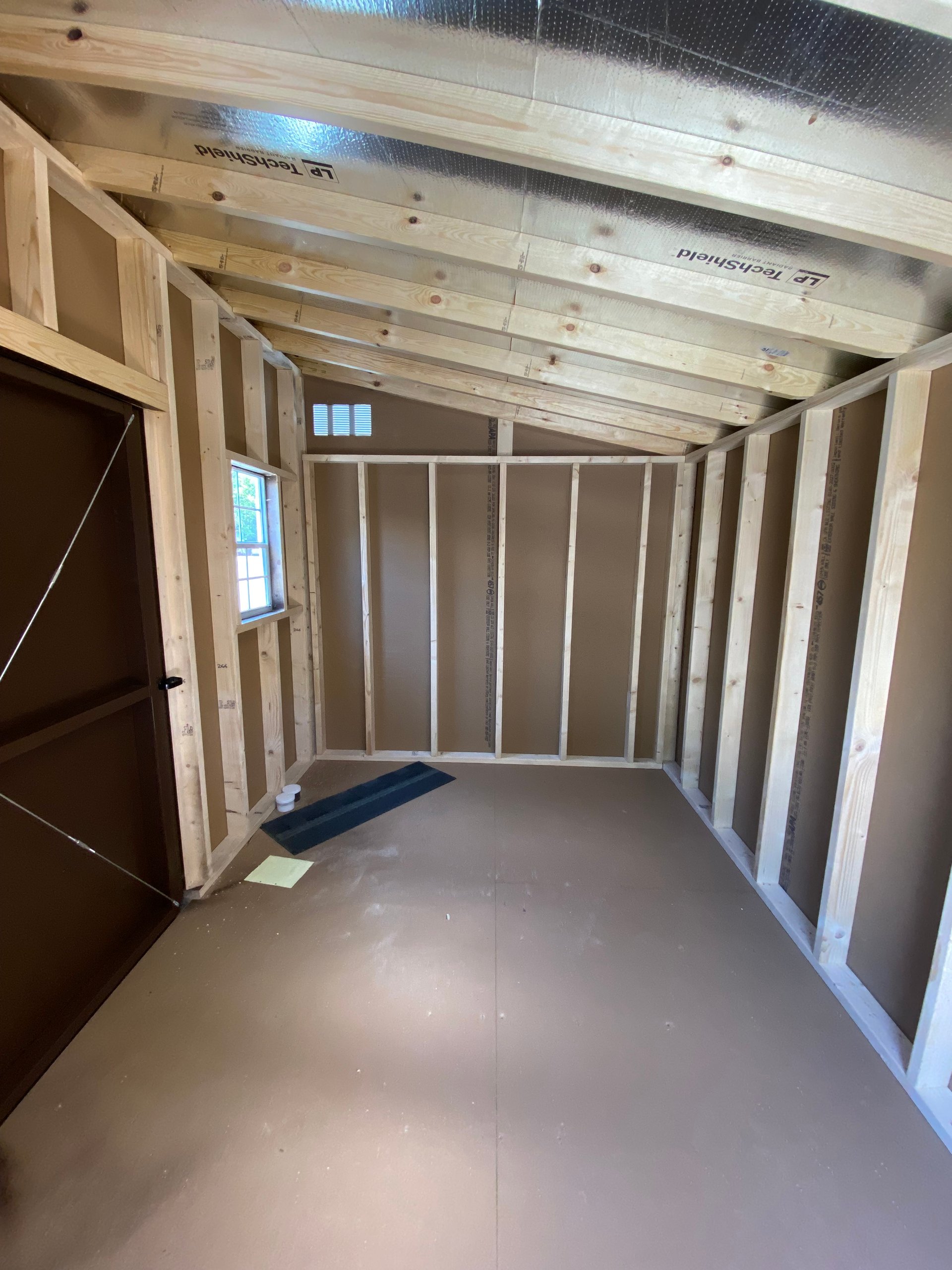 This 8×12 Lean-To shed offers smart functionality with a sleek, space-saving profile. Crafted with LP Smart Panel siding in a warm brown with crisp white trim, it features a charcoal architectural shingle roof and roof felt underlayment for all-weather protection. The layout includes three doors—one upgraded single entry—and two windows for natural light and ventilation. Inside, it’s built to last with 2×4 wall and roof framing, LP Tech Shield sheathing, and LP T&G Prostruct flooring over 12″ on-center pressure-treated joists. Its clean lines and practical design make it a perfect fit for narrow yards or against fences.