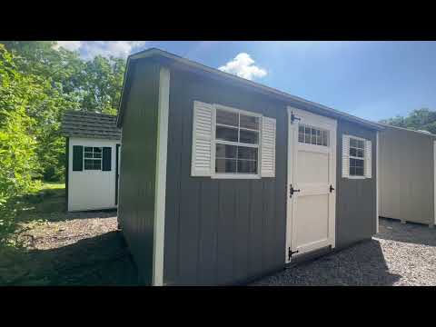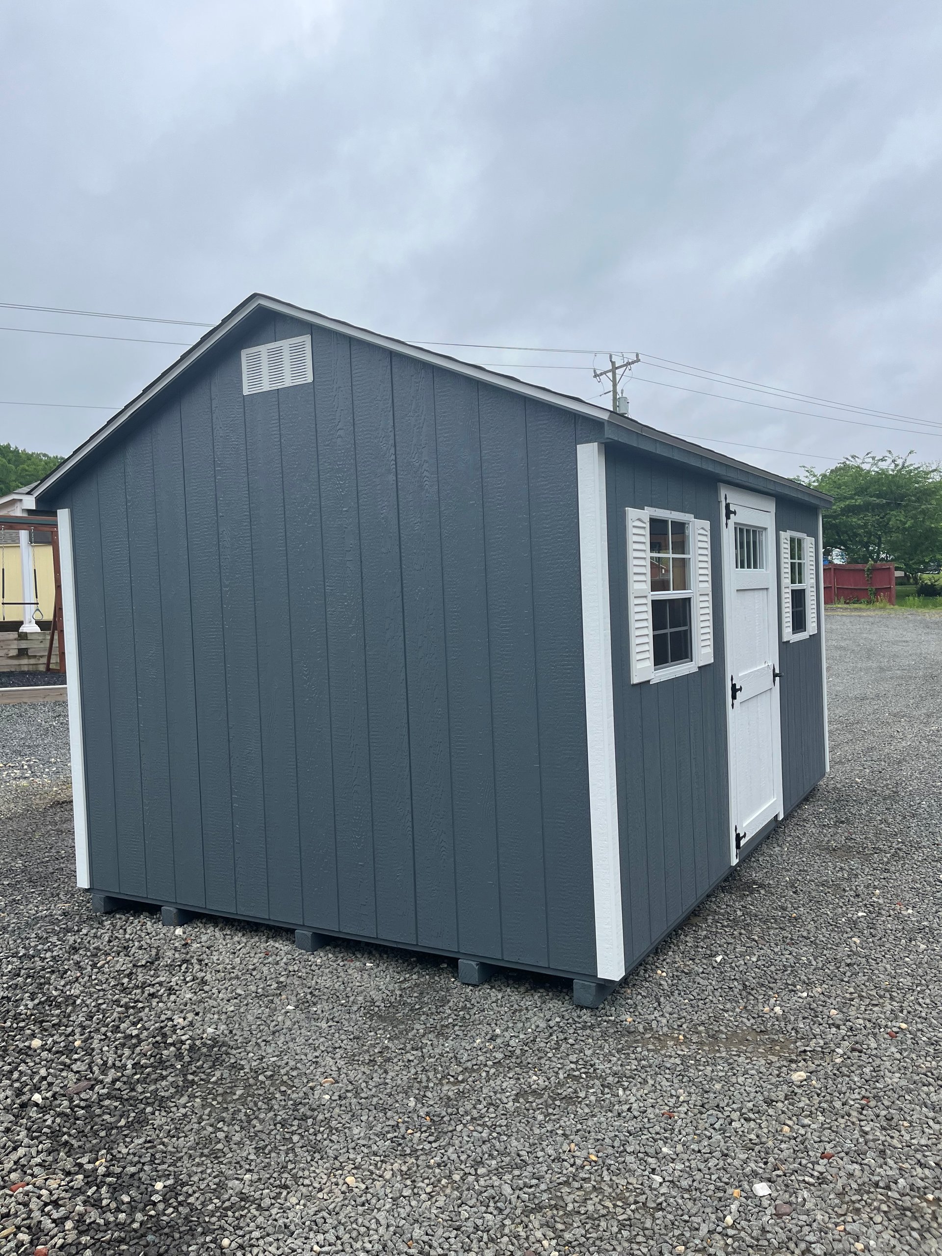 Crafted with Dark Gray LP Smart Panel siding and clean White trim, this 10×14 Gable shed blends utility and elevated design. Featuring two upgraded 5′ garden-style double doors with transoms and a transom-enhanced single garden door, it allows light to pour in while providing versatile access. Two windows and dual 16″x10′ shelves add to its functionality. The Shake-Wood roof offers a warm contrast and houses durable 3/4″ LP ProStruct flooring beneath. Whether used as a workshop, garden station, or storage hub, this shed offers refined looks and thoughtful upgrades that bring both form and function to your space.