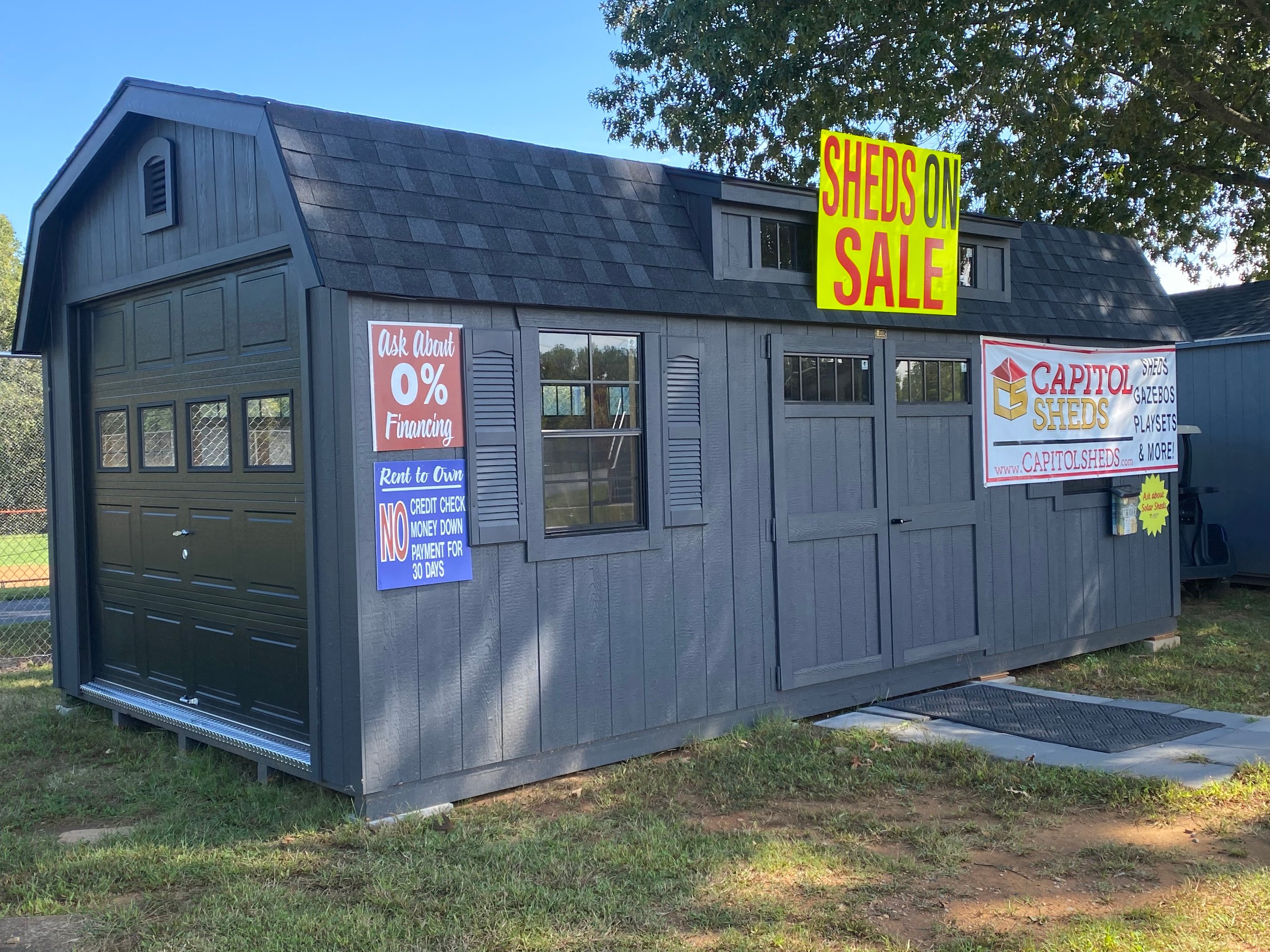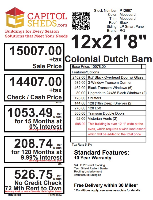 This 12×21’8″ Colonial Dutch Barn Garage offers classic style with serious functionality. Finished in LP Smart Panel siding with Mopboard color-matched trim, it features a bold black architectural shingle roof with LP Tech Shield sheeting for added durability and efficiency. Built with 2×4 wall studs and rafters spaced 16 inches on center, plus pressure-treated 2×4 floor joists 8 inches on center, this structure is designed for strength. Upgrades include a 9×7 black overhead door with glass, transom doors, a 12ft loft, 12ft deep shelving, black windows, a transom dormer, and Victorian vents—perfect for storage, parking, or workspace use.