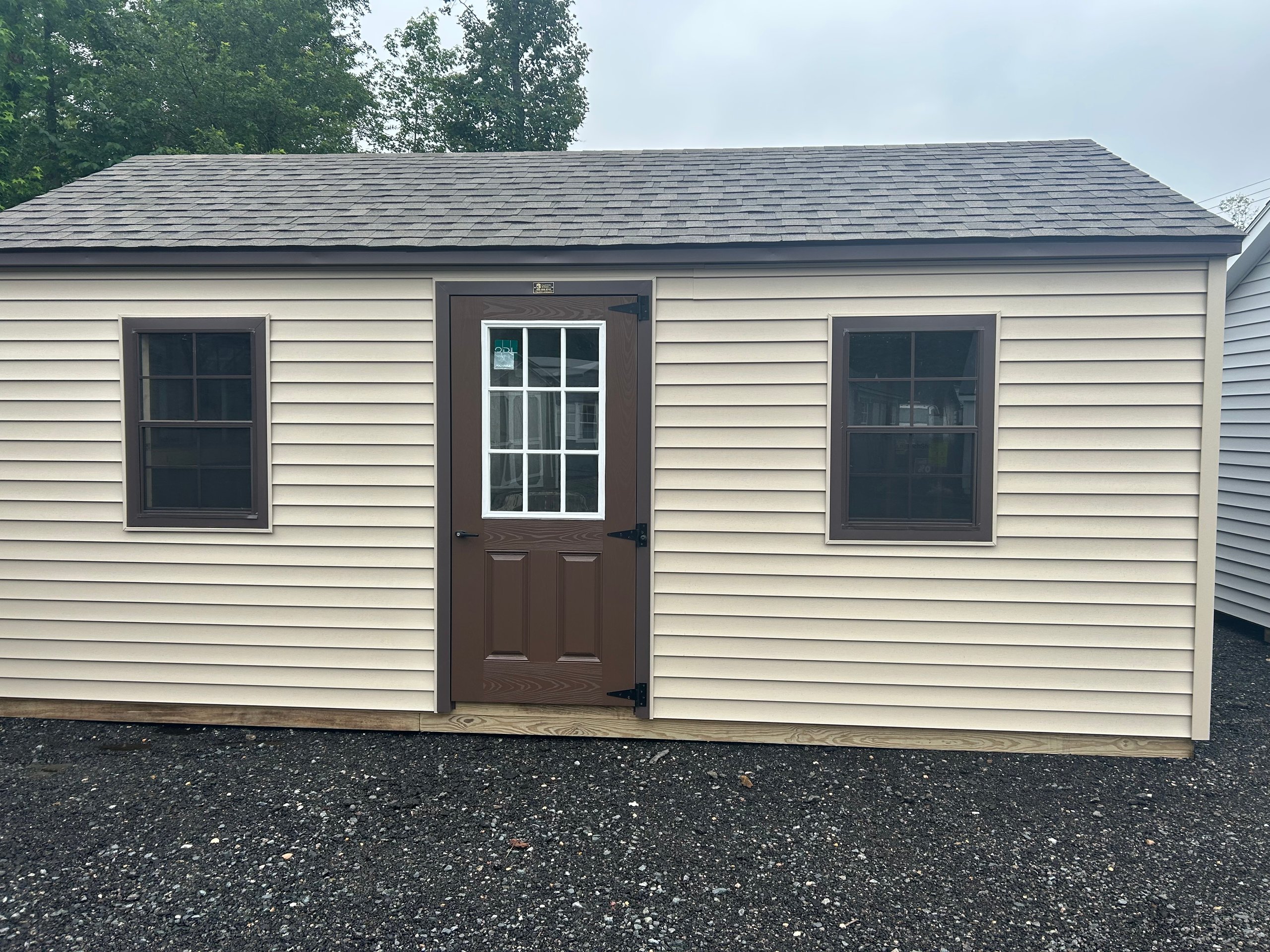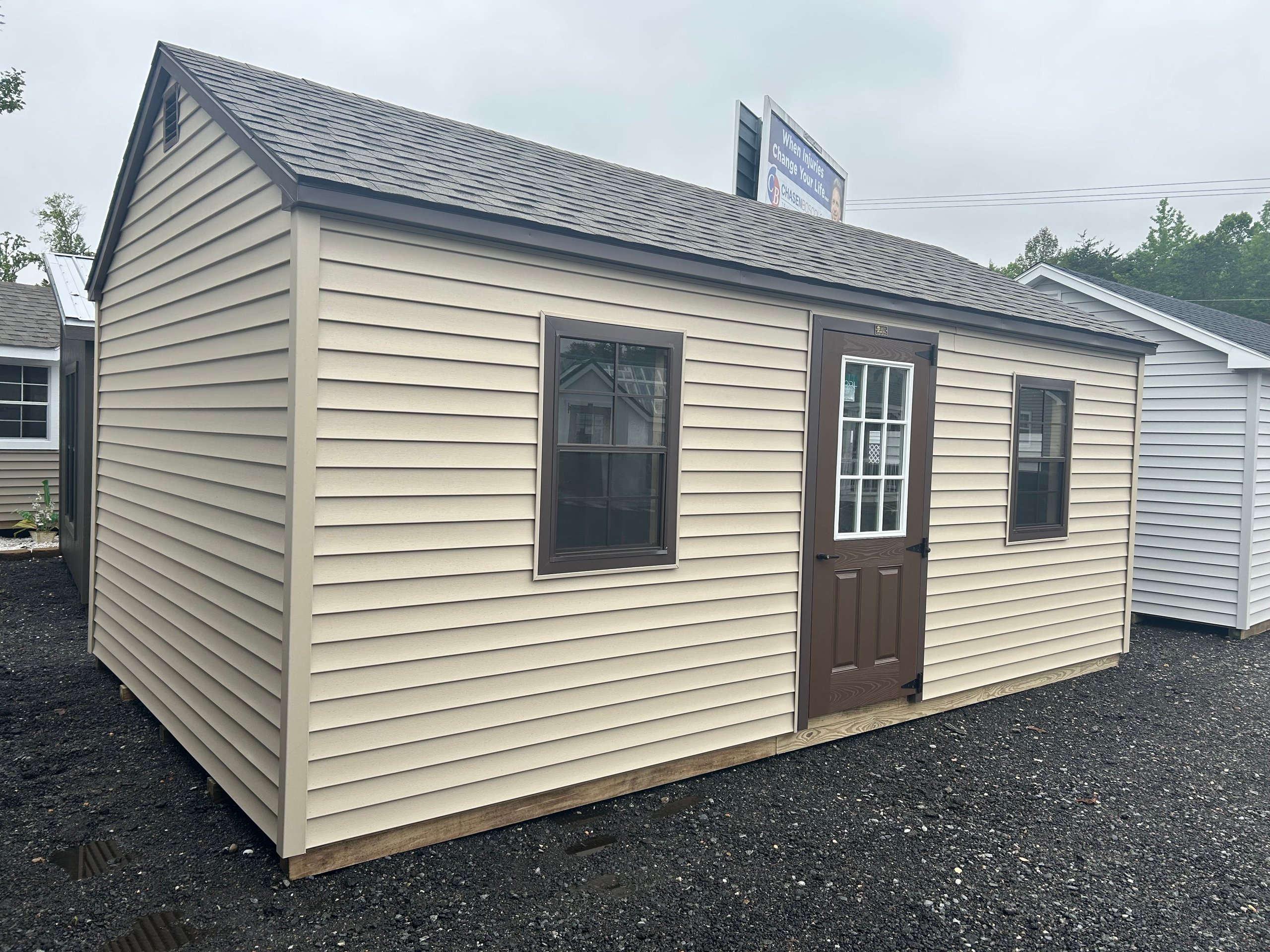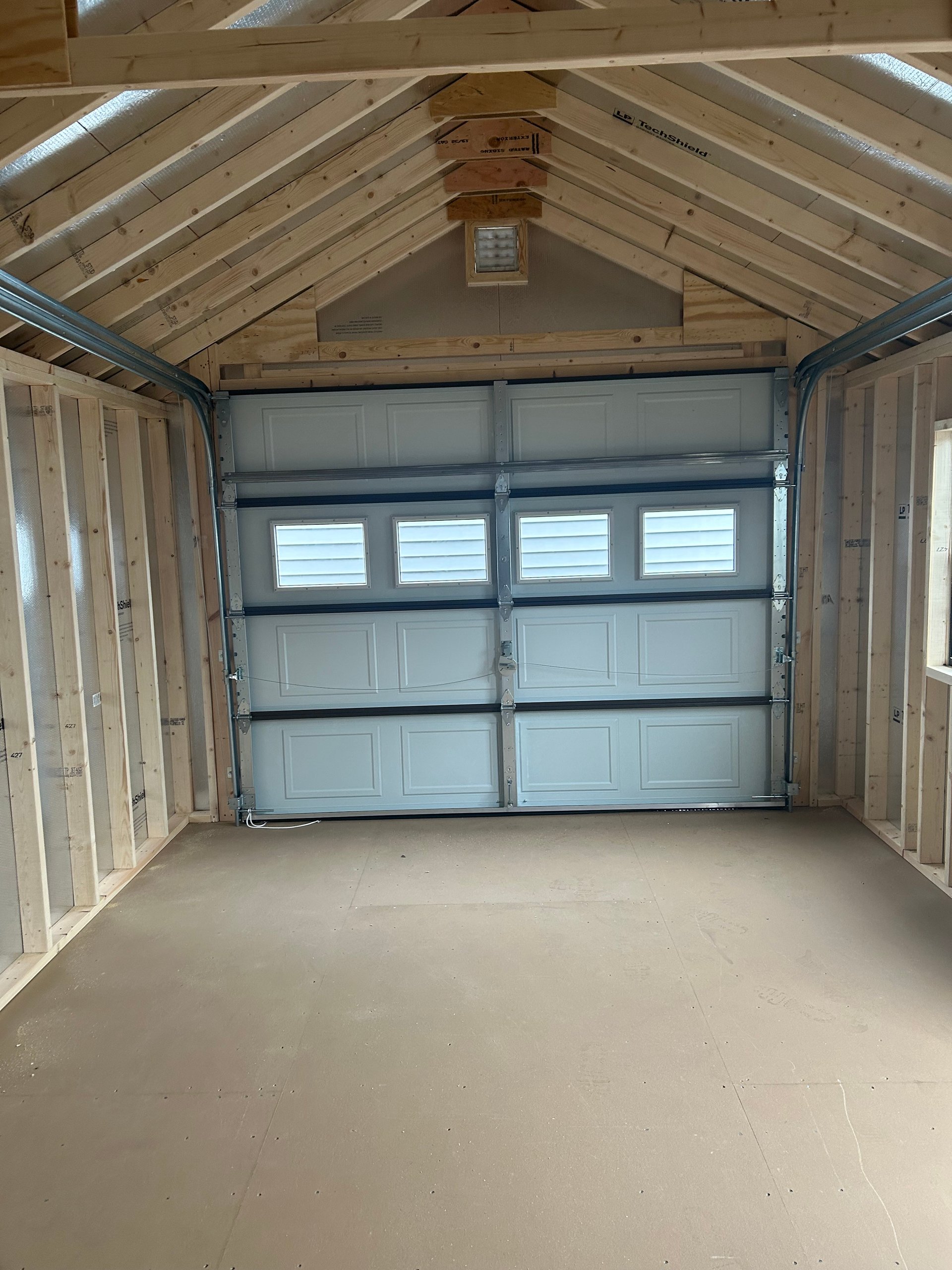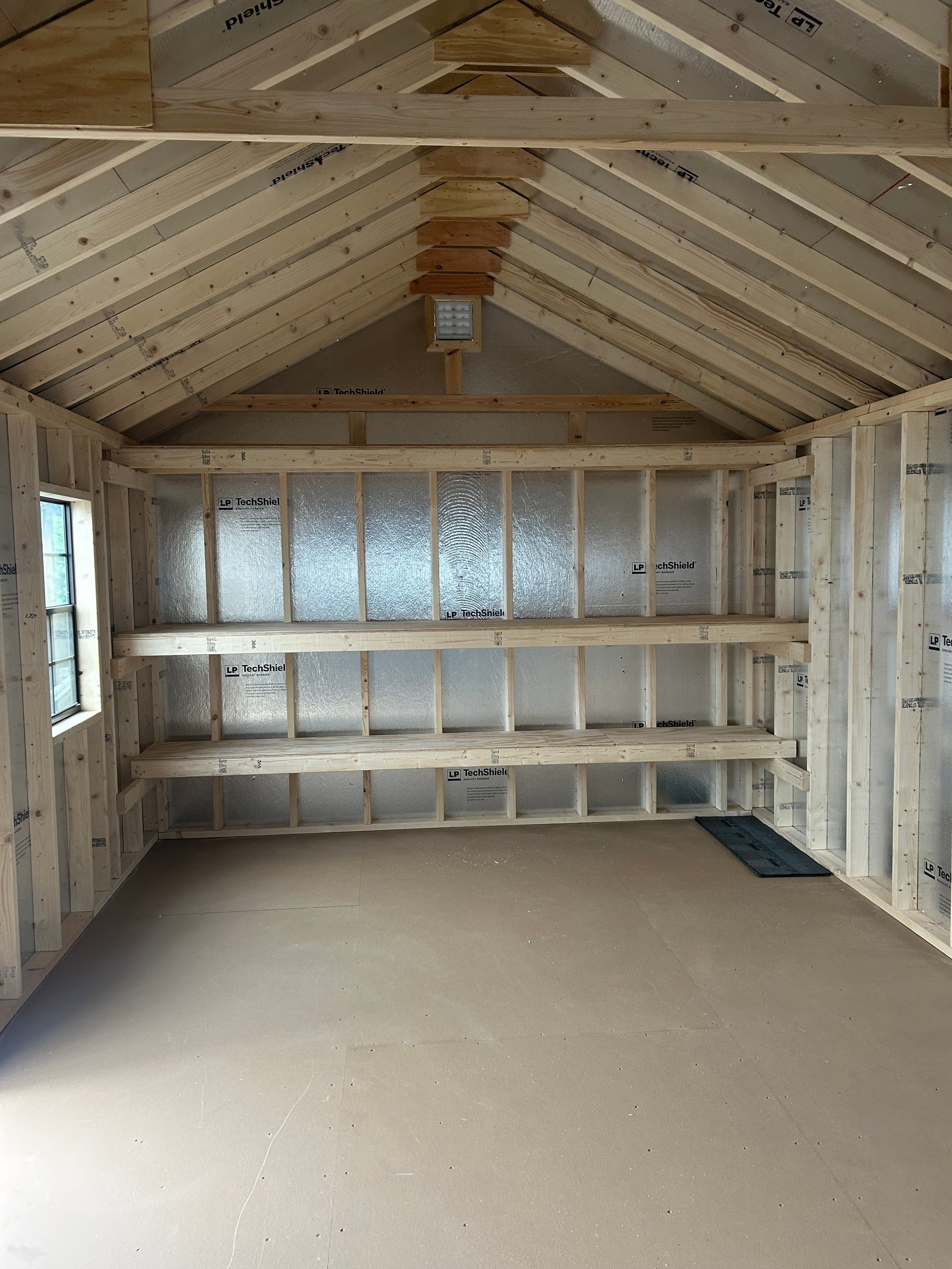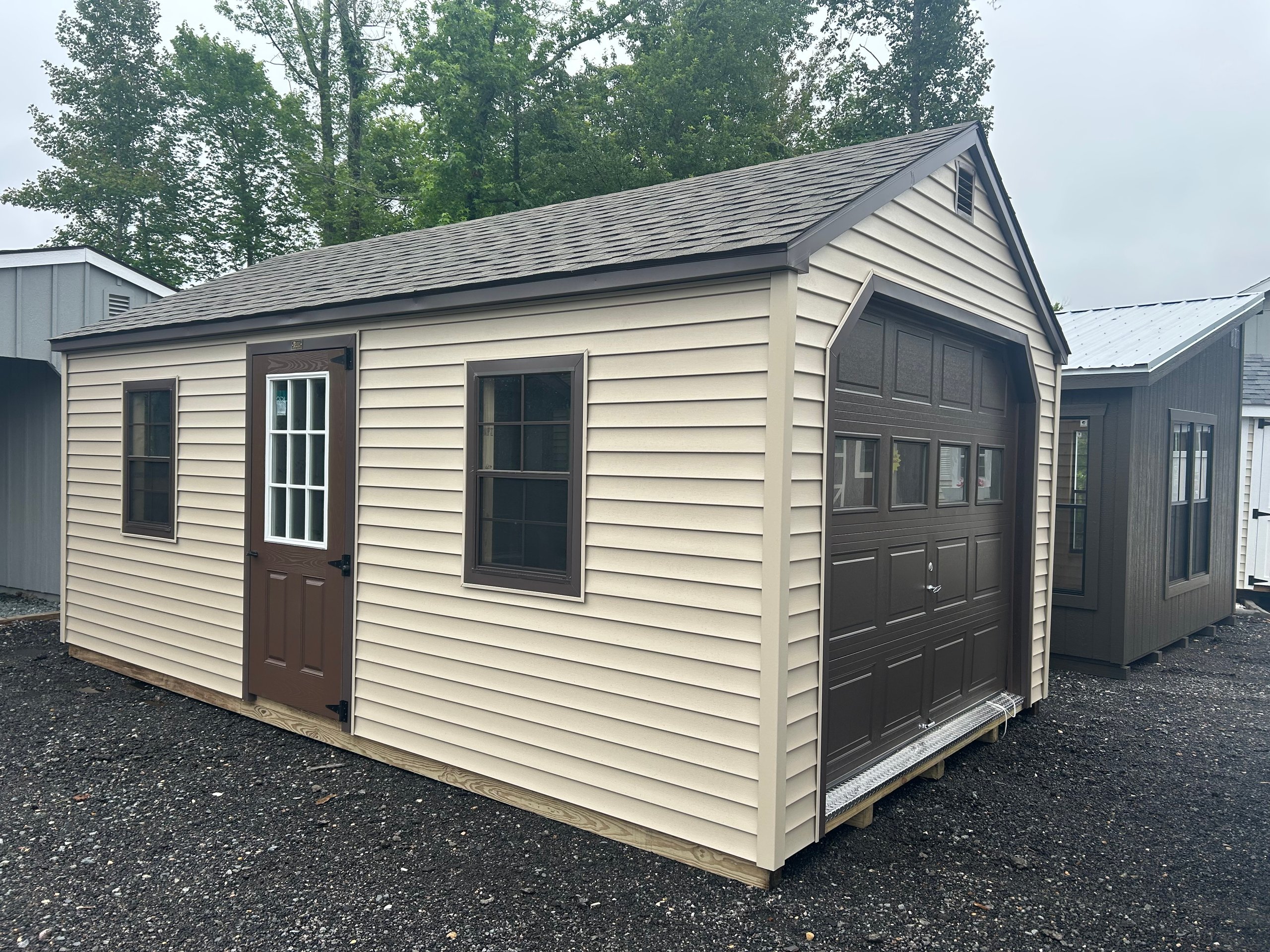 Maximize your storage in style with this Amish-built 12×20 Hi Wall A-Frame Shed. Featuring durable Tan DuraTemp siding with Dark Brown trim and a Weatherwood dimensional shingle roof, it combines strength and charm. Built on pressure-treated 2×4 floor joists with LP Prostruct flooring, this shed includes a 9’x7′ garage door with windows, two upgraded 24″x36″ windows, a 12’x24″ workbench, and two 12’x16″ shelves. Custom window trim adds a finished look. With 2×4 framing 16″ on center and LP Tech Shield roof sheeting, it’s made to last—and built to impress. Ideal for workshops, storage, or hobby space.