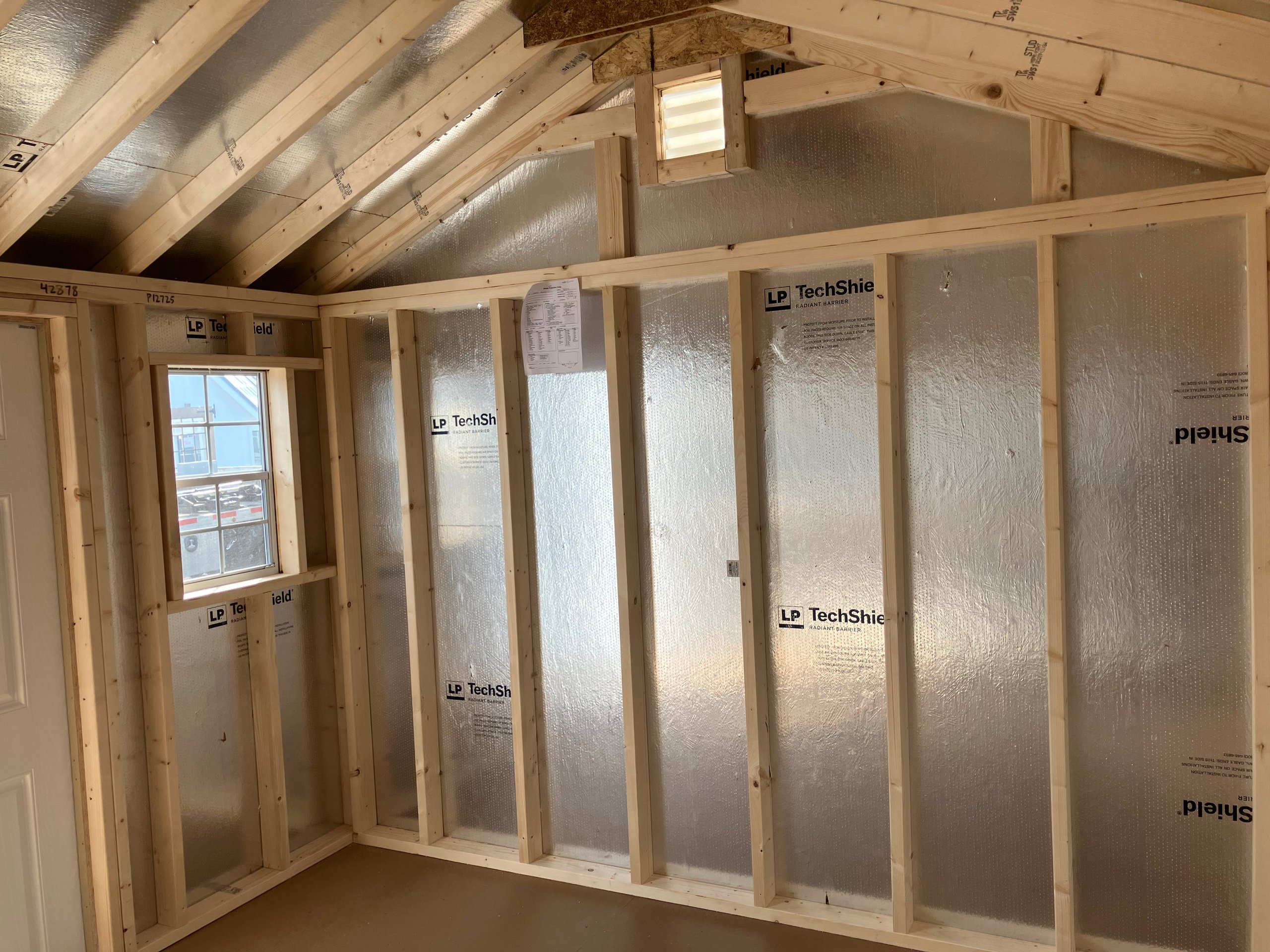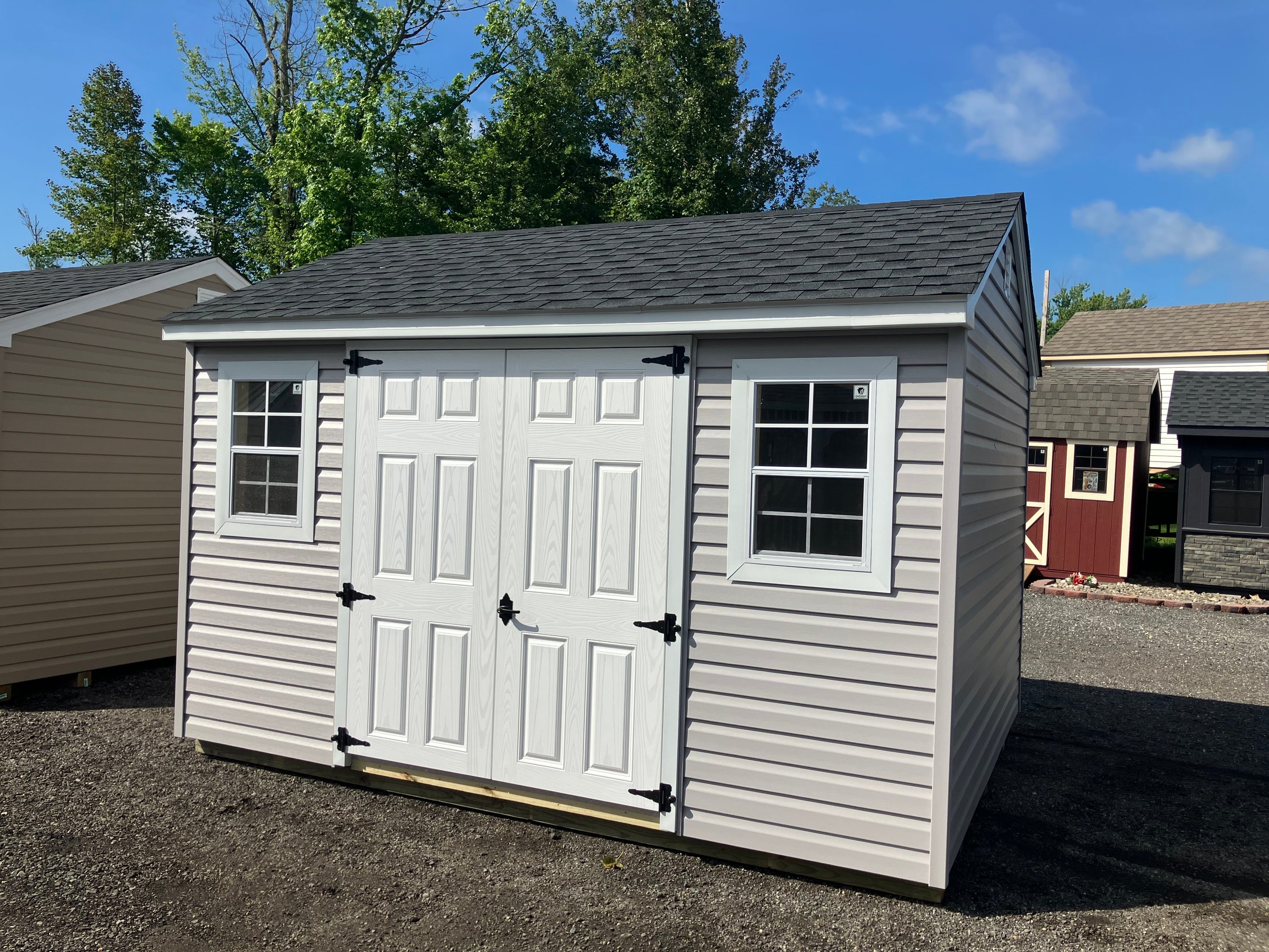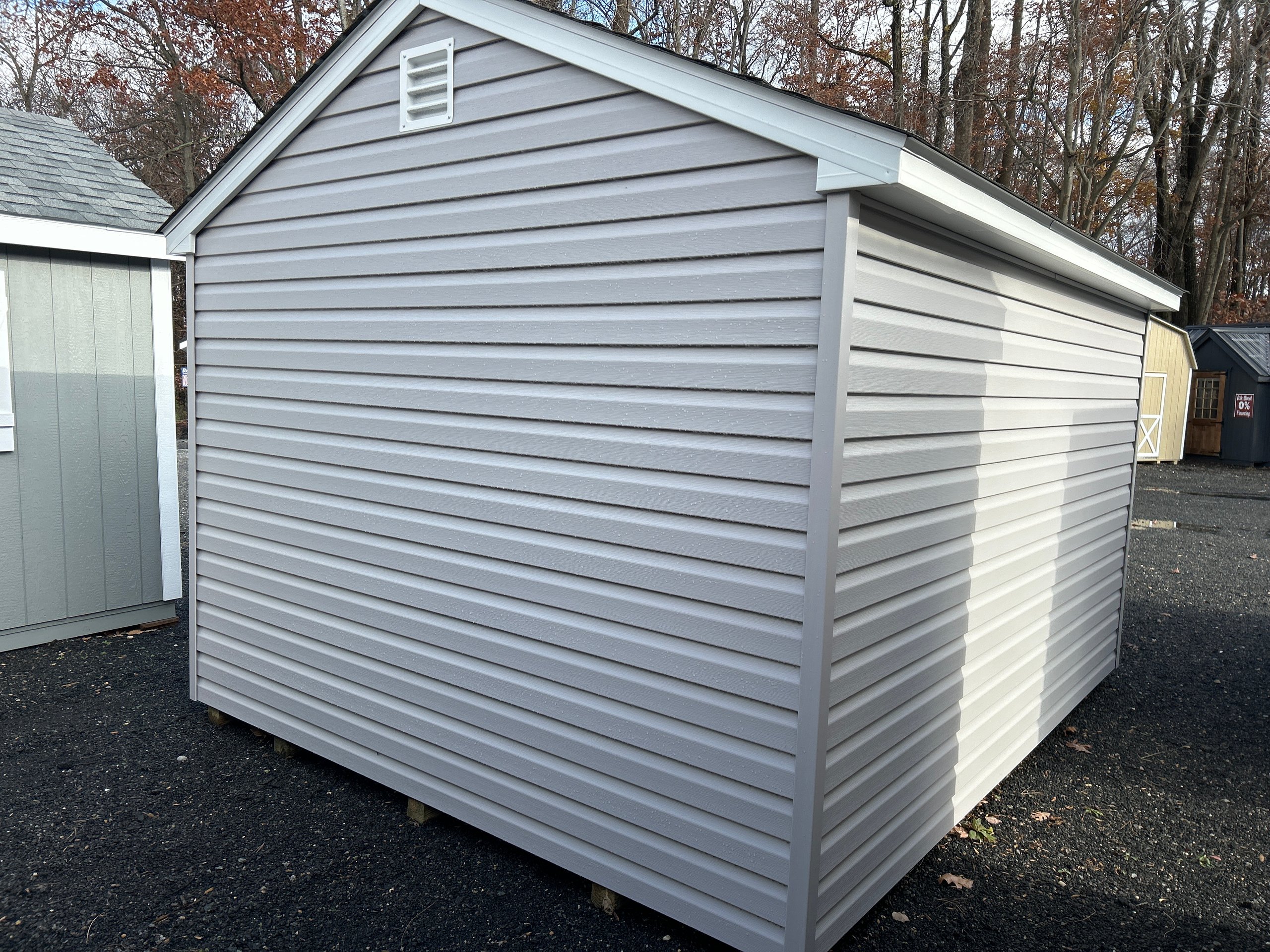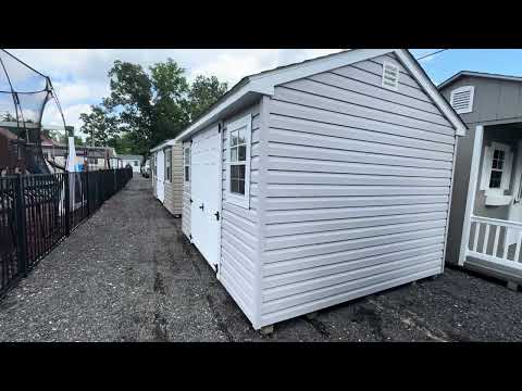 This 10×12 A-frame stands out with Pewter Vinyl Dutch Lap siding, White trim, and a Charcoal architectural shingle roof. It includes two windows and standard double doors for natural light and easy entry. Inside, two full-length 16″×10′ shelves are mounted along the interior walls, offering built-in vertical storage ideal for bins, tools, or seasonal décor. Built with 2×4 studs spaced 16” on center, LP Tech Shield roof sheathing, and Prostruct flooring, this shed blends functionality and durability with a modern exterior finish.