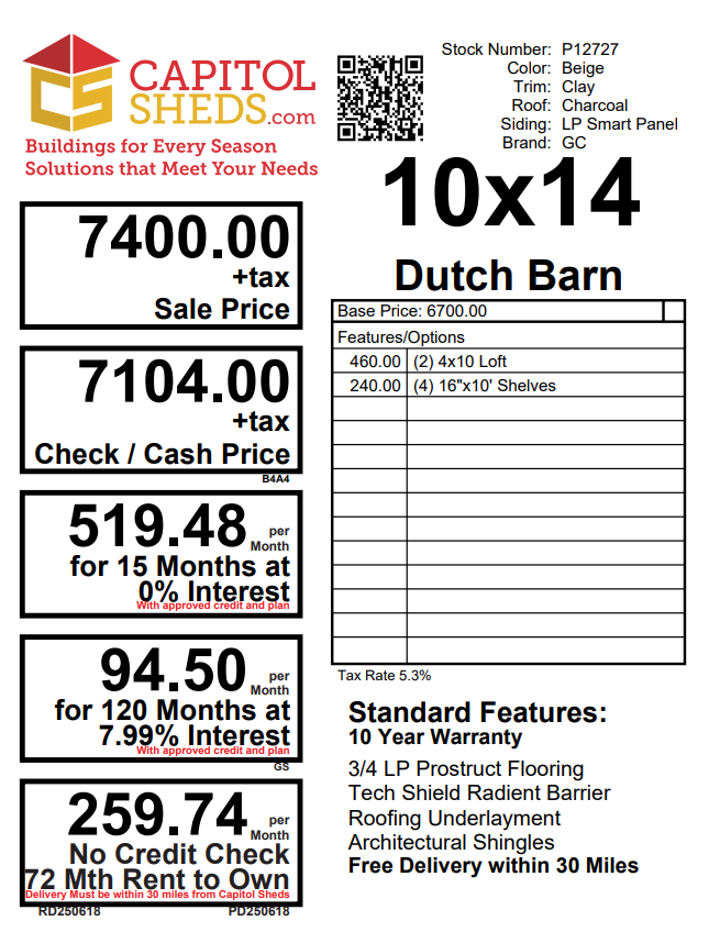 Reserve this building for a $500 deposit. Within 1 business day a rep will contact you to discuss delivery details and discounts you may qualify for such as cash/check, military/1st responder, etc. Don’t lose out on this beautiful building – Place your deposit today to hold it!