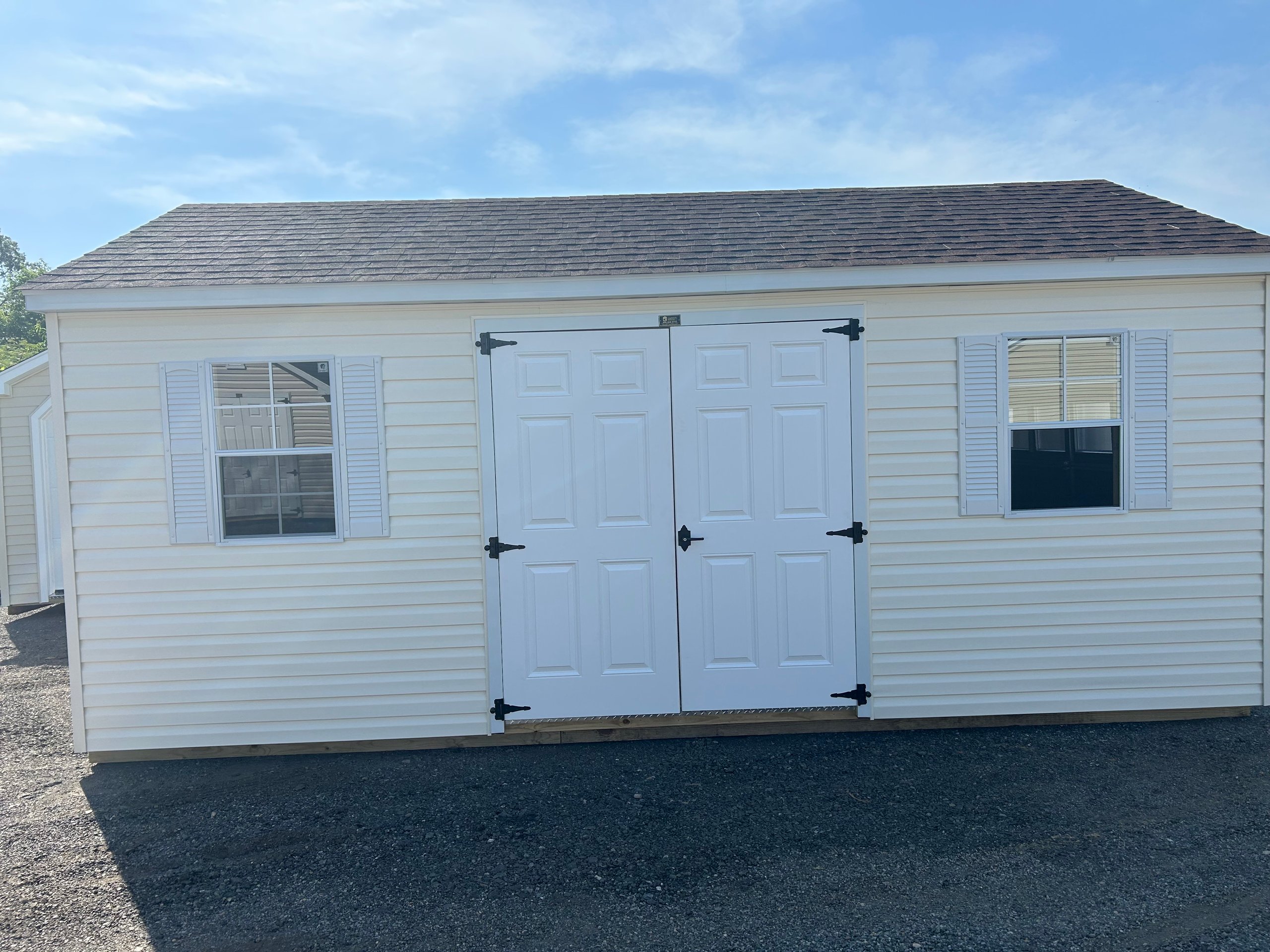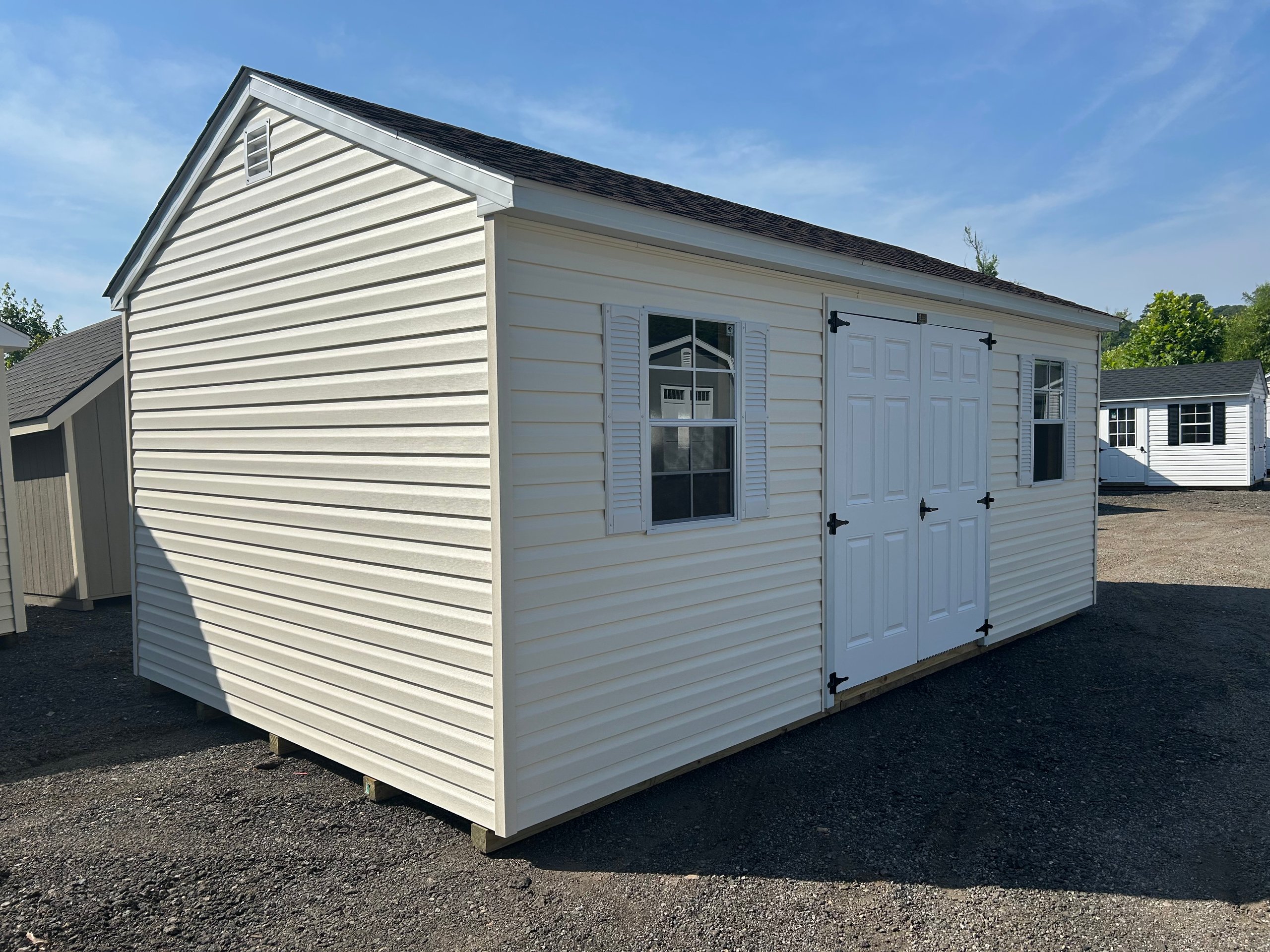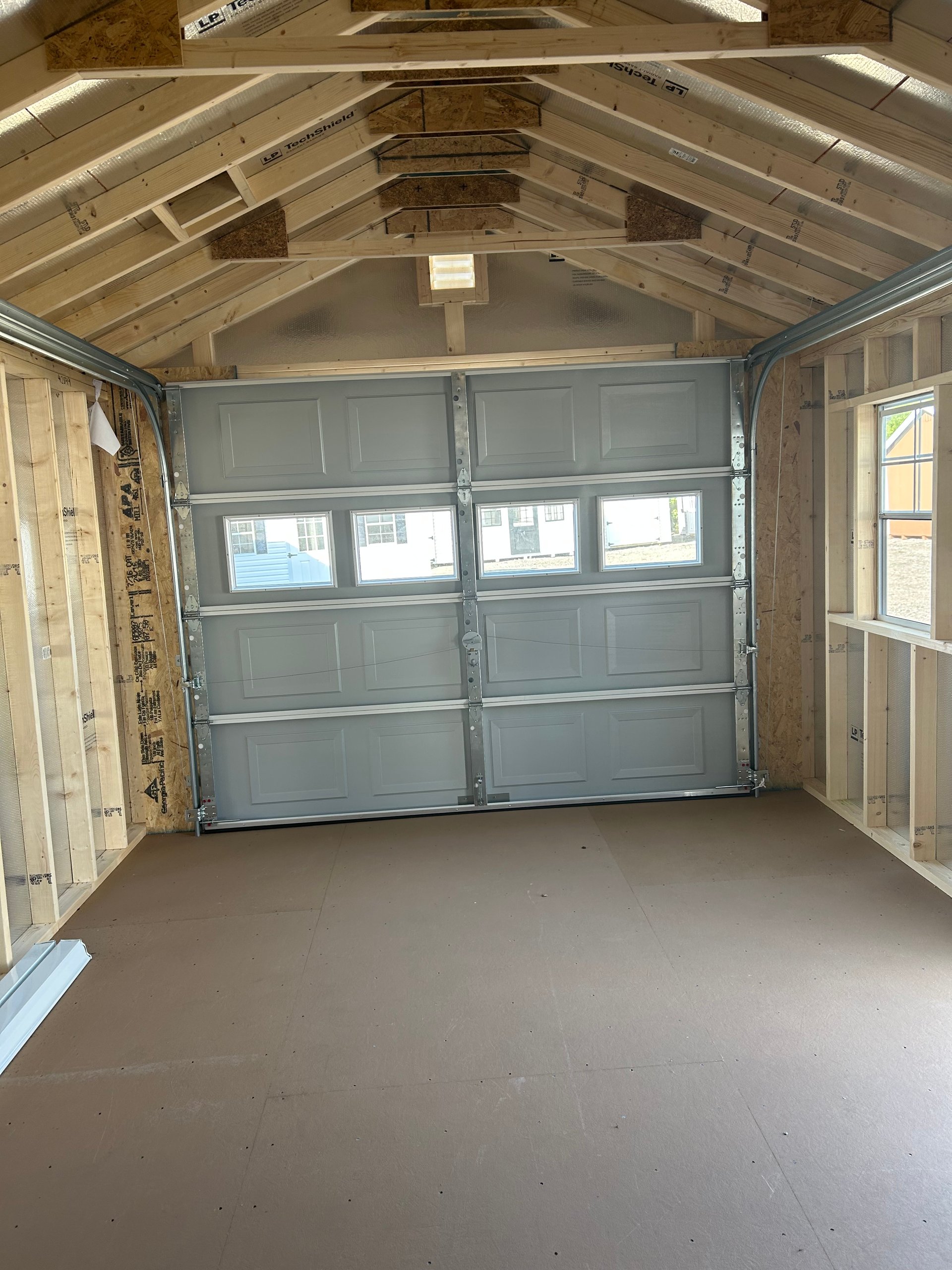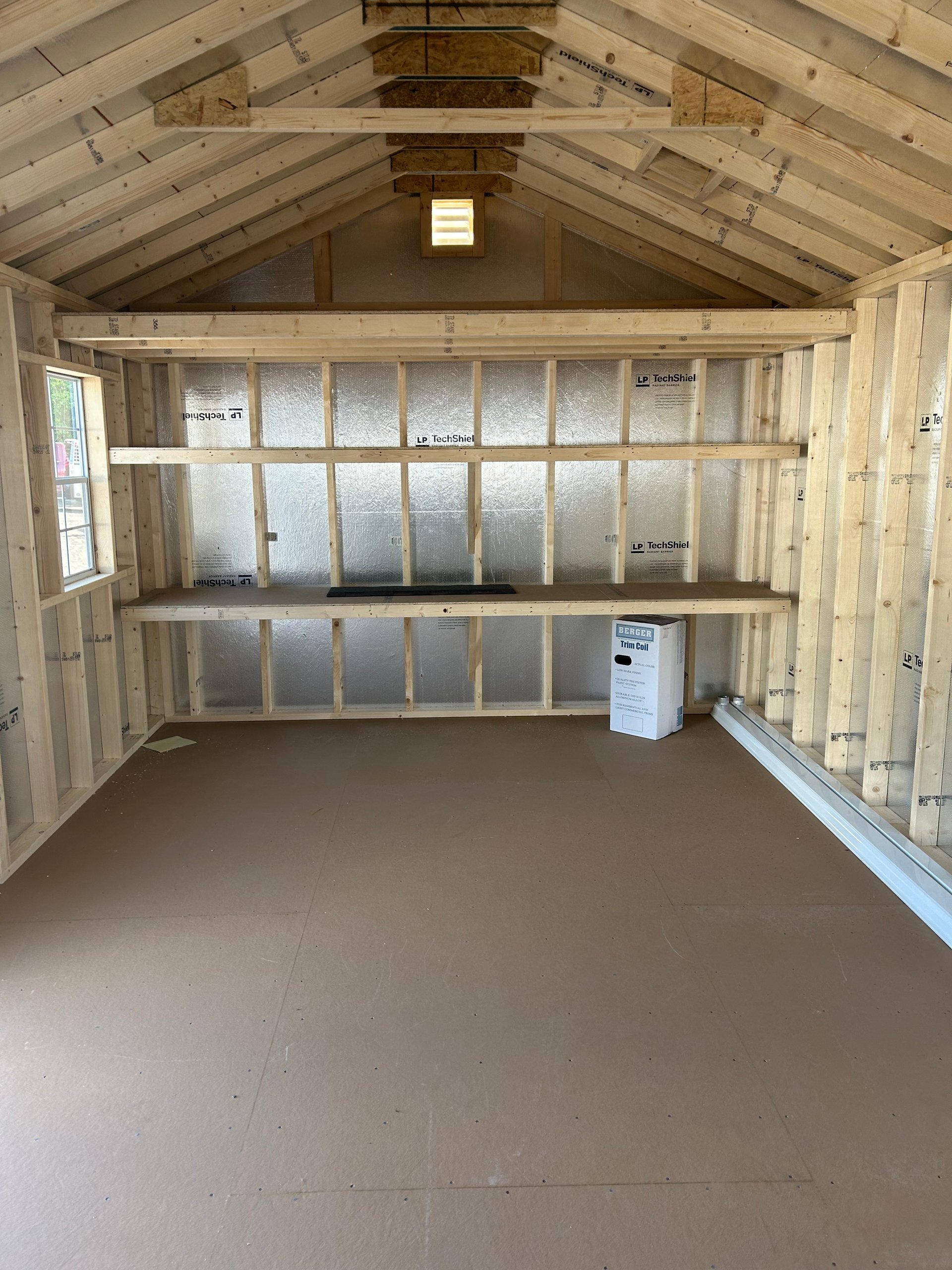 The 12×20 High Wall A-Frame shed is a spacious and durable solution for storage or workspace needs. Featuring ivory vinyl siding, white trim, and a hickory roof with architectural shingles, it combines modern aesthetics with long-lasting reliability. Upgrades include a garage door with glass for added style and accessibility, two solar fans for ventilation, and a loft for extra storage. Inside, two 24″x12’ shelves and enhanced 8” on-center floor joists provide exceptional stability and organization. Built with 2×4 framing, LP Prostruct flooring, and LP Tech Shield roof sheeting, this shed is a premium choice for functionality and elegance.