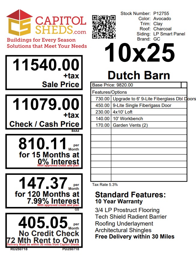 This 10×25 Dutch Barn combines timeless barn styling with practical upgrades for everyday use. Its exterior features durable LP SmartPanel siding in Avocado with Clay trim, topped by architectural shingles in Charcoal over roof felt paper for added protection. Built with 2×4 wall studs and rafters 16″ on center, LP Tech Shield roof sheeting, and LP T&G Prostruct flooring on pressure‑treated 2×4 joists 12″ on center, this barn is made to last. Three 9‑Lite fiberglass doors and two windows provide light and access, while the 4×10 loft, 10′ workbench, and garden vents create a functional, versatile interior space.