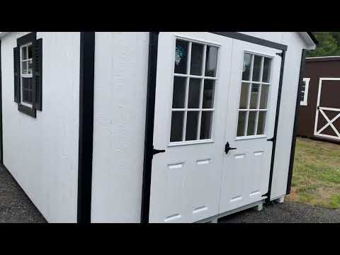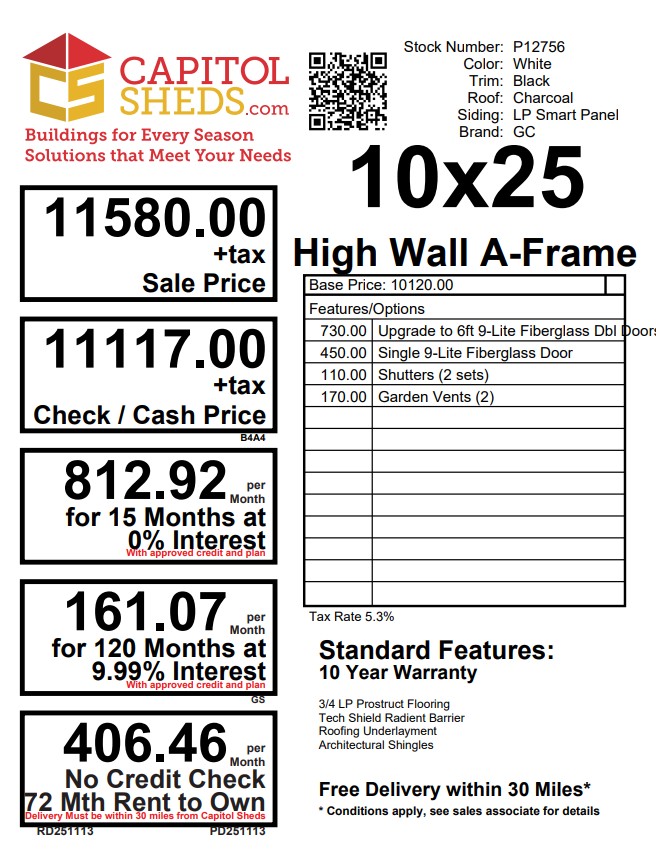 This 10×25 High Wall A‑Frame combines generous space with striking style. The exterior features durable White LP Smart Panel siding accented by bold Black trim, with a Charcoal architectural shingle roof laid over roof felt for long‑lasting weather protection. Built with 2×4 wall studs and rafters 16″ on center, LP Tech Shield roof sheeting, and LP T&G Prostruct flooring on pressure‑treated 2×4 joists 12″ on center, it’s designed for strength and reliability. Three upgraded 9‑lite fiberglass doors provide versatile entry points, while two windows with shutters add charm and light. Garden vents improve airflow, creating a functional, attractive storage solution.