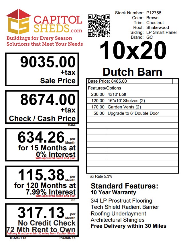 This 10×20 Dutch Barn offers classic barn styling with plenty of storage and functionality. The exterior is finished in rich Brown LP Smart Panel siding with Chestnut trim, topped by Shakewood architectural shingles over roof felt paper for durability. Built with 2×4 wall studs and rafters 16″ on center, LP Tech Shield roof sheeting, and LP T&G Prostruct flooring on pressure‑treated 2×4 joists 12″ on center, this barn is designed to last. Two windows and 6′ double doors provide light and easy access. Inside, you’ll find a 4×10 loft, 16″x10′ shelves, and garden vents for improved airflow.